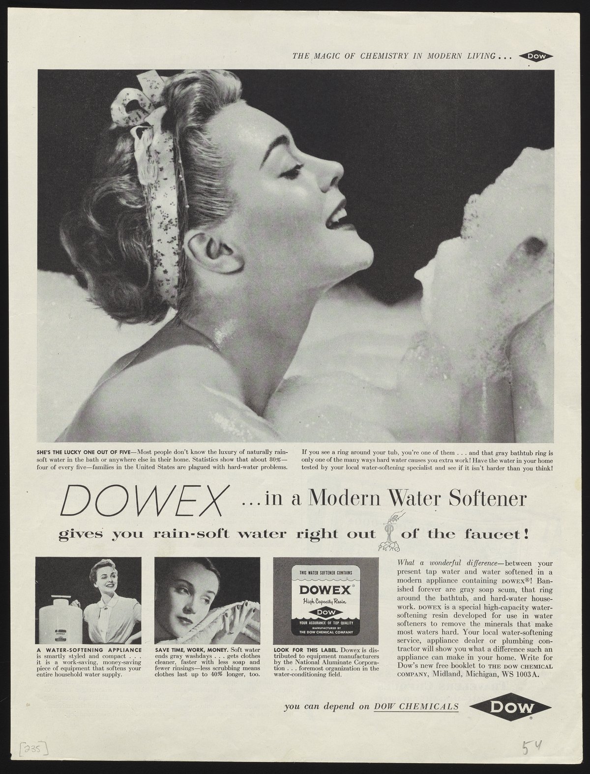 Dow Chemical Company. “DOWEX...in a Modern Water Softener Gives You Rain-Soft Water Right Out of the Faucet!,” 1954. Advertisements from the Dow Chemical Historical Collection, Box 7. Science History Institute. Philadelphia. https://digital.sciencehistory.org/works/r207tp934.