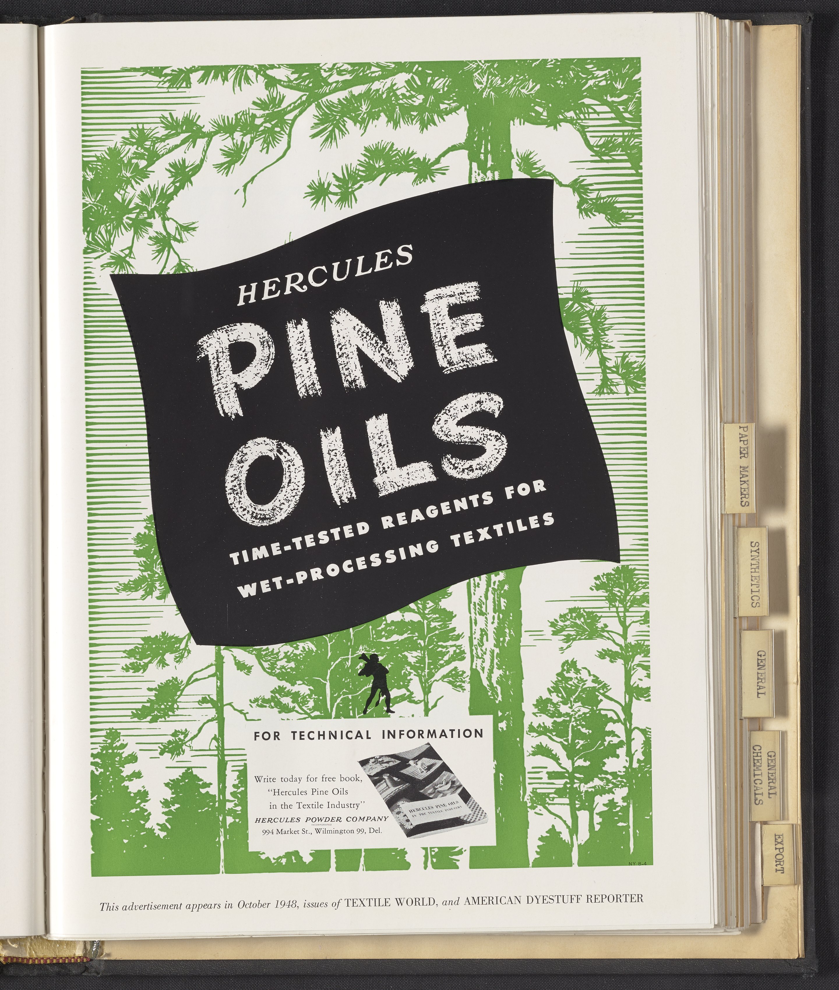 Hercules Incorporated. “Hercules Pine Oils: Time-Tested Reagents for Wet-Processing Textiles.” 1948 Hercules Advertisements, 1948. Records of Hercules Incorporated, Volume 1948. Science History Institute. Philadelphia. https://digital.sciencehistory.org/works/r207tp95p.