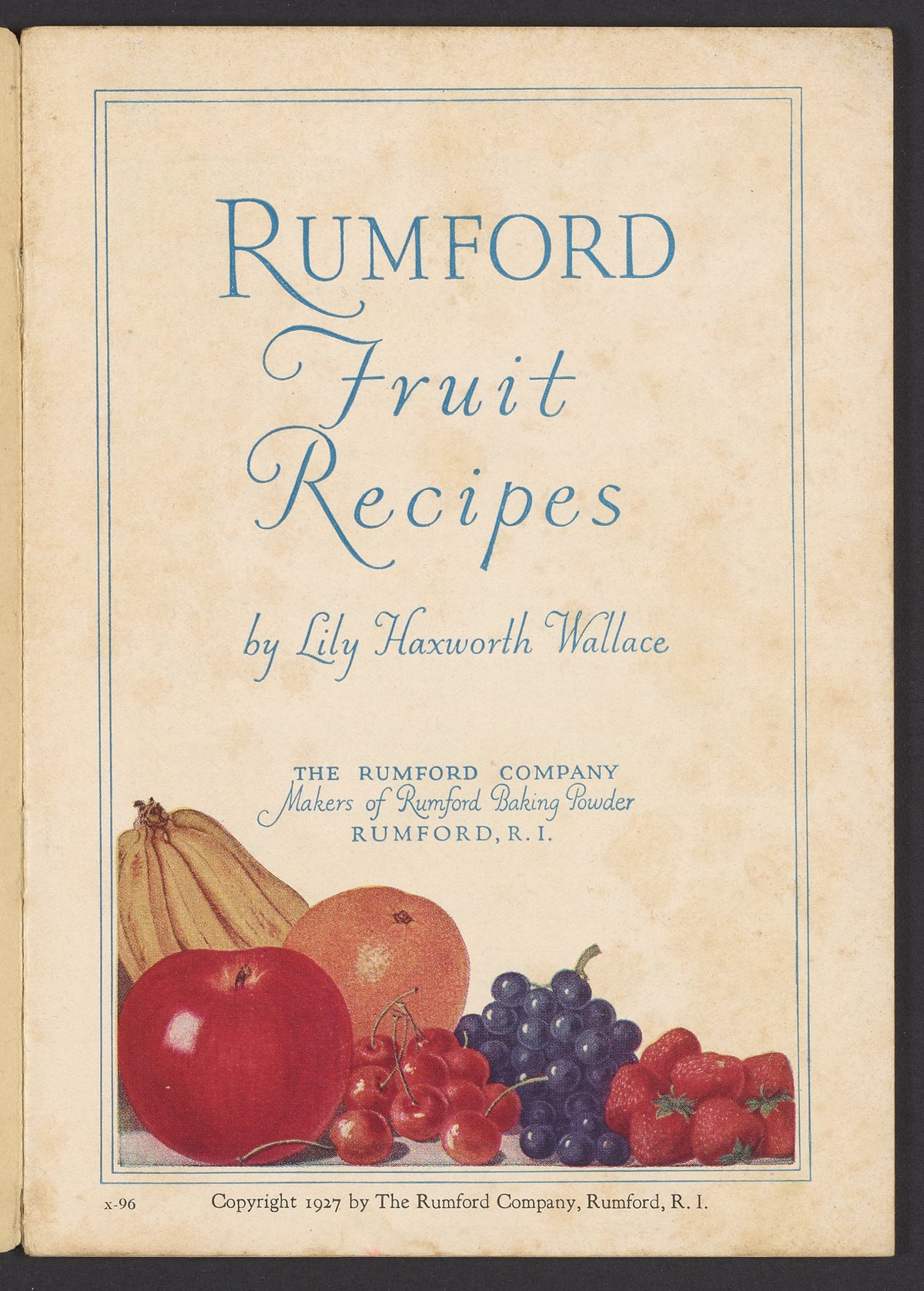 Wallace, Lily Haxworth. “Rumford Fruit Recipes.” Rumford, East Providence, Rhode Island: Rumford Company, 1927. TX811 .W35 1927. Science History Institute. Philadelphia. https://digital.sciencehistory.org/works/r3l6og1.