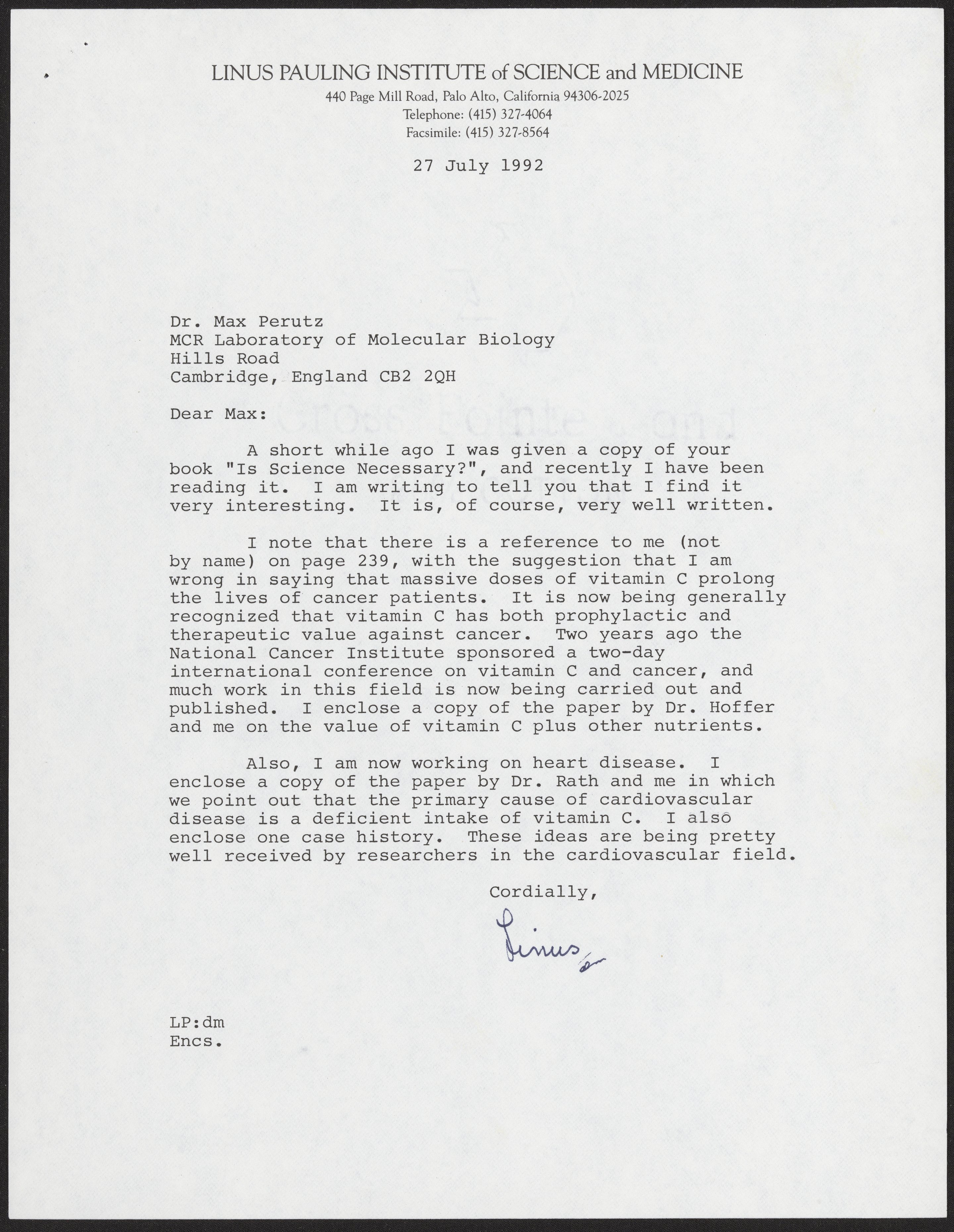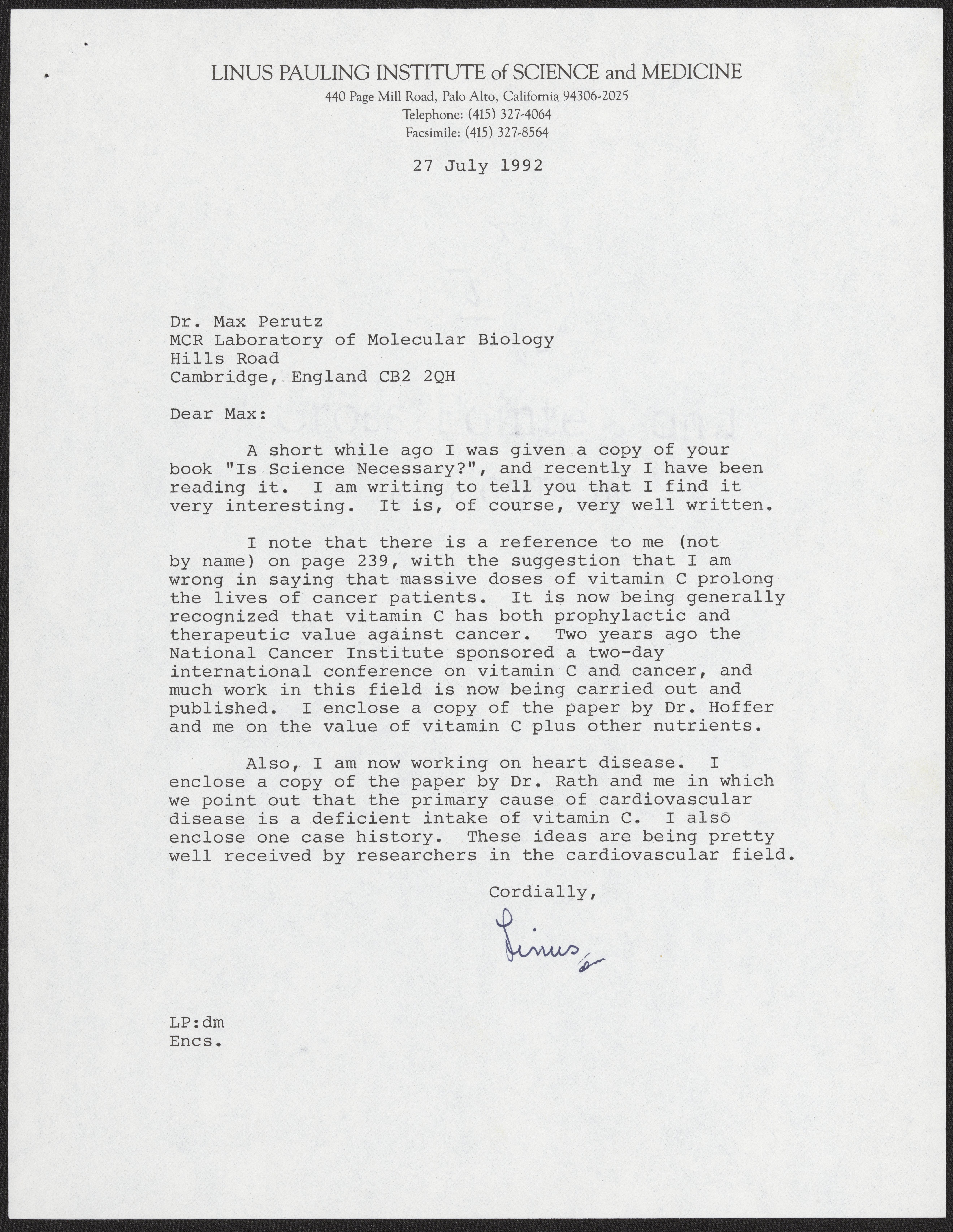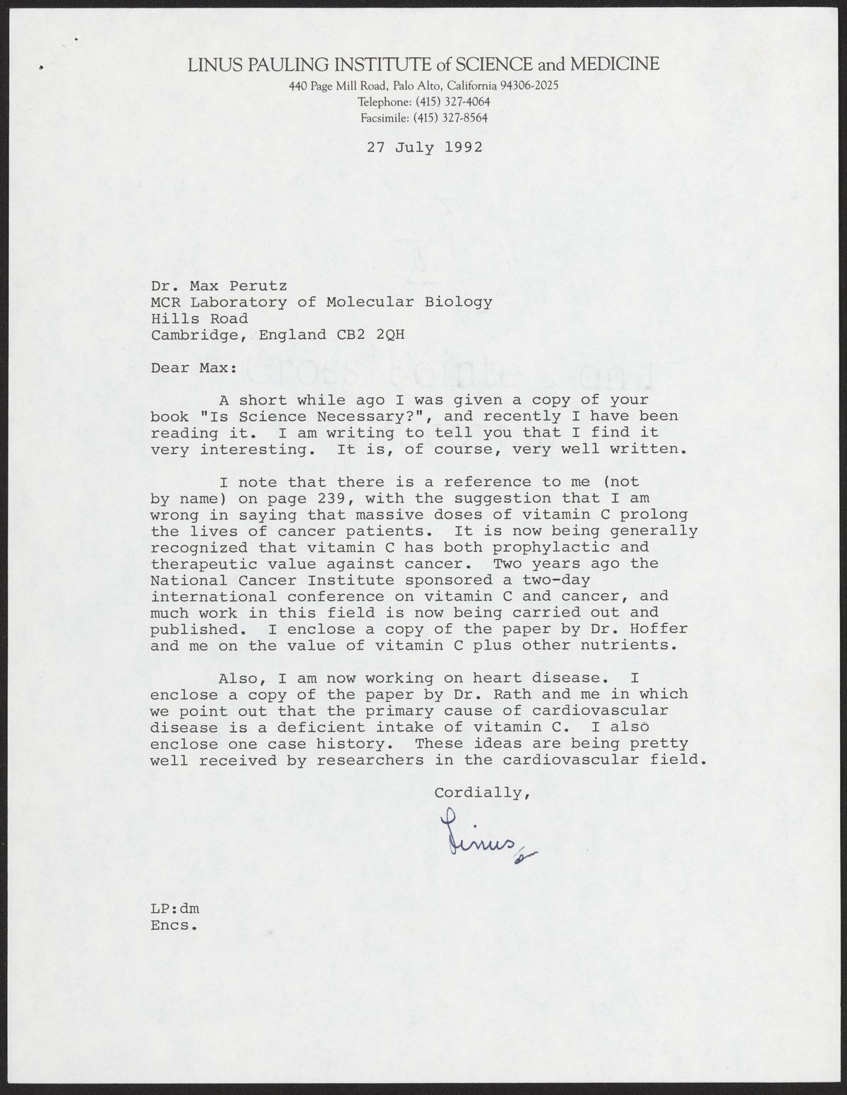 Letter from Linus Pauling to Max Perutz, July 27, 1992