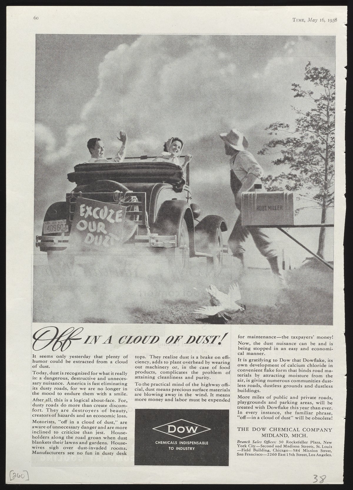 Dow Chemical Company. “Off in a Cloud of Dust!,” May 16, 1938. Advertisements from the Dow Chemical Historical Collection, Box 7. Science History Institute. Philadelphia. https://digital.sciencehistory.org/works/r494vm01t.