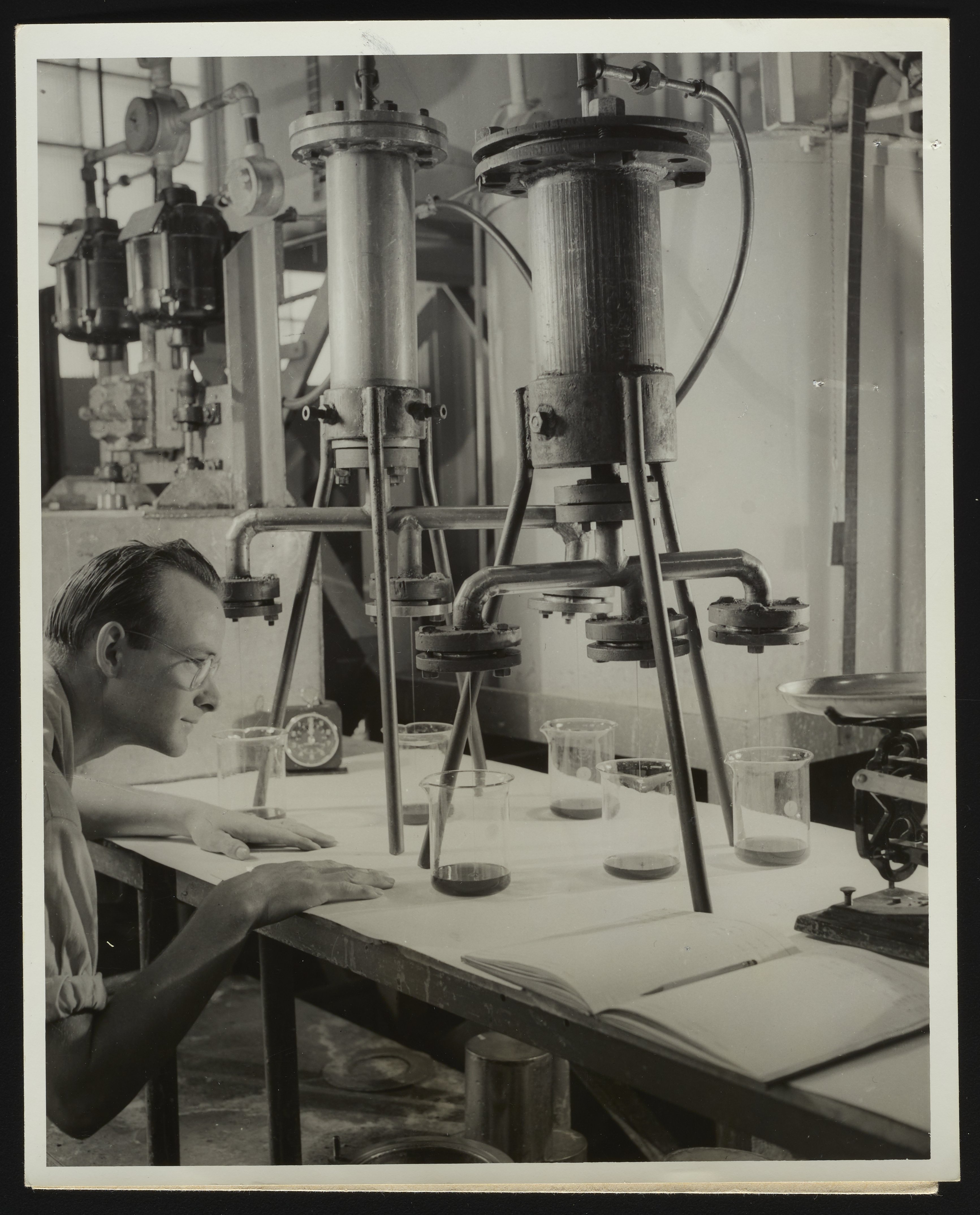 General view of laboratory operator Donald R. Stevens checking the filtration characteristics of viscose solutions produced in the Cellulose Department at the Hercules Powder Company plant located in Hopewell, Virginia. Per notations accompanying the photograph, the test depicted here was one of a series of control tests applied to so-called "chemical cotton," i.e. purified cellulose obtained from raw cotton linters, manufactured at the plant.