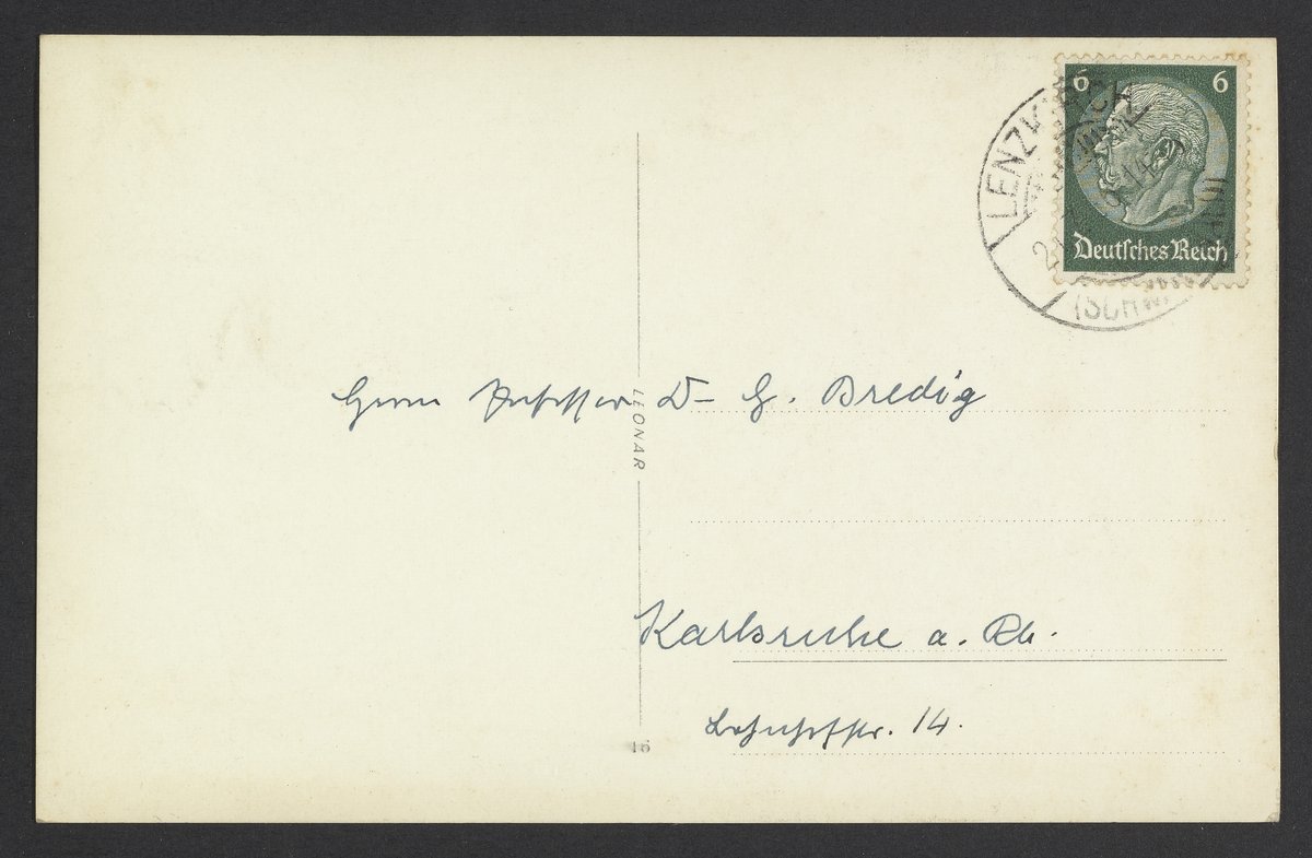 Stock, Alfred. “Postcard to Georg Bredig from Alfred Stock, July 1936,” July 20, 1936. Papers of Georg and Max Bredig, Box 22. Science History Institute. Philadelphia. https://digital.sciencehistory.org/works/r5p51ni.