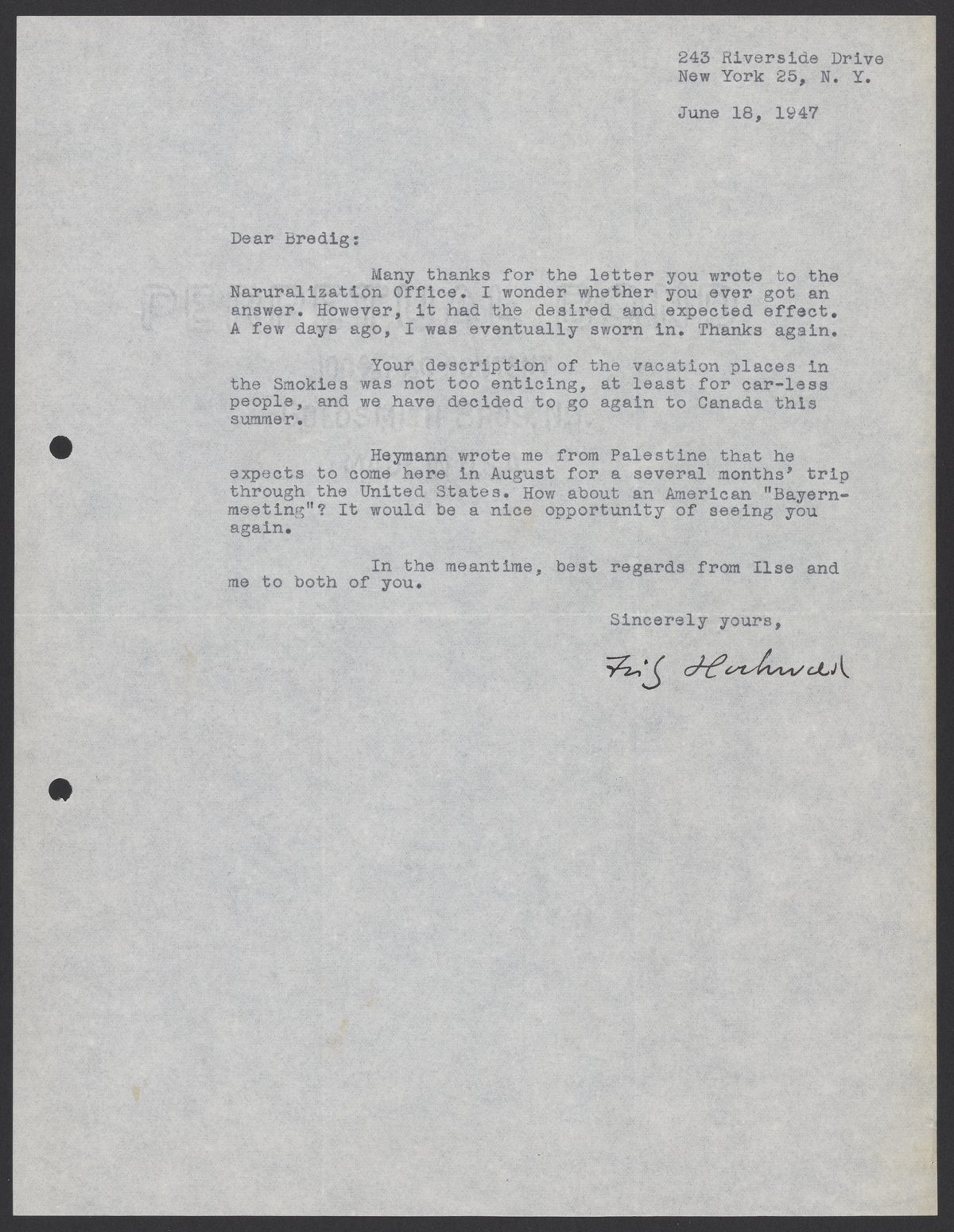 Letter from Fritz Hochwald to Max Bredig, June 18, 1947