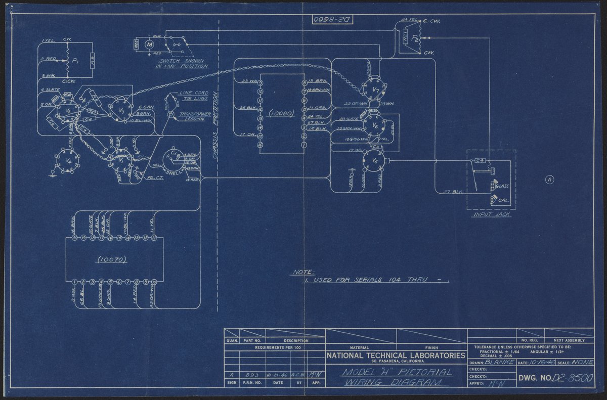 Beckman Instruments, Inc. “Beckman Model H PH Meter Pictorial Wiring Diagram,” October 16, 1946. Beckman Historical Collection, Box 18, Folder 24. Science History Institute. Philadelphia. https://digital.sciencehistory.org/works/r781wg024.