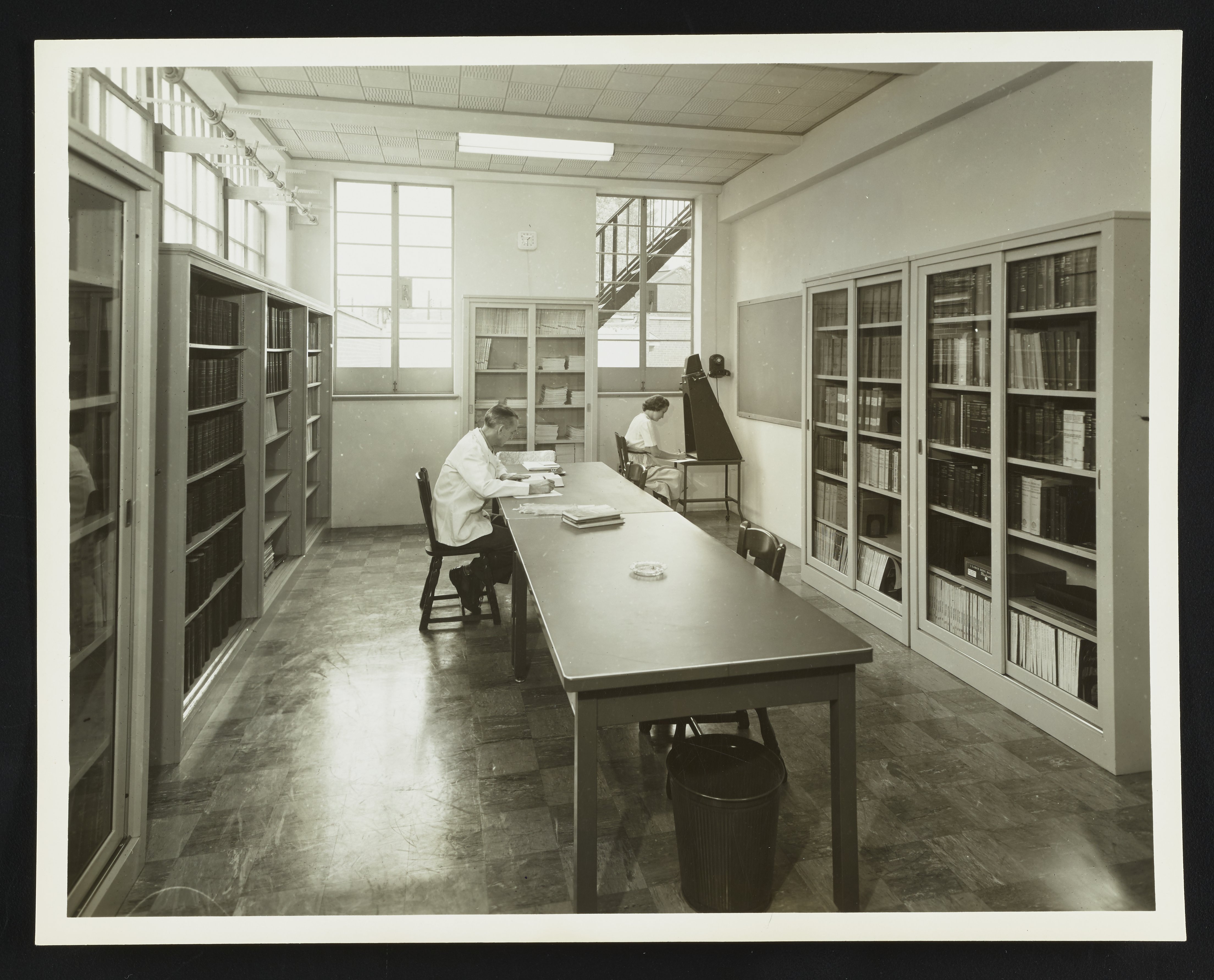 General view of the library at the Althouse Chemical Company Research facility in Reading, Pennsylvania. The two employees visible in the photograph are identified as George Garcelon and Norma Bodey.