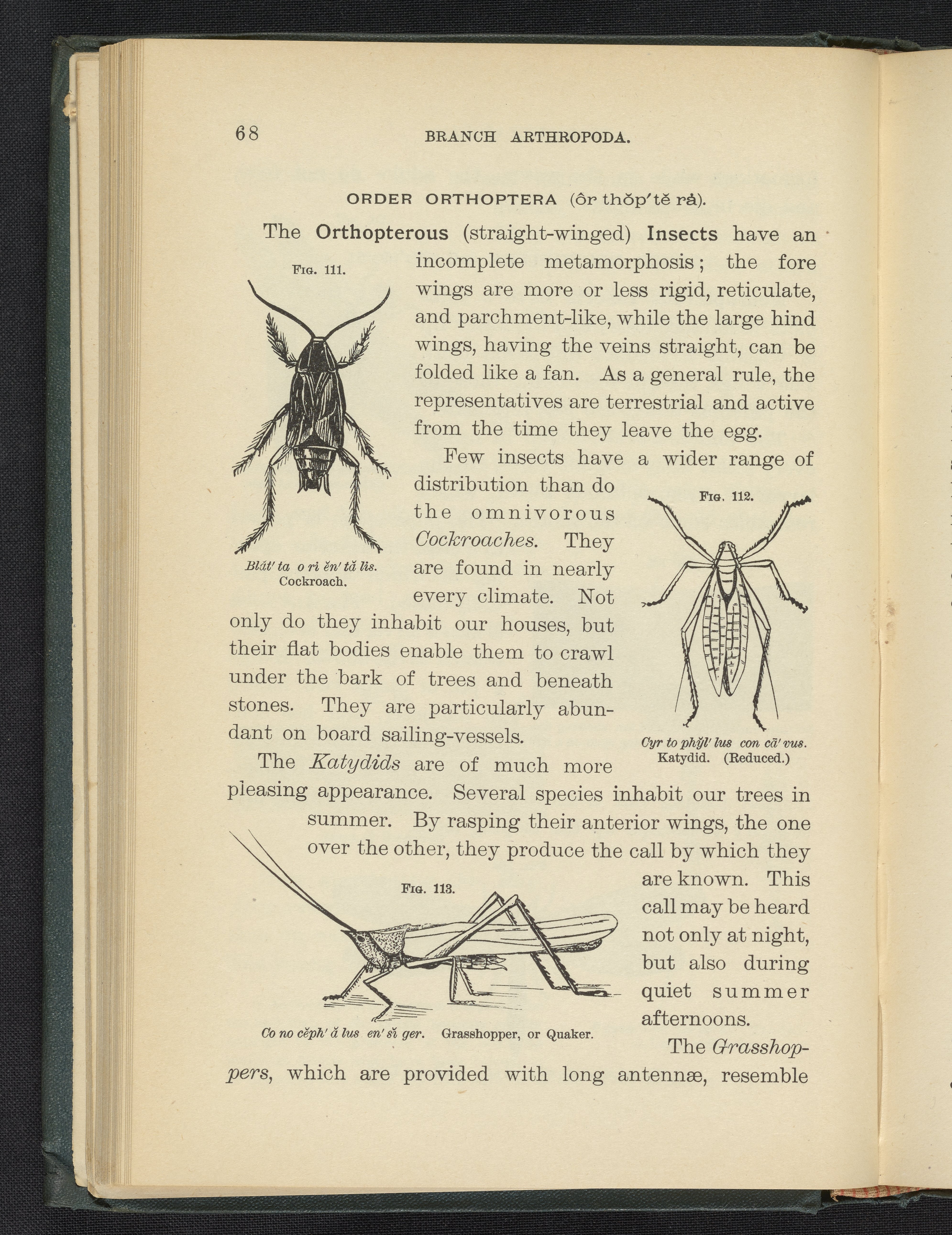 Figure 111. Cockroach. Figure 112. Katydid (Reduced). Figure 113. Grasshopper, or Quaker