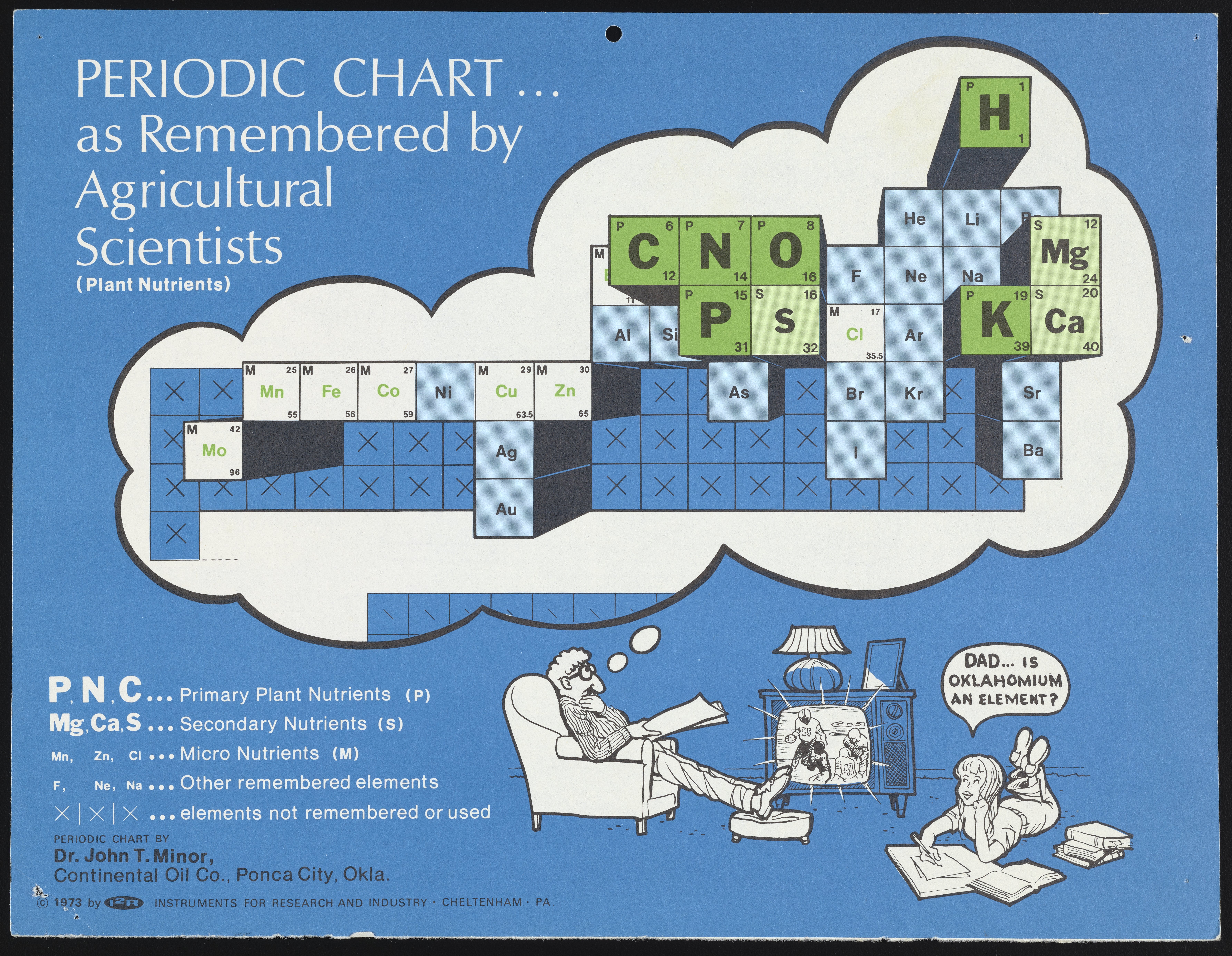 Minor, John T. “Periodic Chart... as Remembered by Agricultural Scientists.” Cheltenham (Township), Pennsylvania: Instruments for Research and Industry, 1973. Periodic Tables Collection, Box FC-5, Folder Periodic Tables (Assorted). Science History Institute. Philadelphia. https://digital.sciencehistory.org/works/rb68xc99r.
