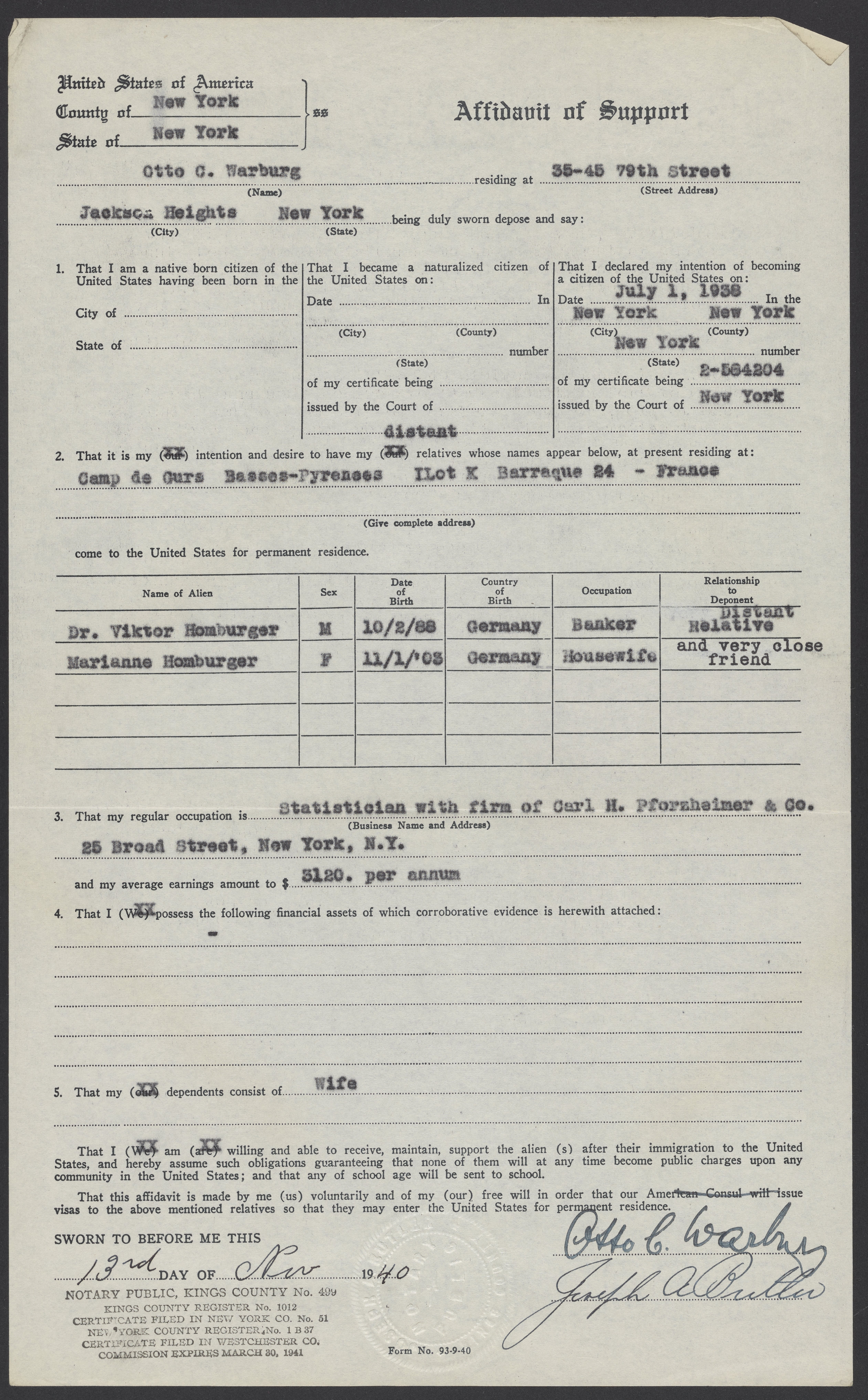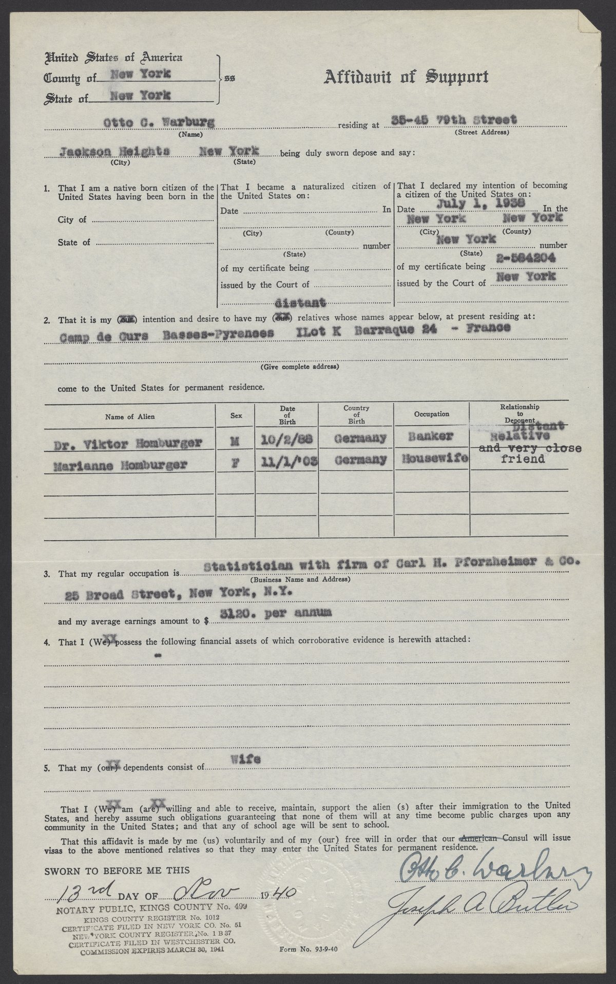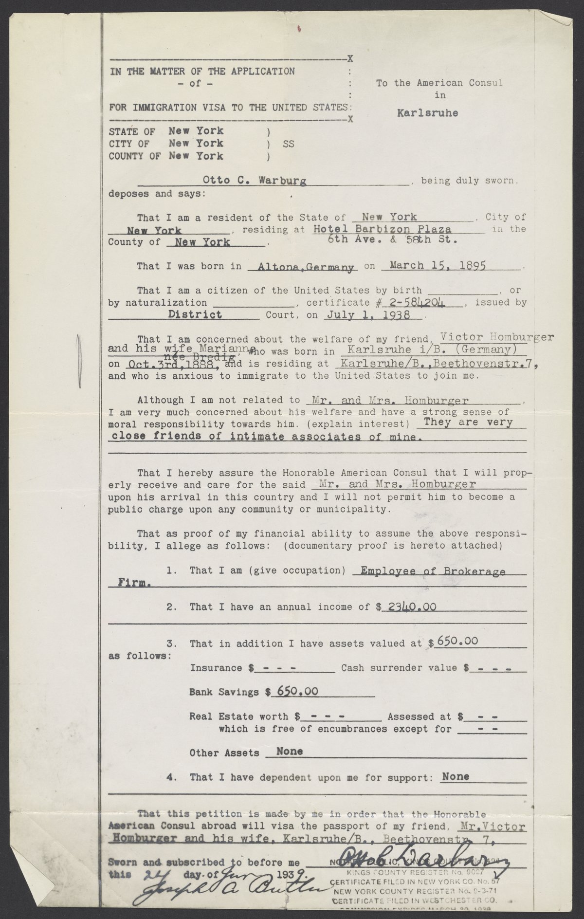 Affidavits of Support from Otto C. Warburg for Victor and Marianne Homburger