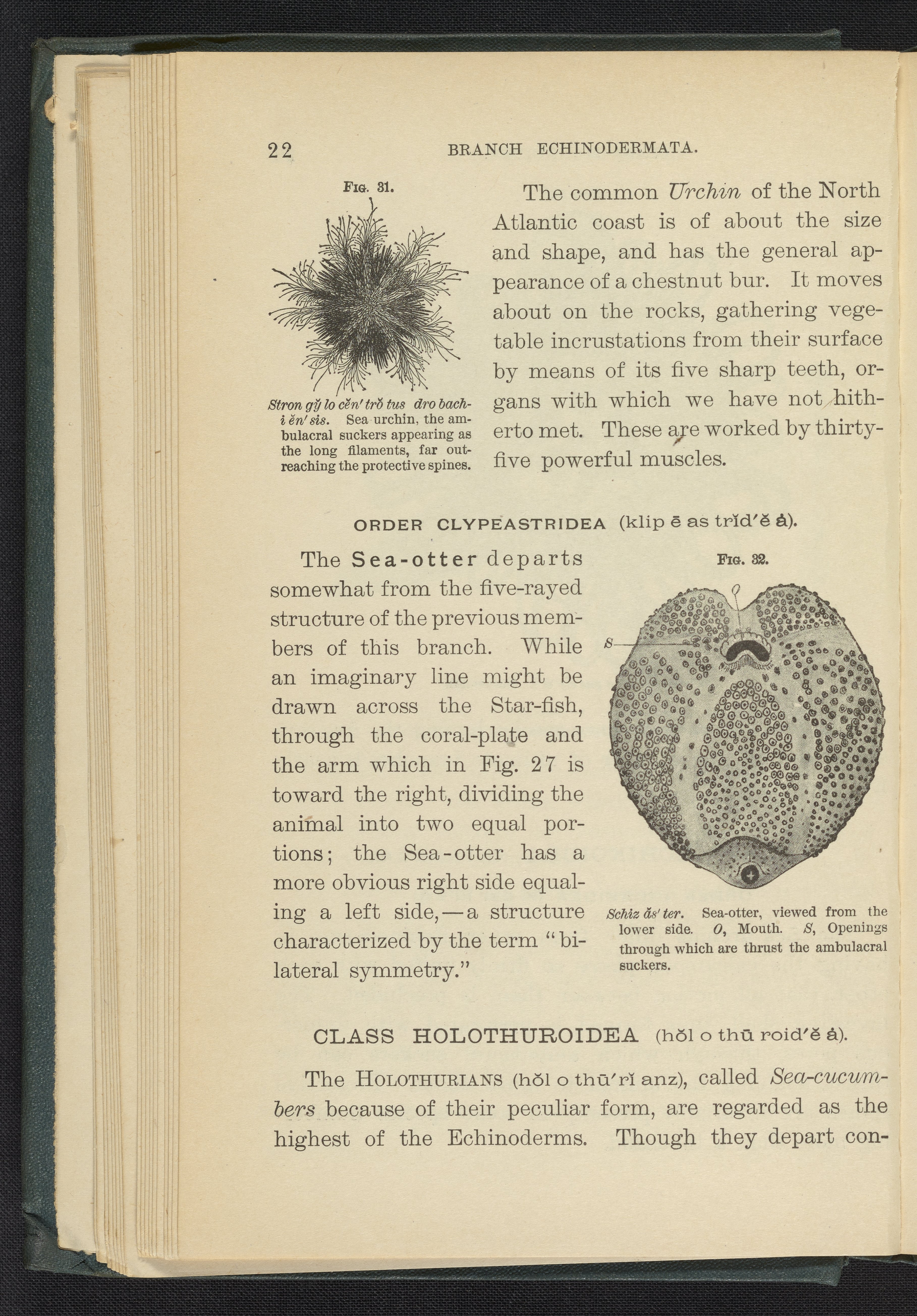 Figures 31 and 32 of the 1887 volume Popular Zoology. Figure 31 depicts a sea urchin. Figure 32 depicts a sea-otter, viewed from the lower side.