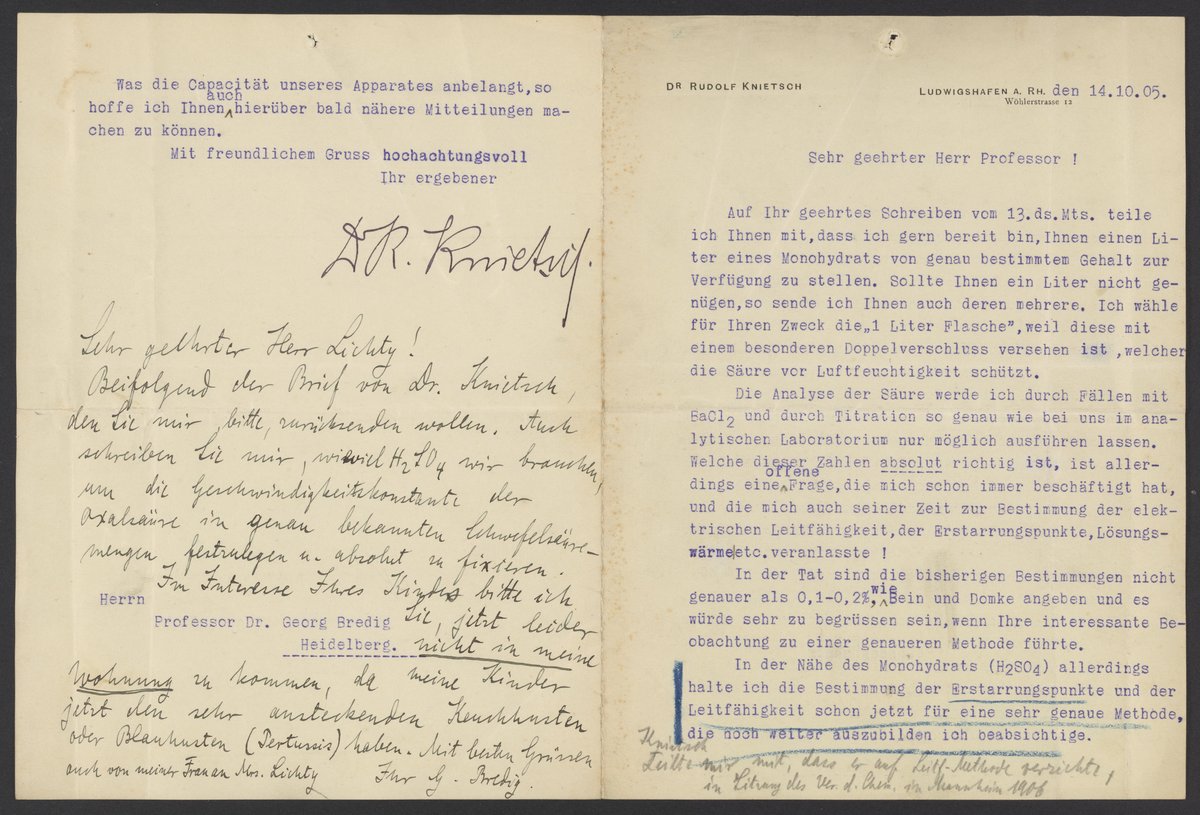 Rudolf Knietsch (1854-1906), a German chemist, informs Georg Bredig (1868-1944) that he will send him one liter of a sulfuric acid monohydrate for an experiment. Bredig forwards the letter to another colleague, Mr. Sichty, and includes a personal note to him on the second page.