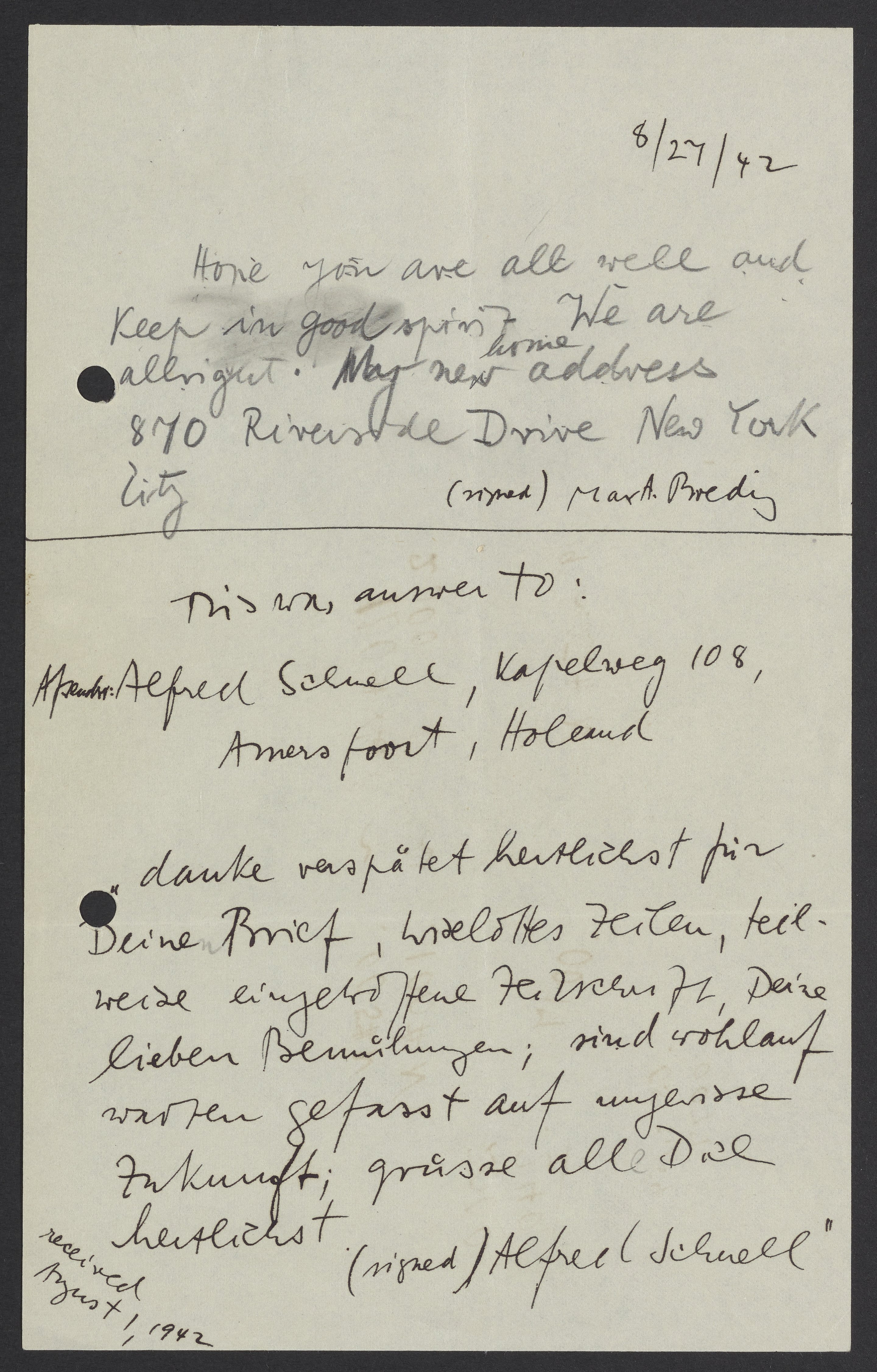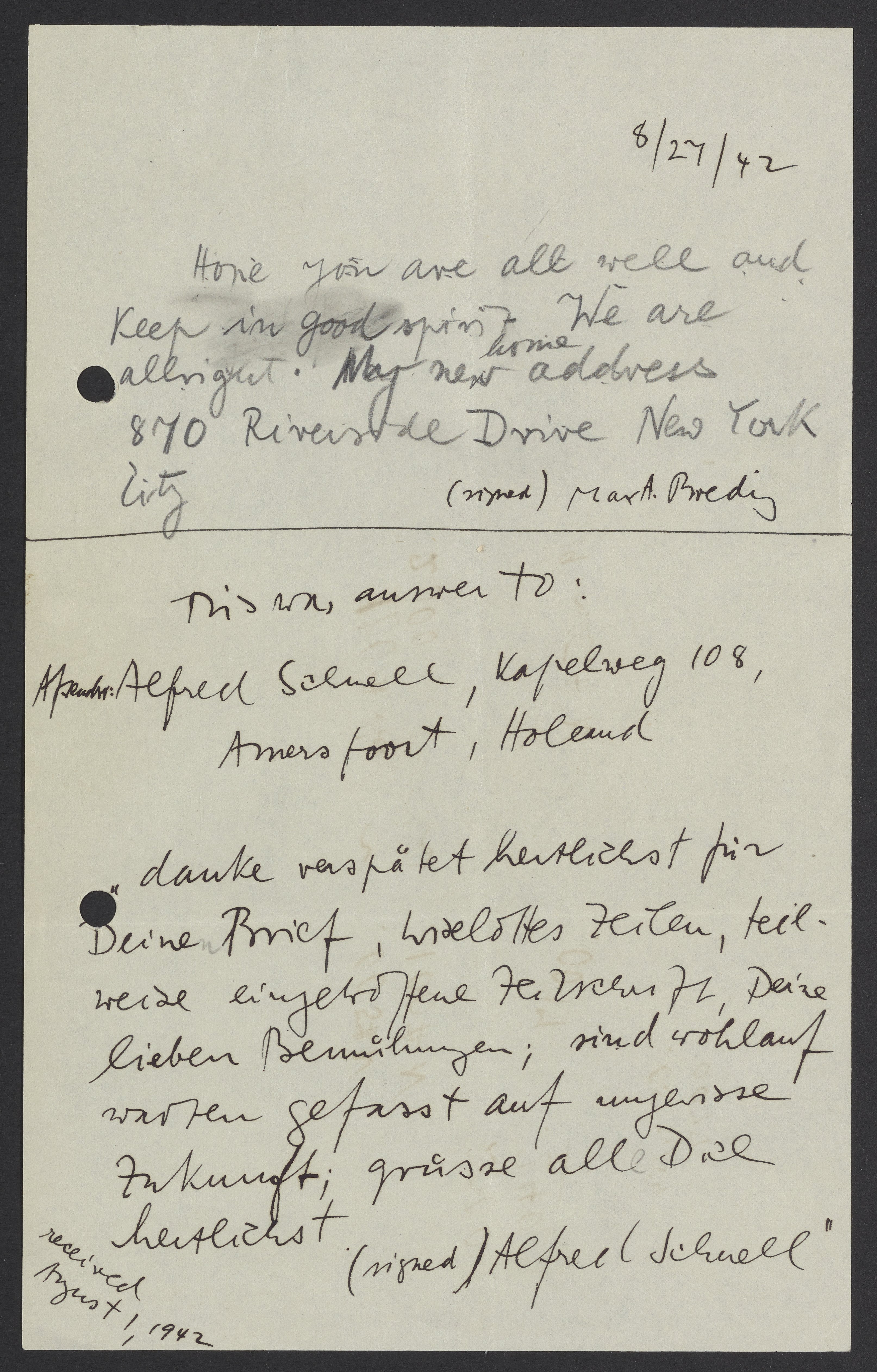 Correspondence between Max Bredig and Alfred Schnell, August 27, 1942