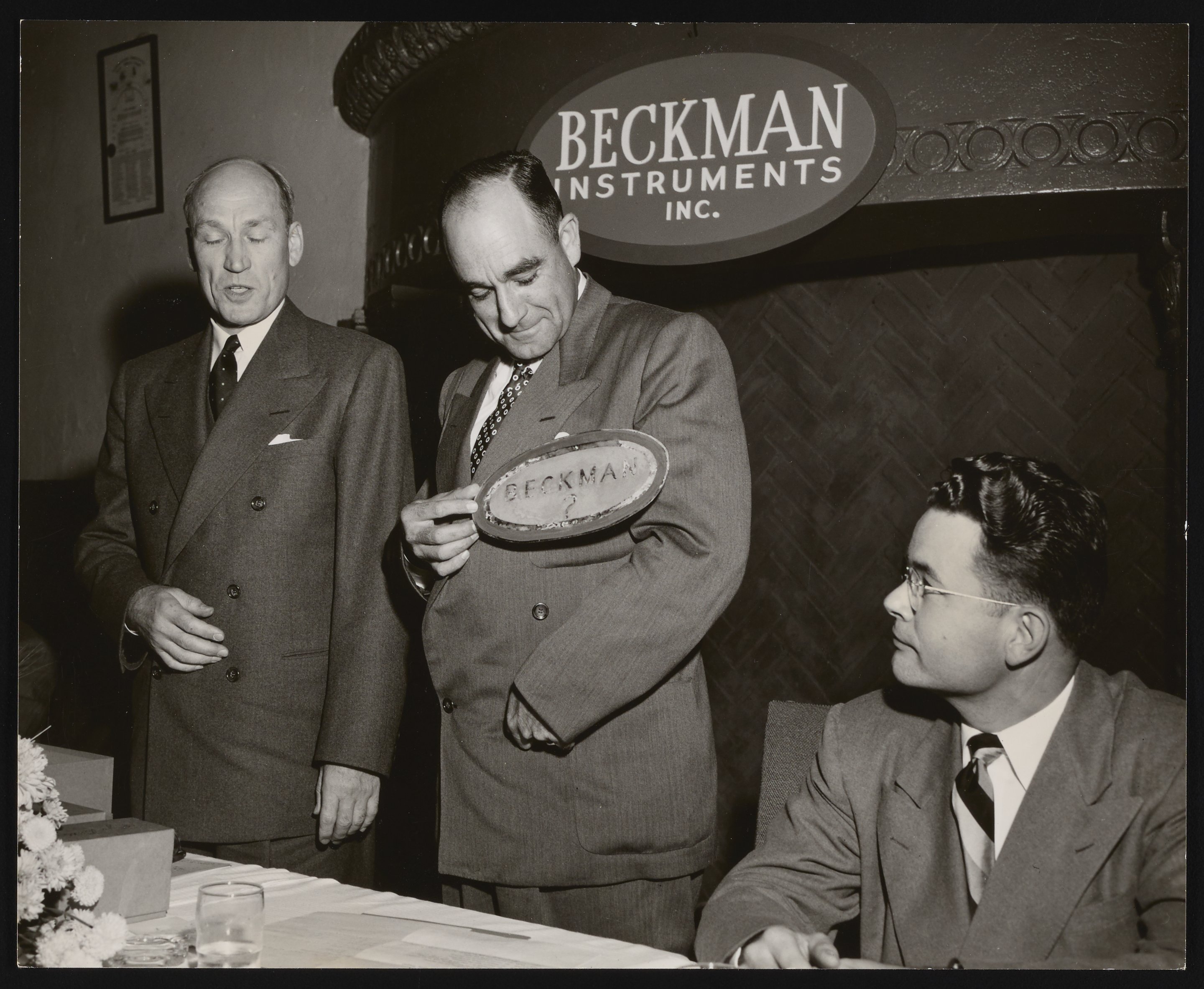 Arnold O. Beckman and unidentified men at a Beckman Instruments function