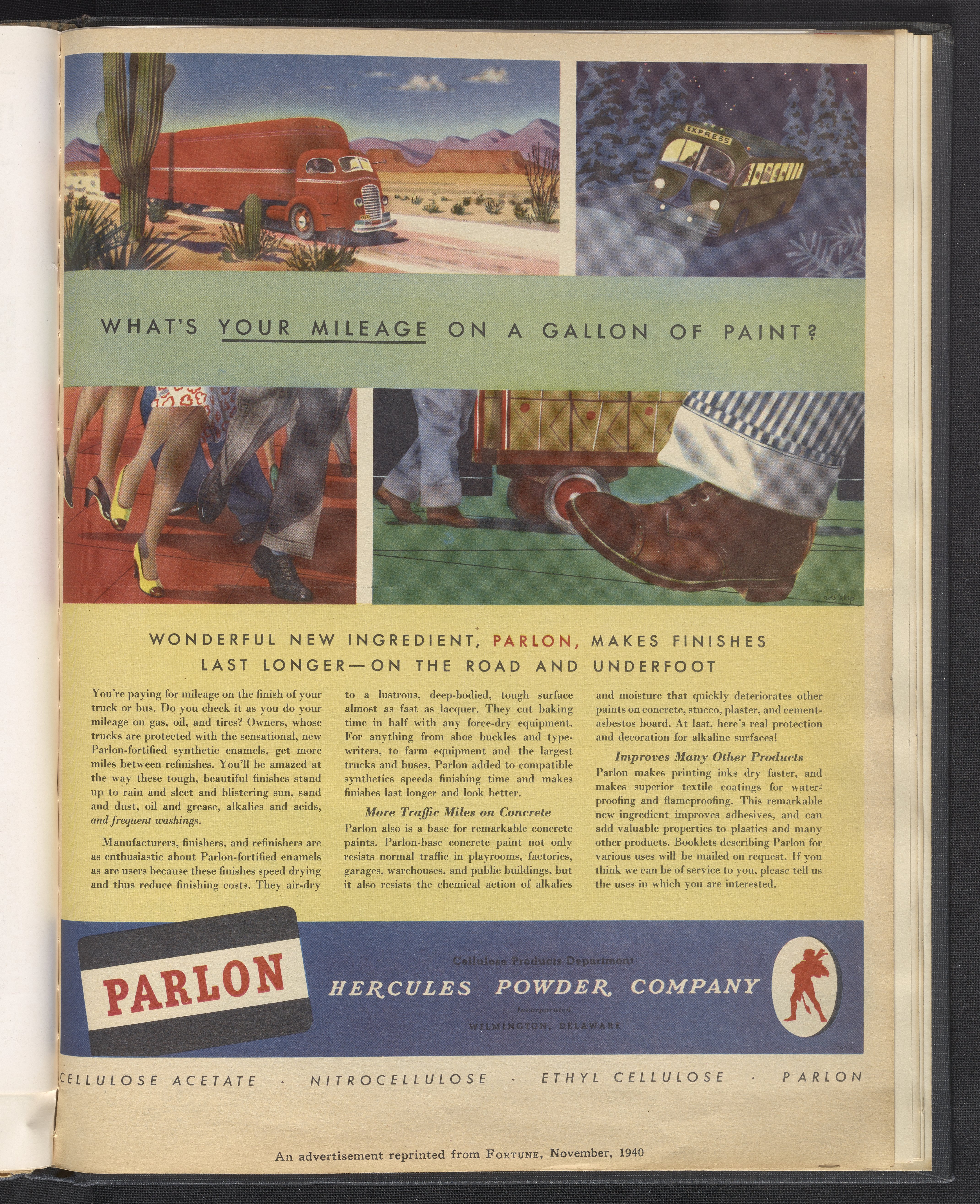 Advertisement for Parlon, a chlorinated rubber manufactured and sold by the Hercules Powder Company for use as a base ingredient in synthetic enamels, as well as paint finishes, printing inks, textile coatings, and adhesives. The advertisement features artistic renderings of a variety of synthetic surfaces made more durable, glossy, and weather-resistant by the addition of Parlon, including roadways and flooring. This advertisement appeared in the November 1940 edition of Fortune magazine.