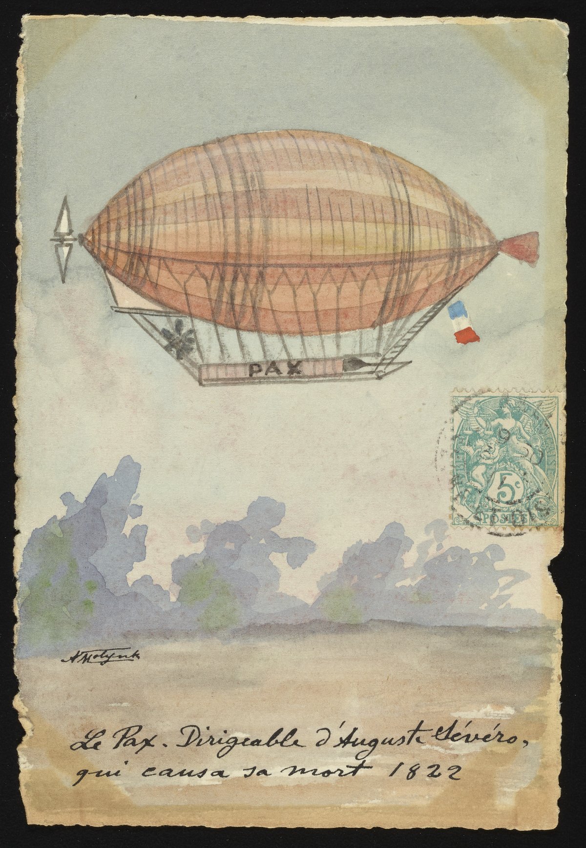 Molynk, A. “Le Pax Dirigeable d’Auguste Sévéro, Qui Causa Sa Mort.” Watercolor (paint), 1902–1909. Donald F. Othmer Papers, Box 287. Science History Institute. Philadelphia. https://digital.sciencehistory.org/works/rj4305541.