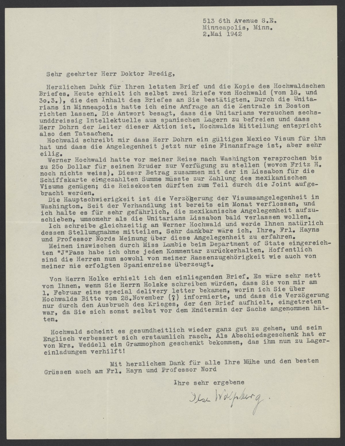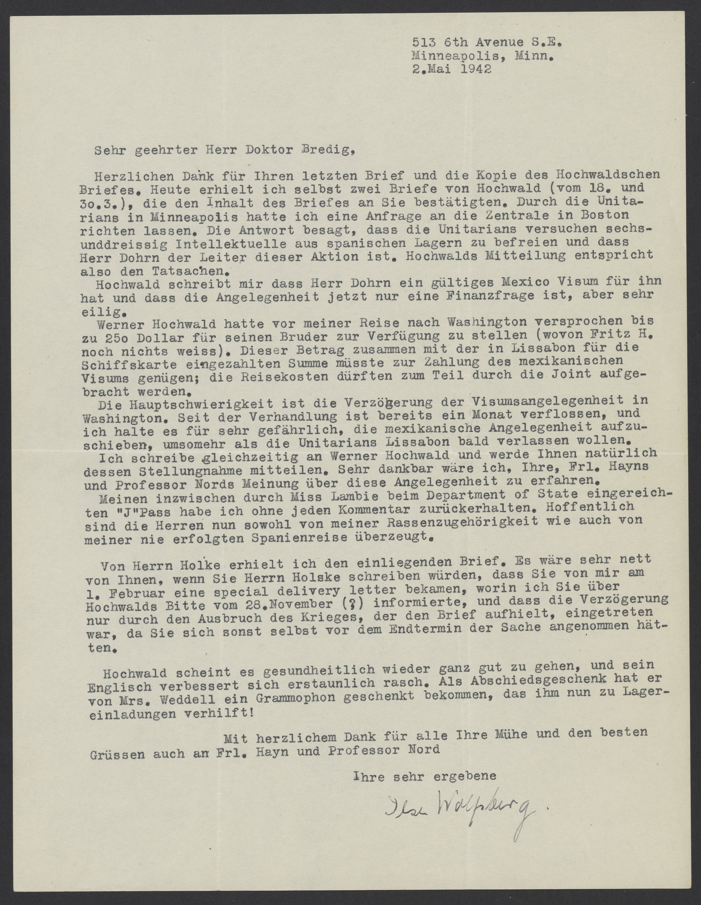 Herzlichen Dank für Ihren letzten Brief und die Kopie des Hochwaldschen Briefes. Heute erhielt ich selbst zwei Briefe von Hochwald (vom 18. And 30.3), die den Inhalt an Sie bestätigen. Durch die Unitarians in Minneapolis hatte ich eine Anfrage an die Zentrale in Boston richten lassen. Die Antwort besagt, dass die Unitarians versuchen sechsunddreissig Intellektuelle aus spanischen Lagern zu befreien und dass Herr Dohrn der Leiter der Aktion ist. Hochwalds Mitteilung entspricht also den Tatsachen.