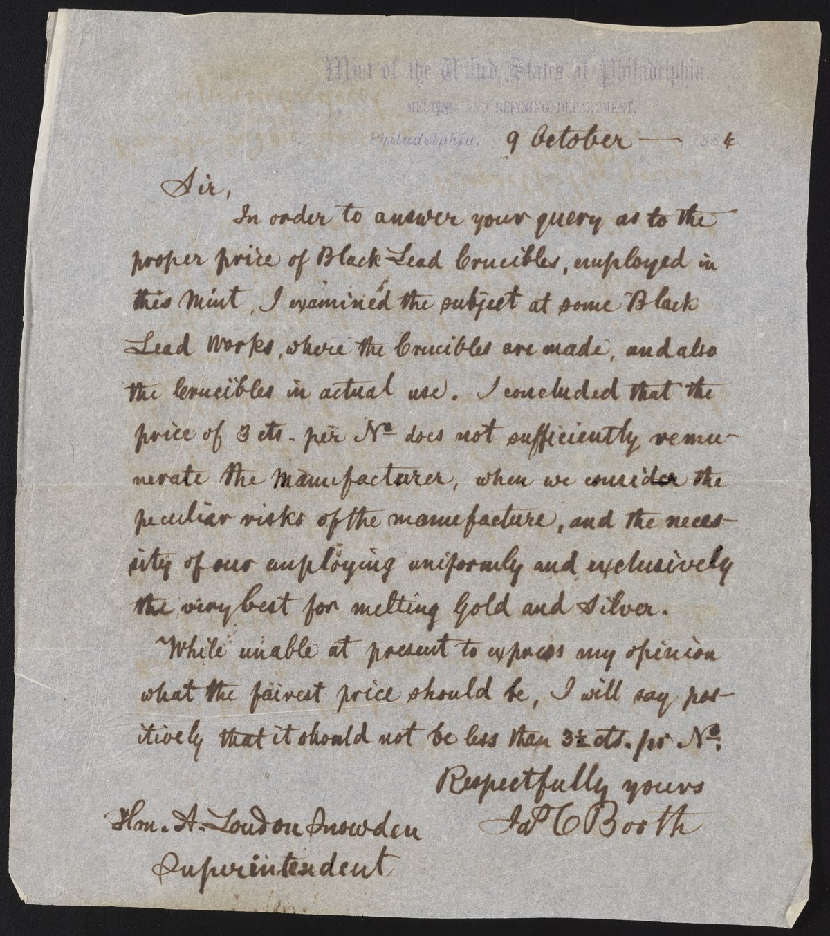 Letter from James Curtis Booth to A. L. Snowden, October 9, 1884