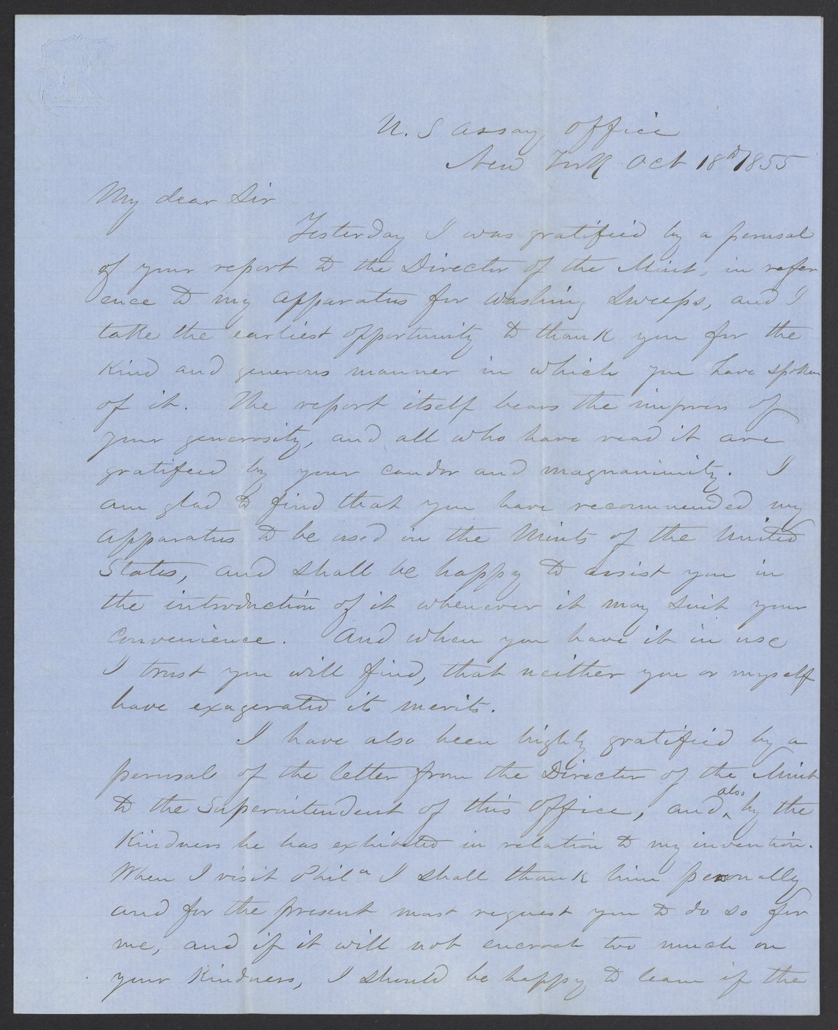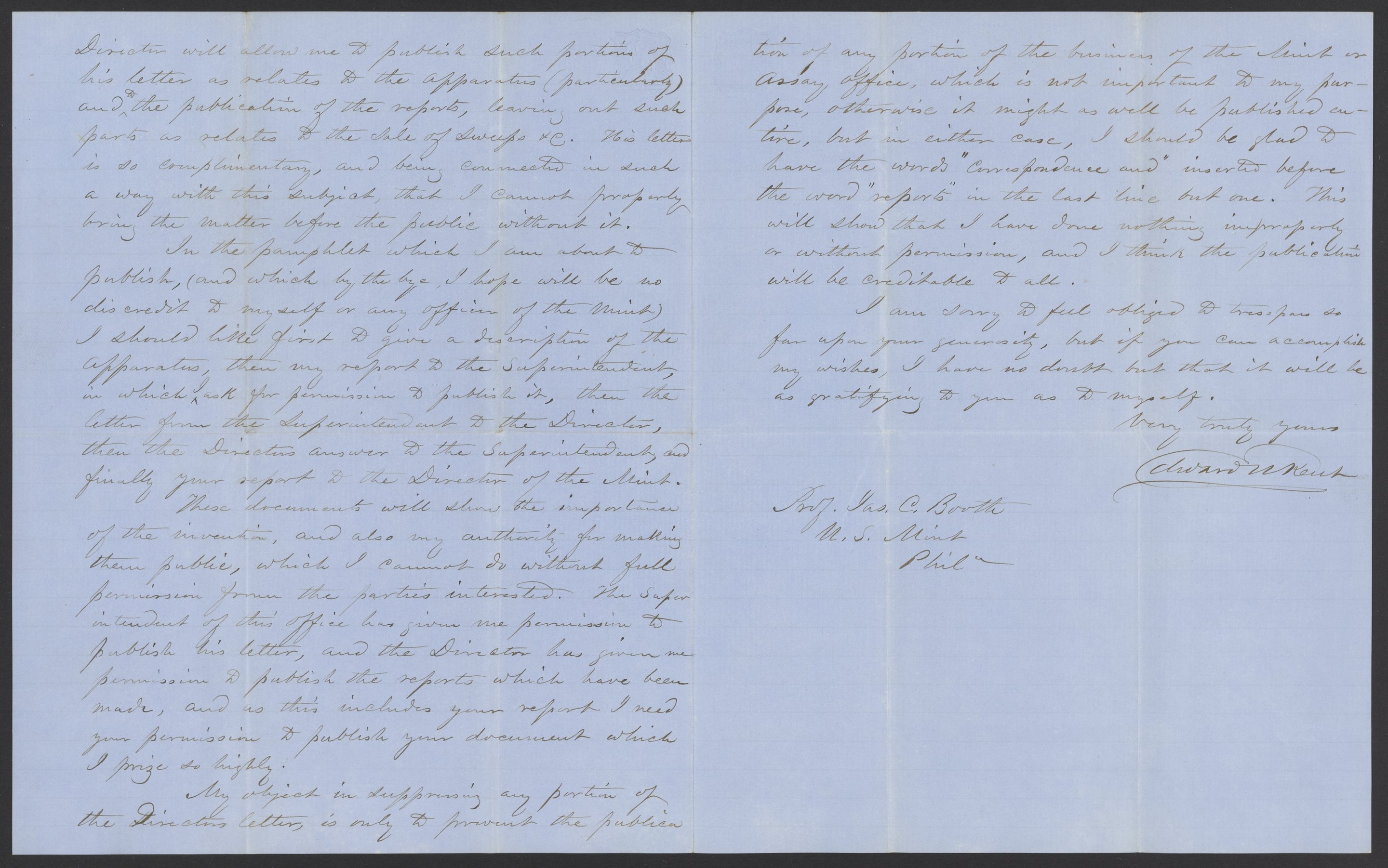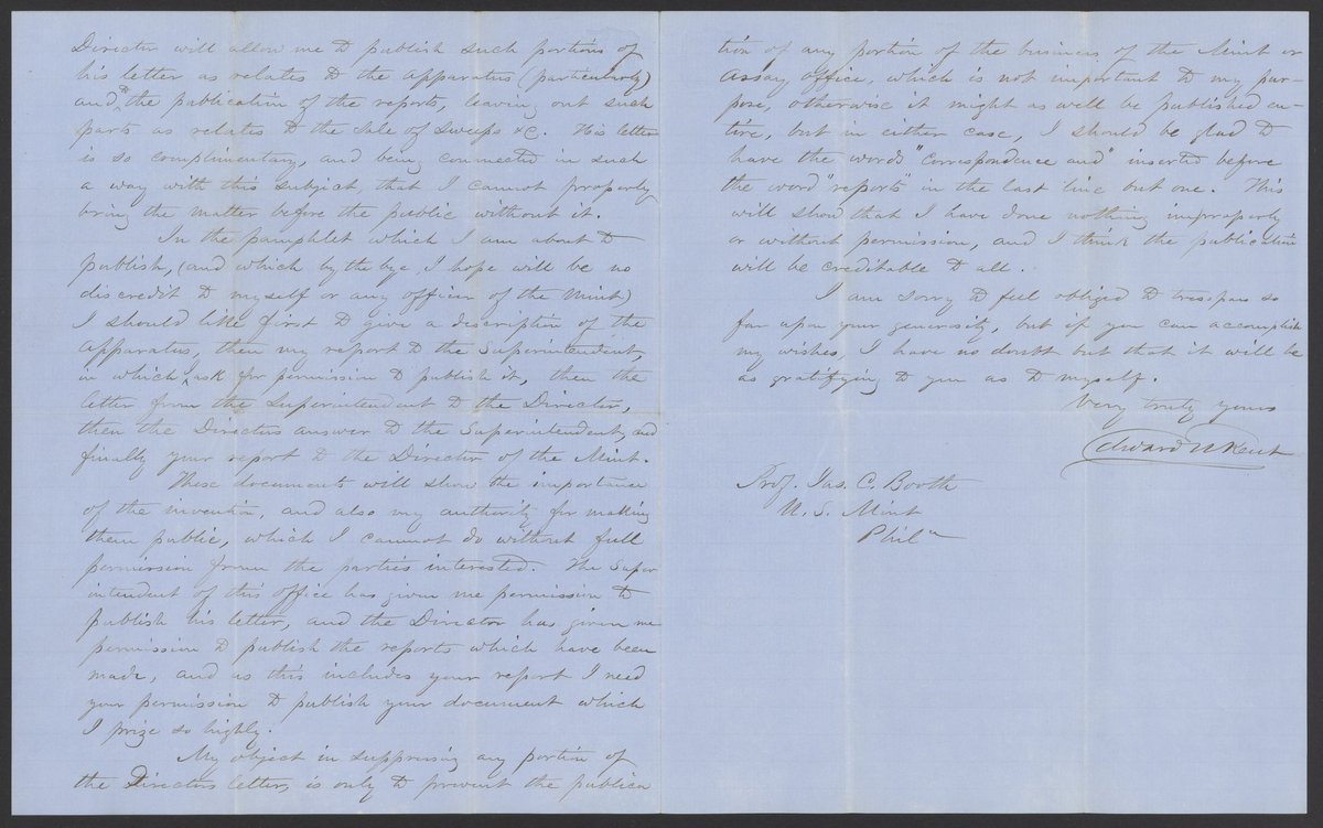 Small JPG1200 x 1475px — 265 KBLarge JPG2880 x 3541px — 1.2 MBFull-sized JPG3285 x 4039px — 1.5 MBOriginal fileTIFF — 3285 x 4039px — 38.0 MBEdward N. Kent of the United States Assay Office at New York writes to thank James Curtis Booth (1810-1888) for his kind words regarding Kent's sweeps washing apparatus.