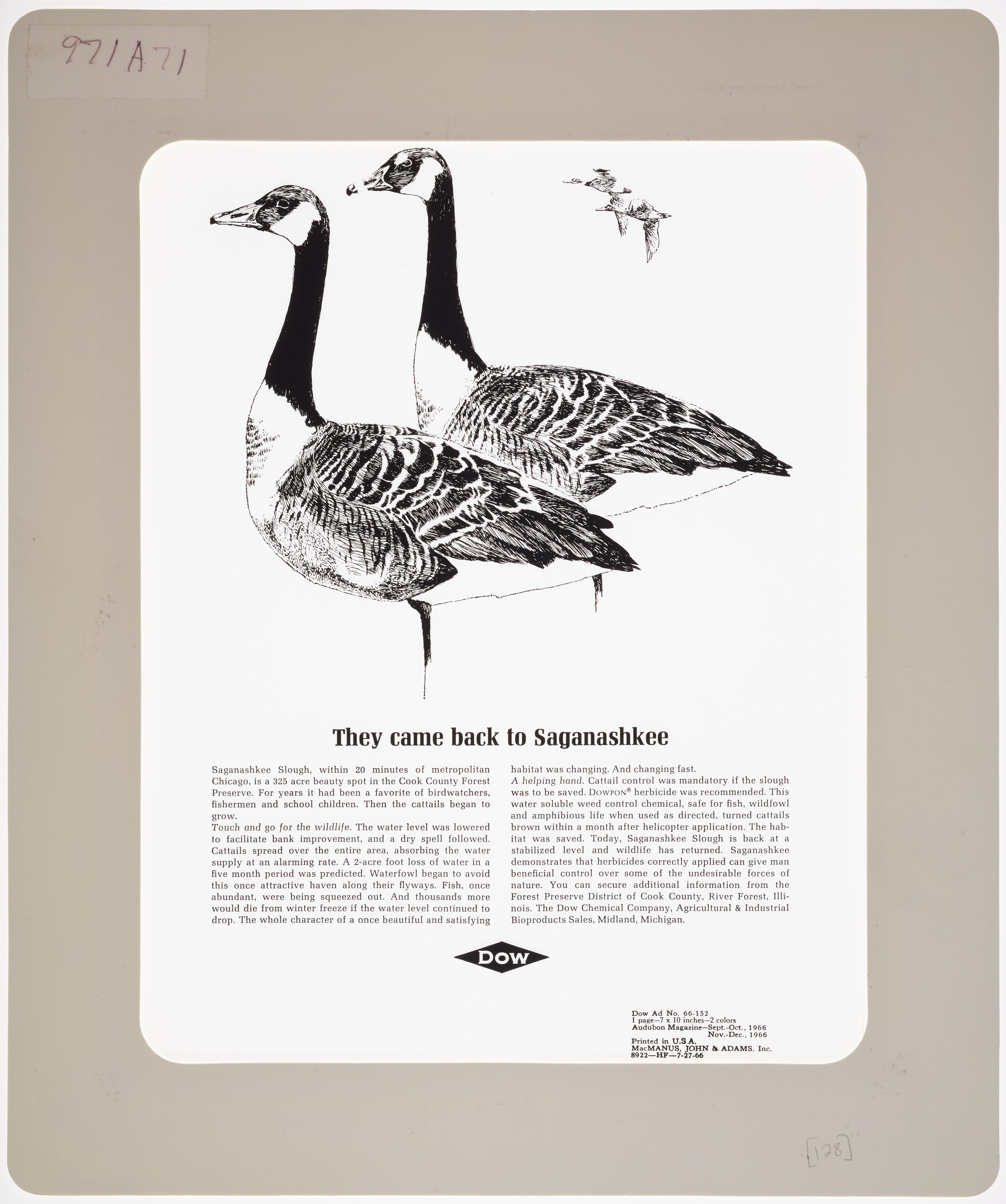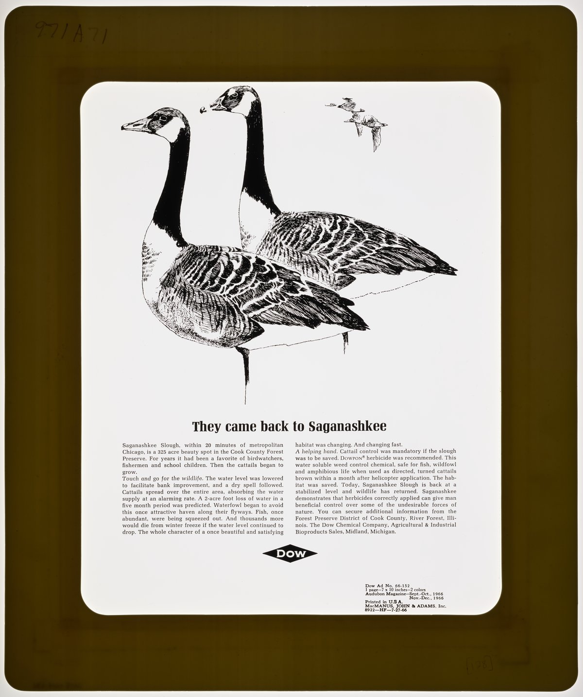 Transparency copy of a print advertisement for Dowpon, a herbicide marketed and sold by the Dow Chemical Company. The advertisement features an illustration of several waterfowl, with accompanying text detailing the impact of weeds like cattail on the Saganashkee Slough near Chicago. The text goes on to extol the benefits of Dowpon for weed control and its successful application to restore the natural environment of the slough.