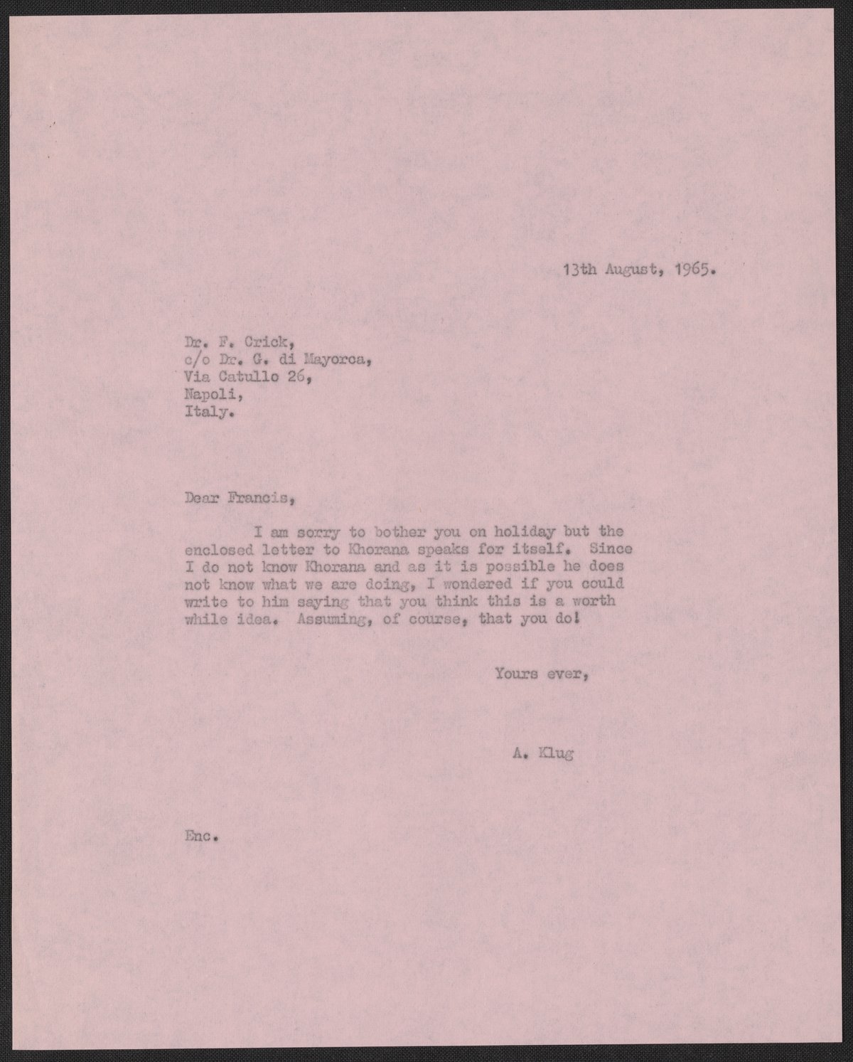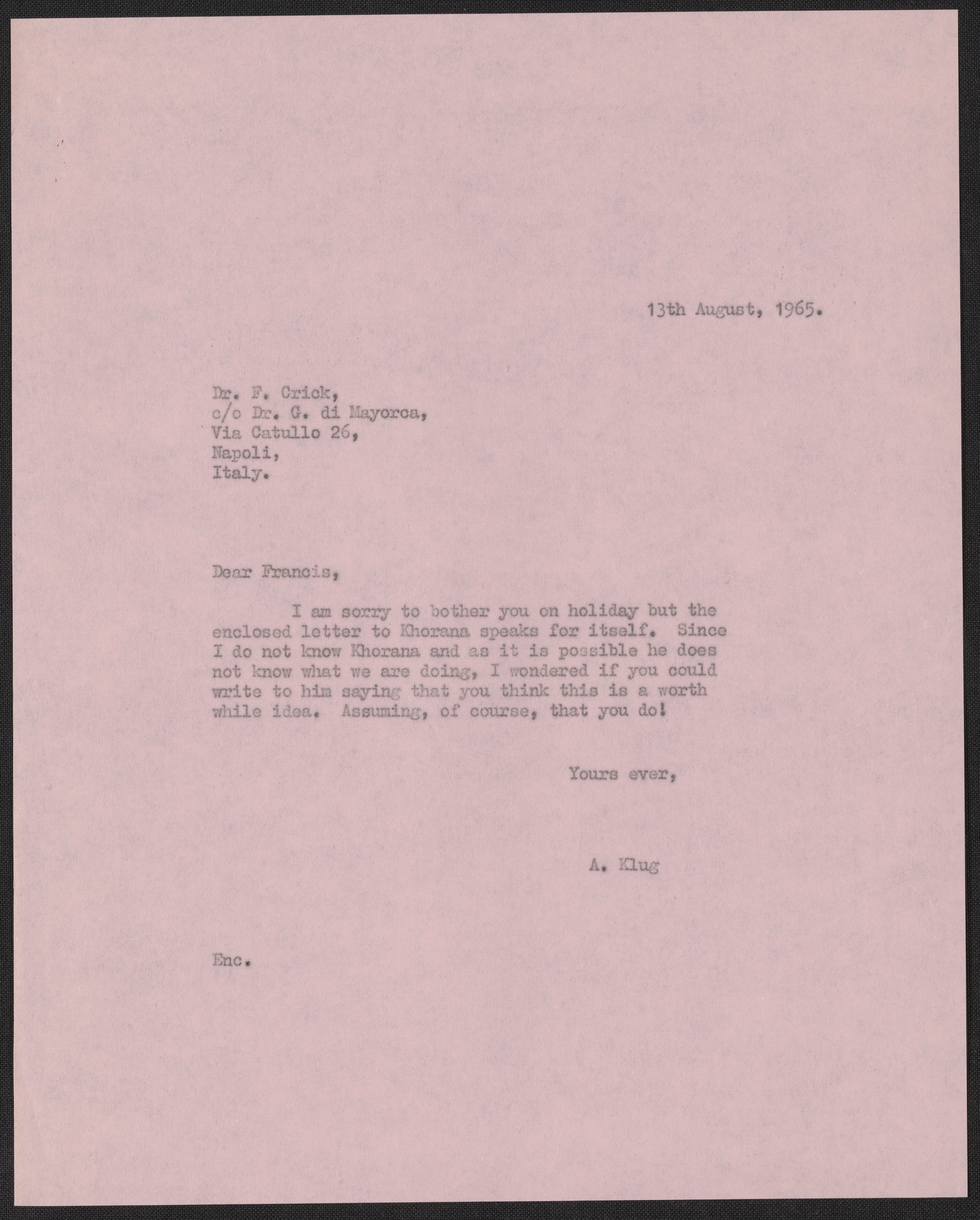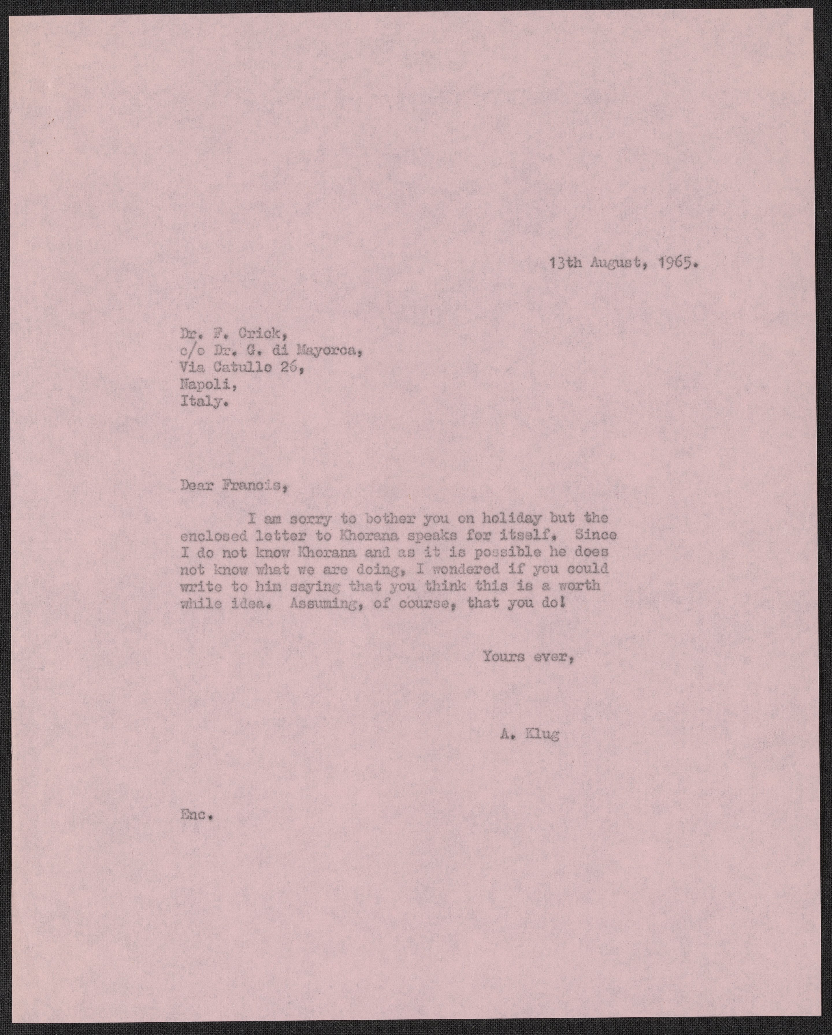 Klug, A. (Aaron), Sir. “Letter from Aaron Klug to Francis Crick, August 13, 1965,” August 13, 1965. History of Molecular Biology Collection, Box 19, Folder 22. Science History Institute. Philadelphia. https://digital.sciencehistory.org/works/rn3hqkw.
