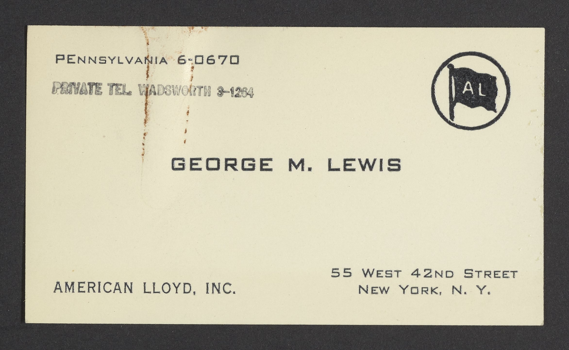 American Lloyd, Inc. “Business Card of George M. Lewis and Form from the American Lloyd, Inc.,” n.d. Papers of Georg and Max Bredig, Box 10, Folder 30. Science History Institute. Philadelphia. https://digital.sciencehistory.org/works/rnp2jo3.