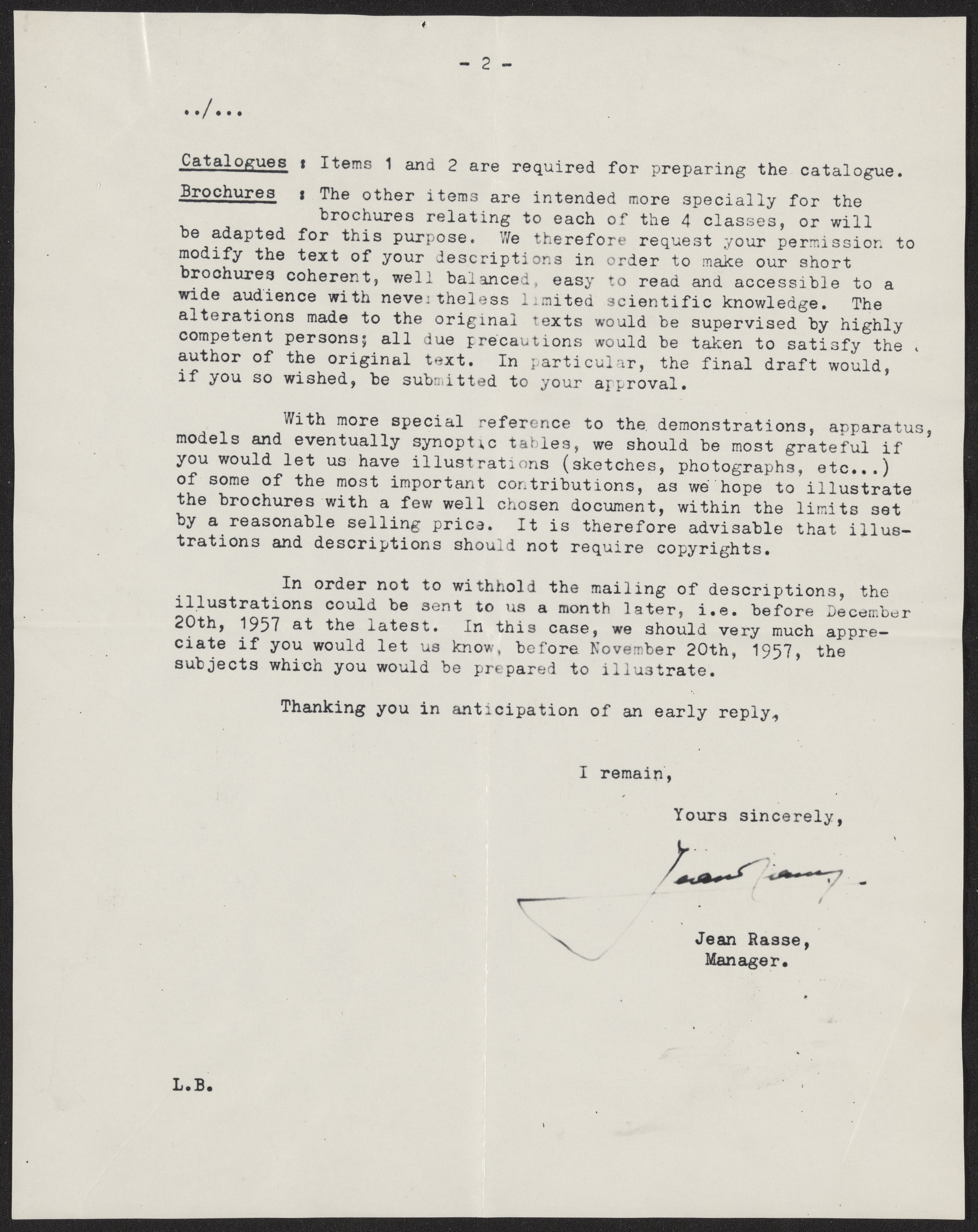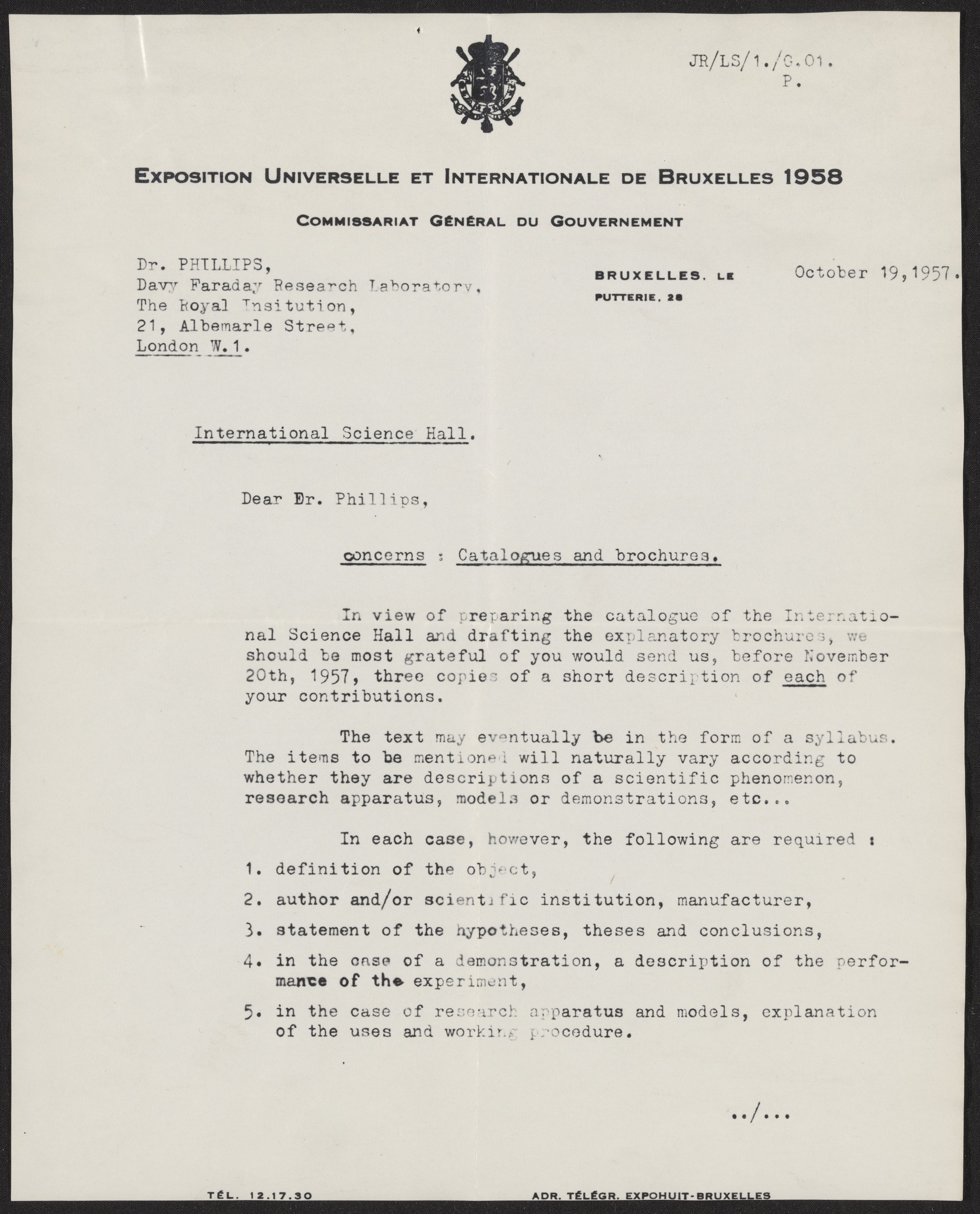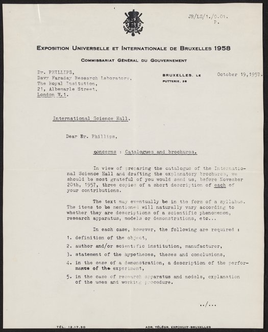 Letter written by Jean Rasse, the manager of the International Science Hall, to David Chilton Phillips (1924-1999) detailing the requirements for the exhibition descriptions and catalogue.