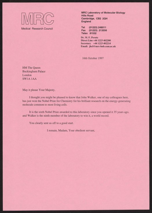 Perutz, Max F. “Letter from Max Perutz to Queen Elizabeth II, October 16, 1997,” October 16, 1997. History of Molecular Biology Collection, Box 74, Folder 4. Science History Institute. Philadelphia. https://digital.sciencehistory.org/works/rogjqm1.