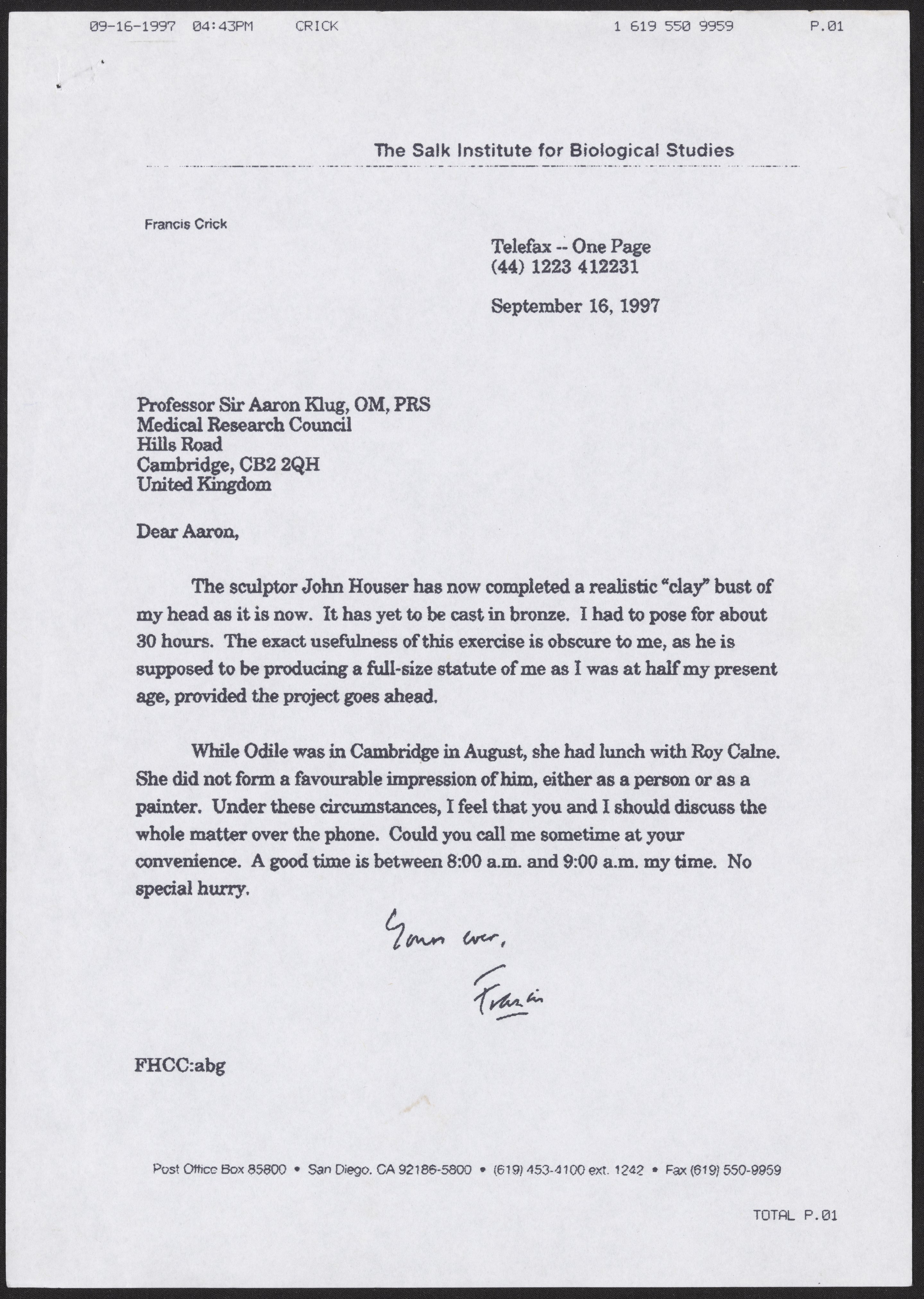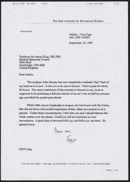 Crick, Francis. “Fax from Francis Crick to Aaron Klug, September 16, 1997,” September 16, 1997. History of Molecular Biology Collection, Box 20, Folder 6. Science History Institute. Philadelphia. https://digital.sciencehistory.org/works/roznb57.