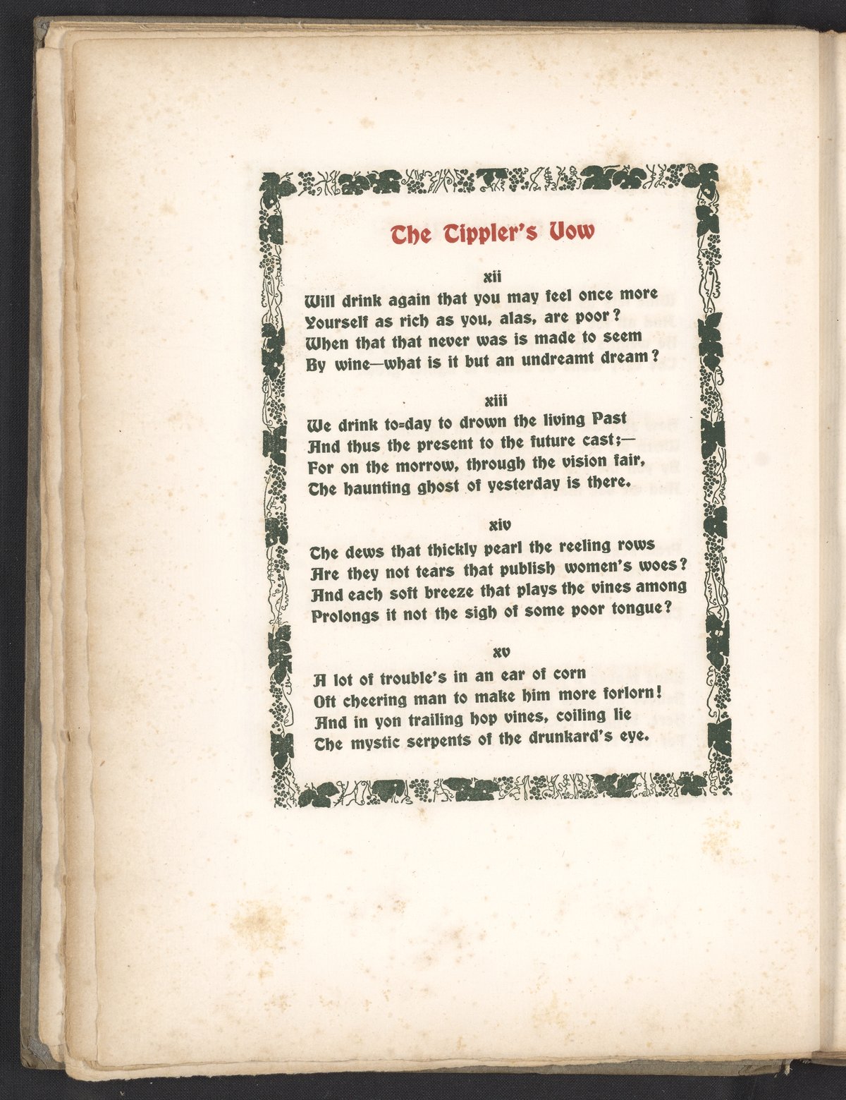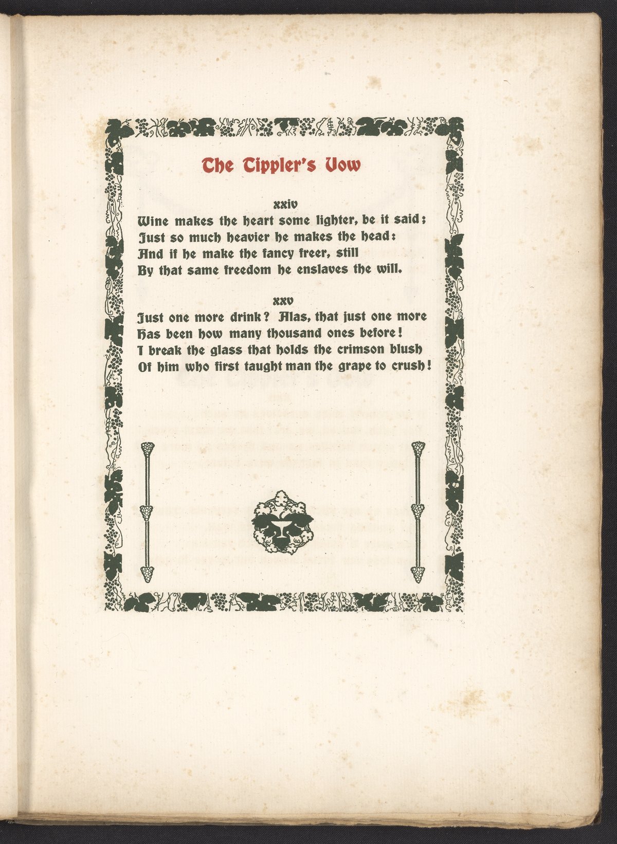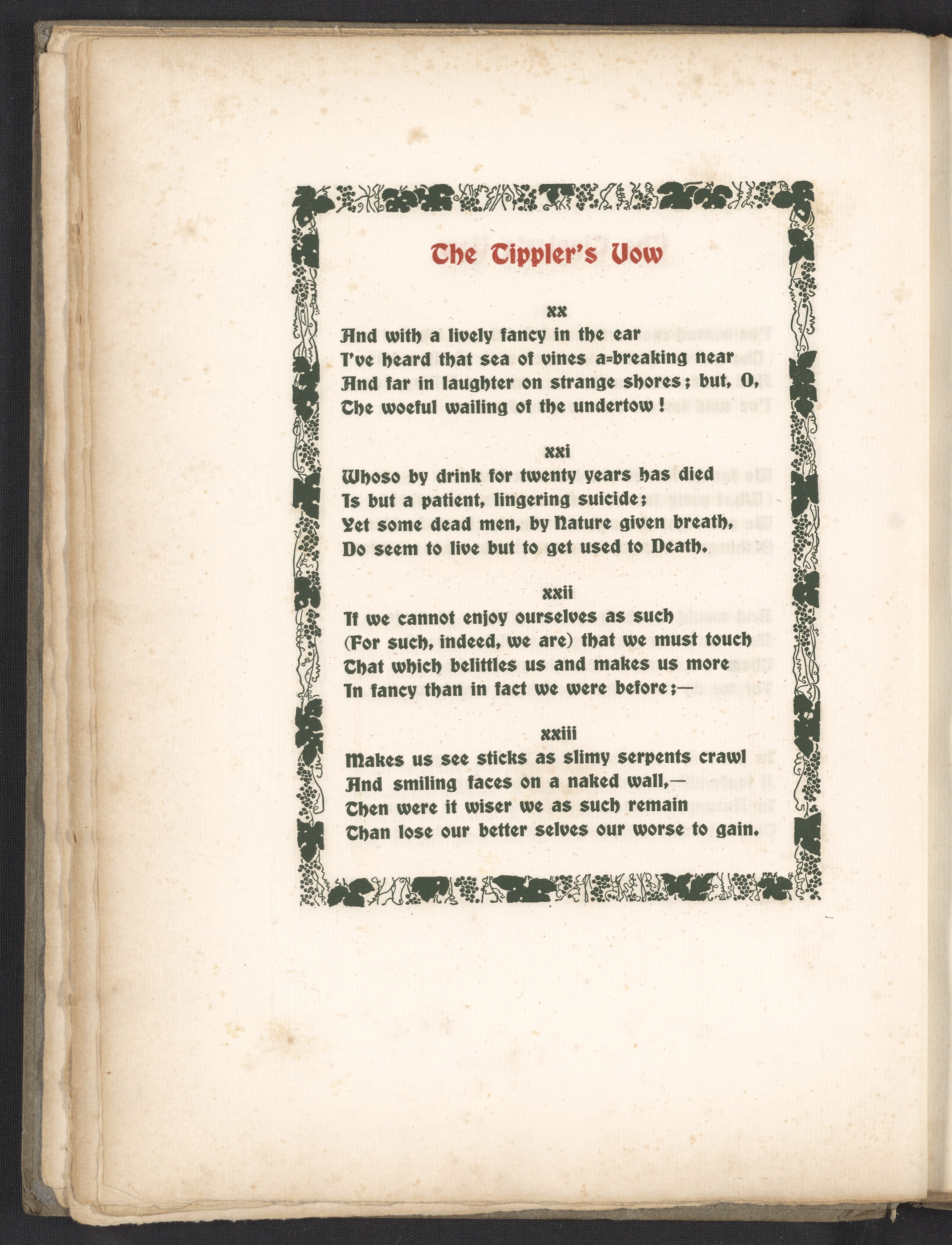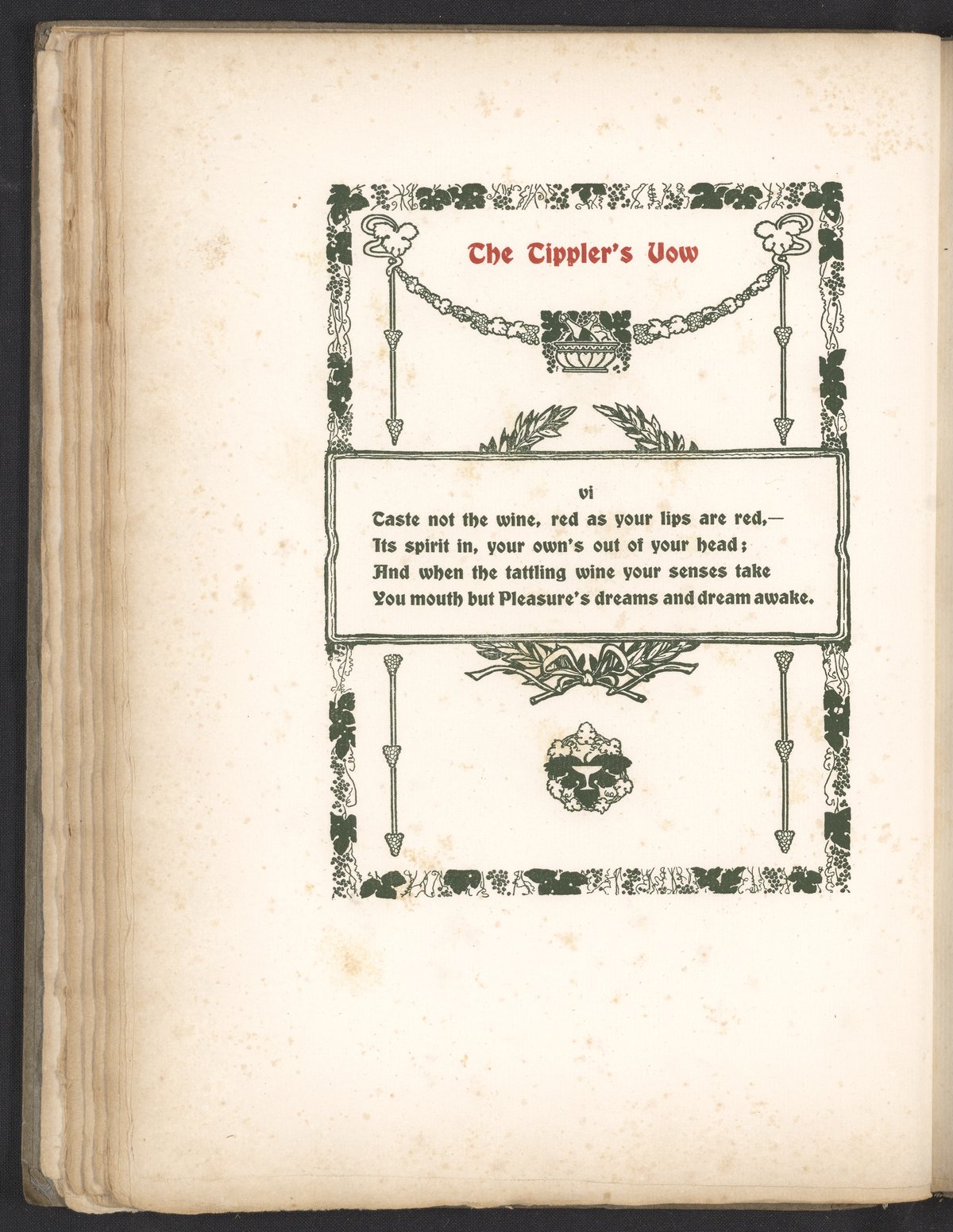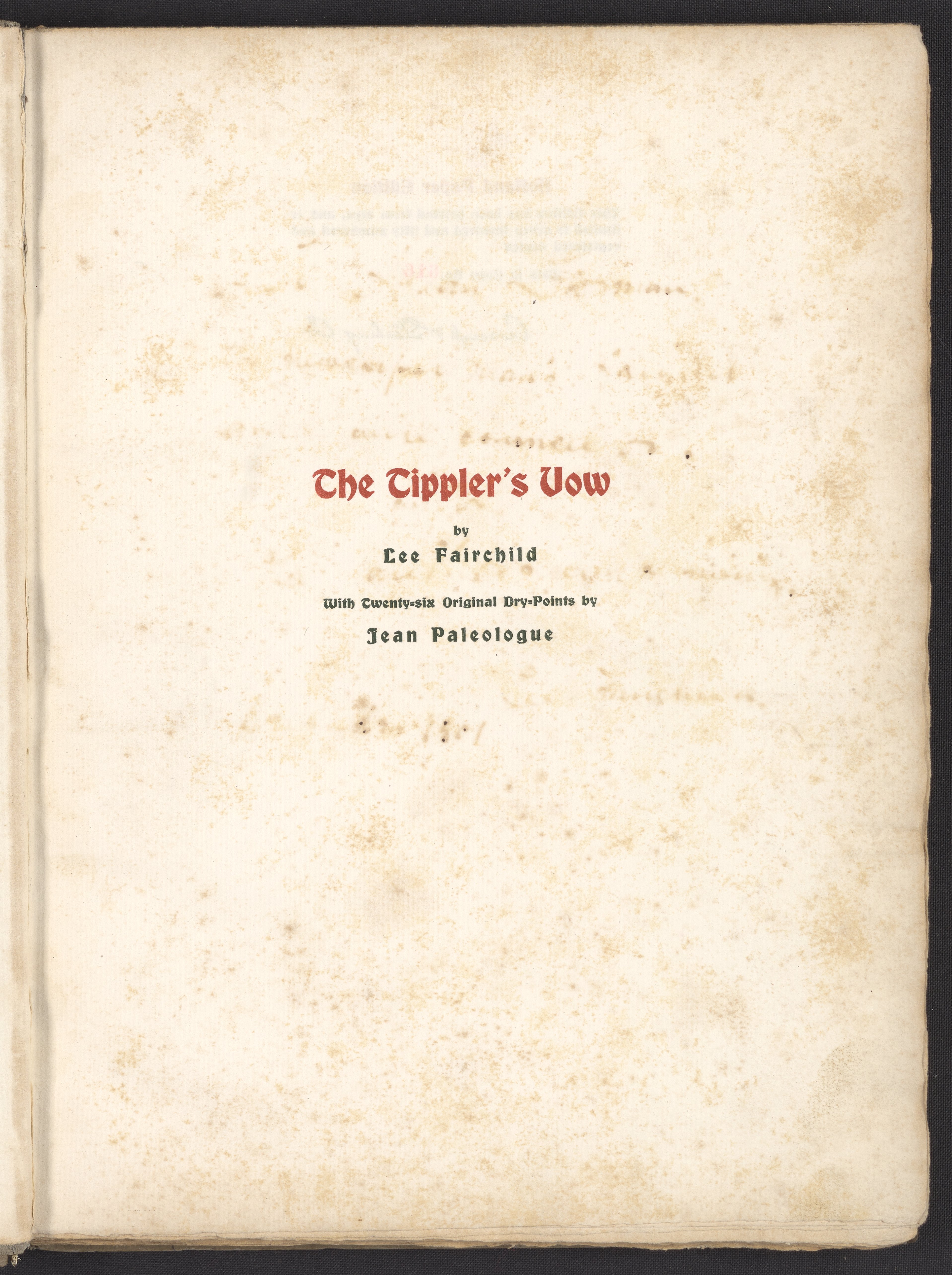 Small JPG1200 x 1554px — 347 KBLarge JPG2880 x 3729px — 2.4 MBFull-sized JPG4029 x 5217px — 4.5 MBOriginal fileTIFF — 4029 x 5217px — 60.2 MBVolume containing a poem of 25 strophes by Lee Fairchild (1860-1910). The poem, written in the first-person point of view, is a promise to embrace temperance. It is printed first, continuously, then each verse is printed on a separate leaf with an illustration on the opposite page. Finally, the poem is reprinted as it was first published in February 1901 in 17 strophes. The edition was limited to 750 numbered copies and this particular volume is number 616 of 750. It is printed on Holland paper and includes 26 original drypoint etchings by Romanian artist Jean de Paleologue (1855-1942). Many of the leaves in this copy are unopened and its pages are uncut. The work's flyleaf includes an inscription from the author.