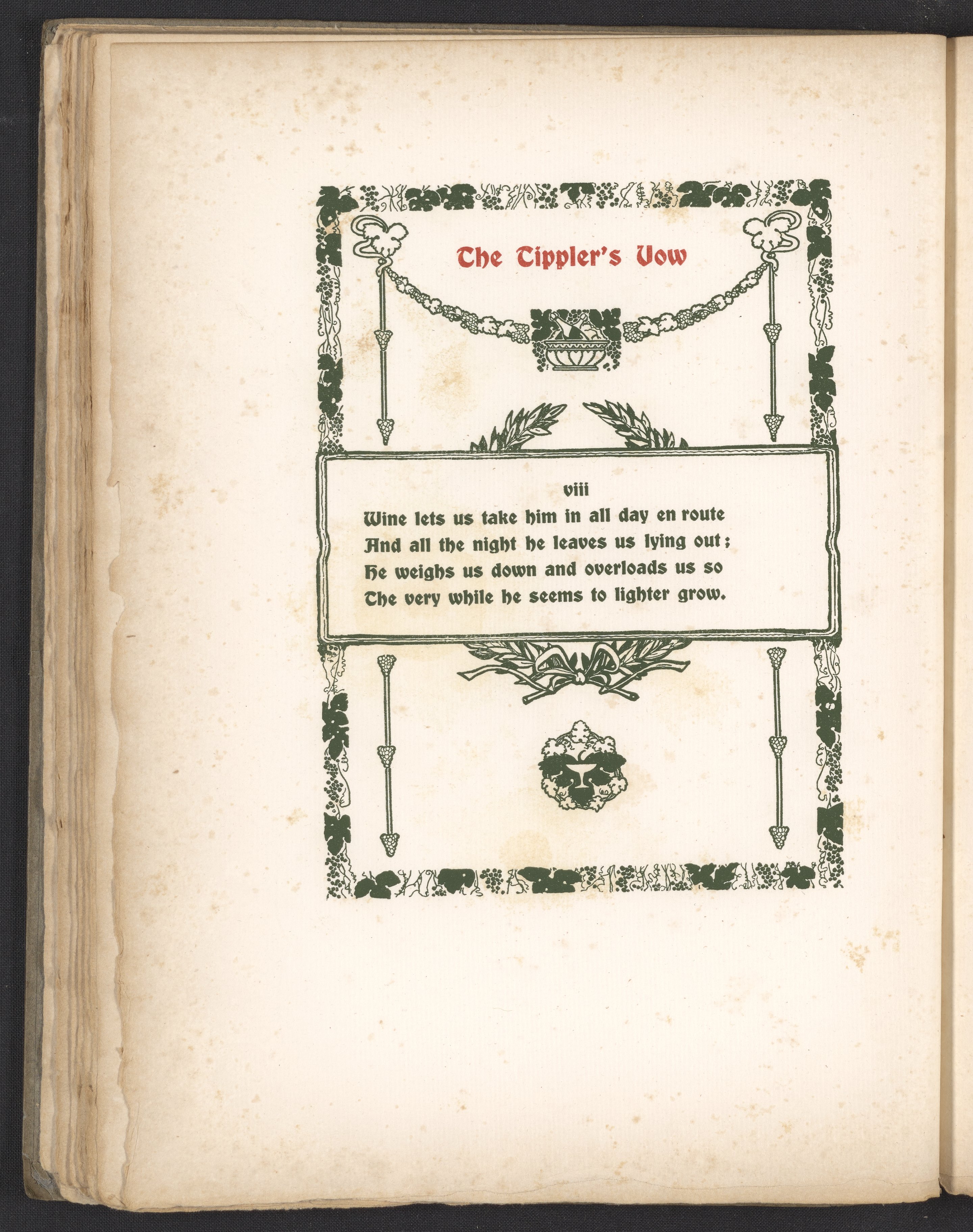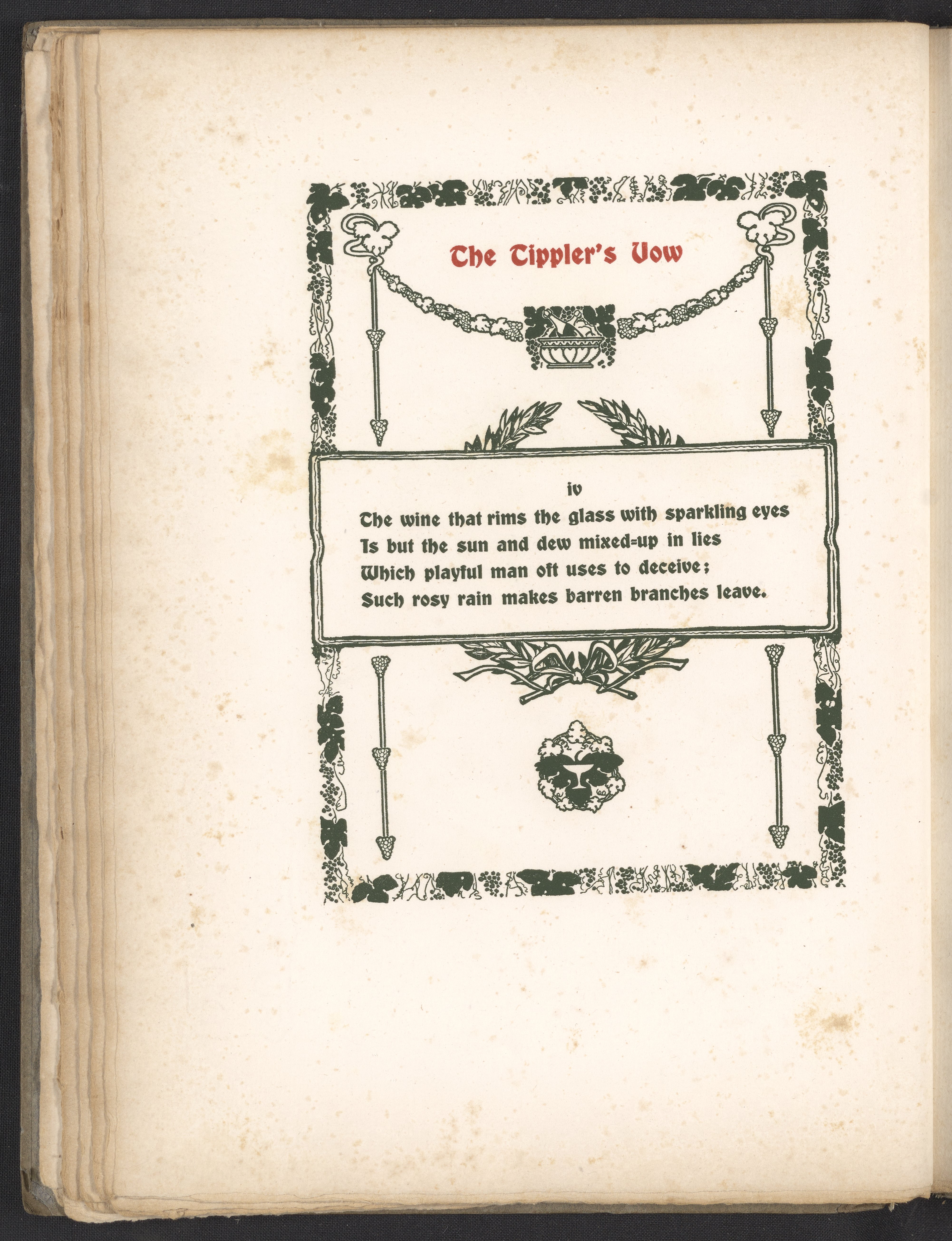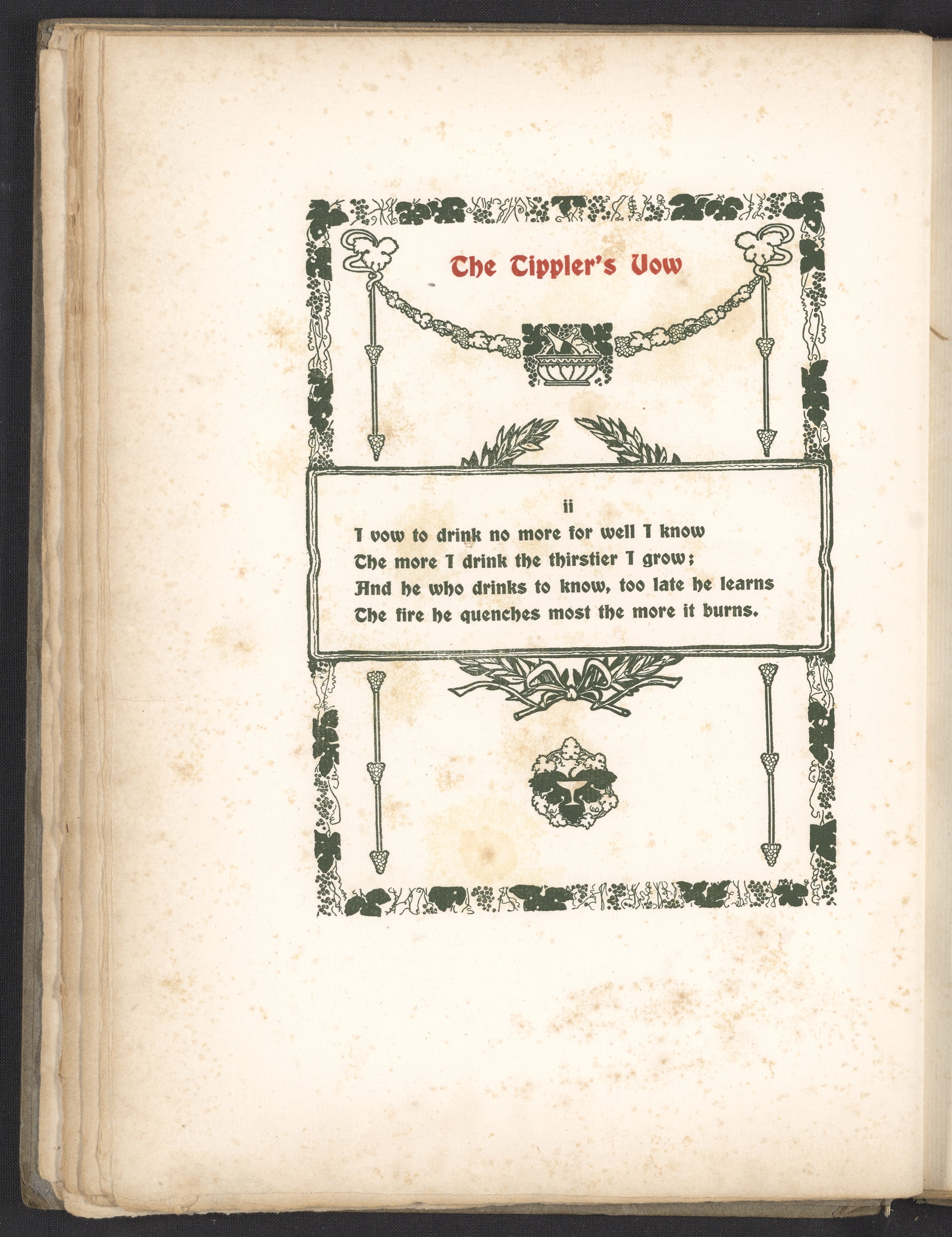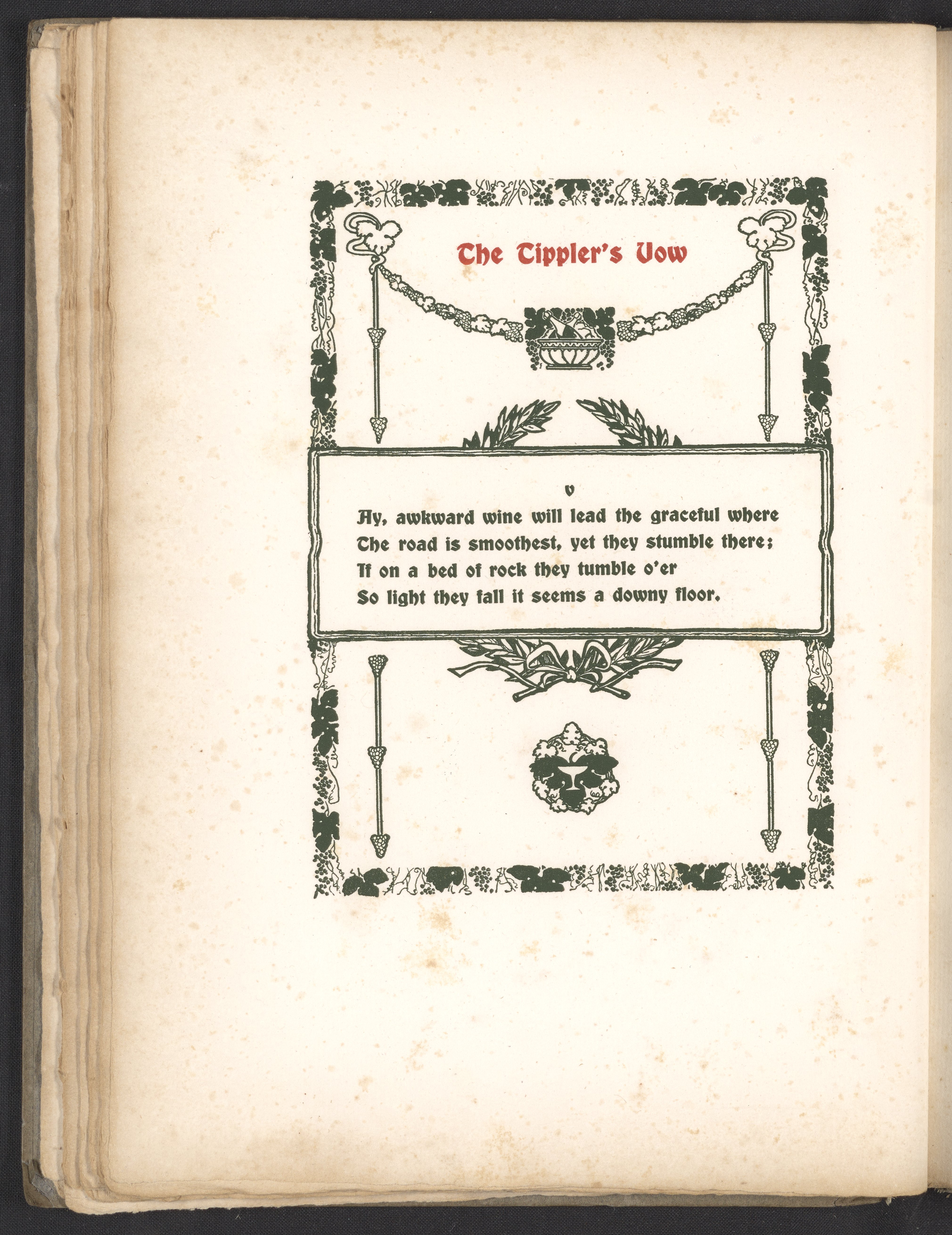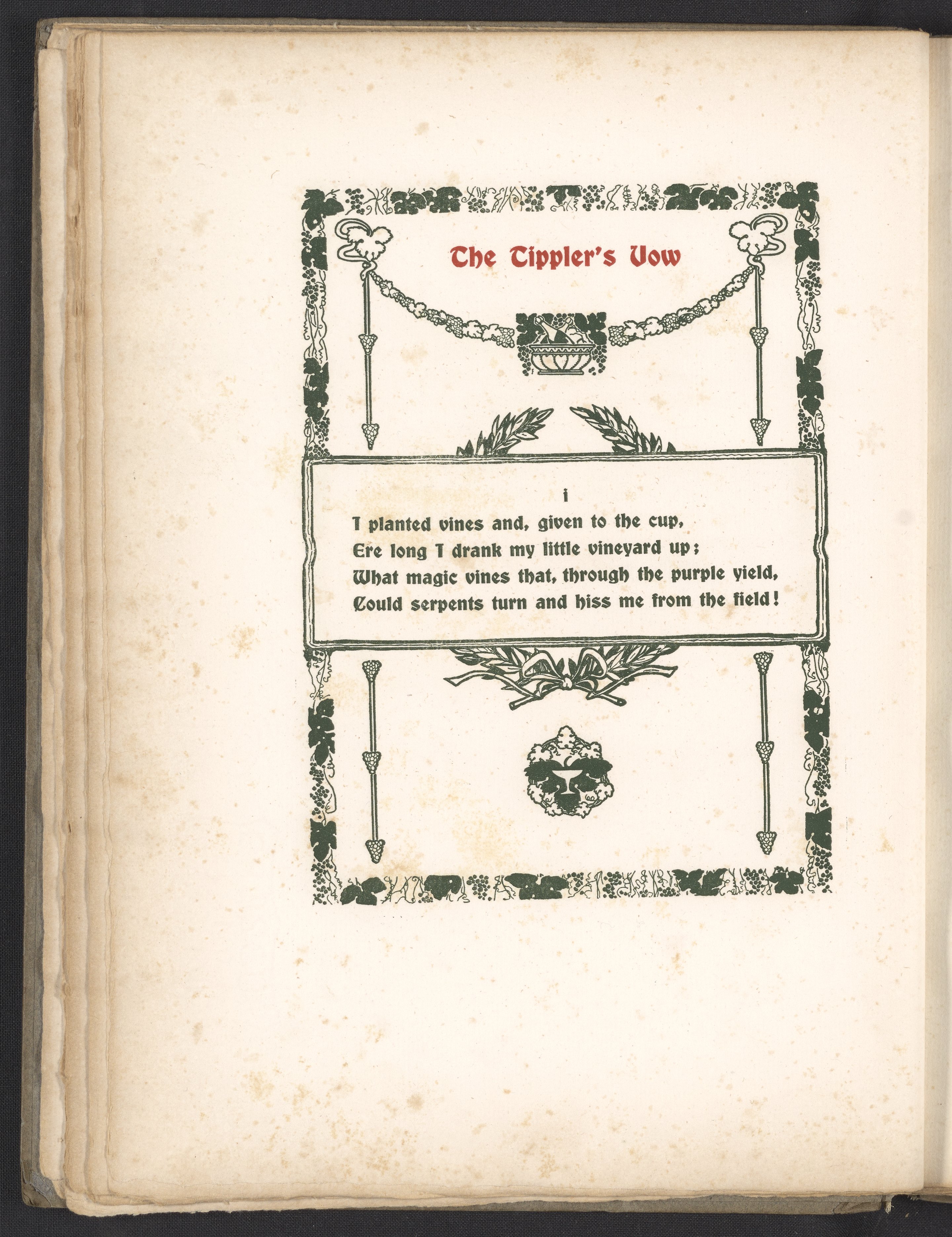 Small JPG1200 x 1554px — 347 KBLarge JPG2880 x 3729px — 2.4 MBFull-sized JPG4029 x 5217px — 4.5 MBOriginal fileTIFF — 4029 x 5217px — 60.2 MBVolume containing a poem of 25 strophes by Lee Fairchild (1860-1910). The poem, written in the first-person point of view, is a promise to embrace temperance. It is printed first, continuously, then each verse is printed on a separate leaf with an illustration on the opposite page. Finally, the poem is reprinted as it was first published in February 1901 in 17 strophes. The edition was limited to 750 numbered copies and this particular volume is number 616 of 750. It is printed on Holland paper and includes 26 original drypoint etchings by Romanian artist Jean de Paleologue (1855-1942). Many of the leaves in this copy are unopened and its pages are uncut. The work's flyleaf includes an inscription from the author.