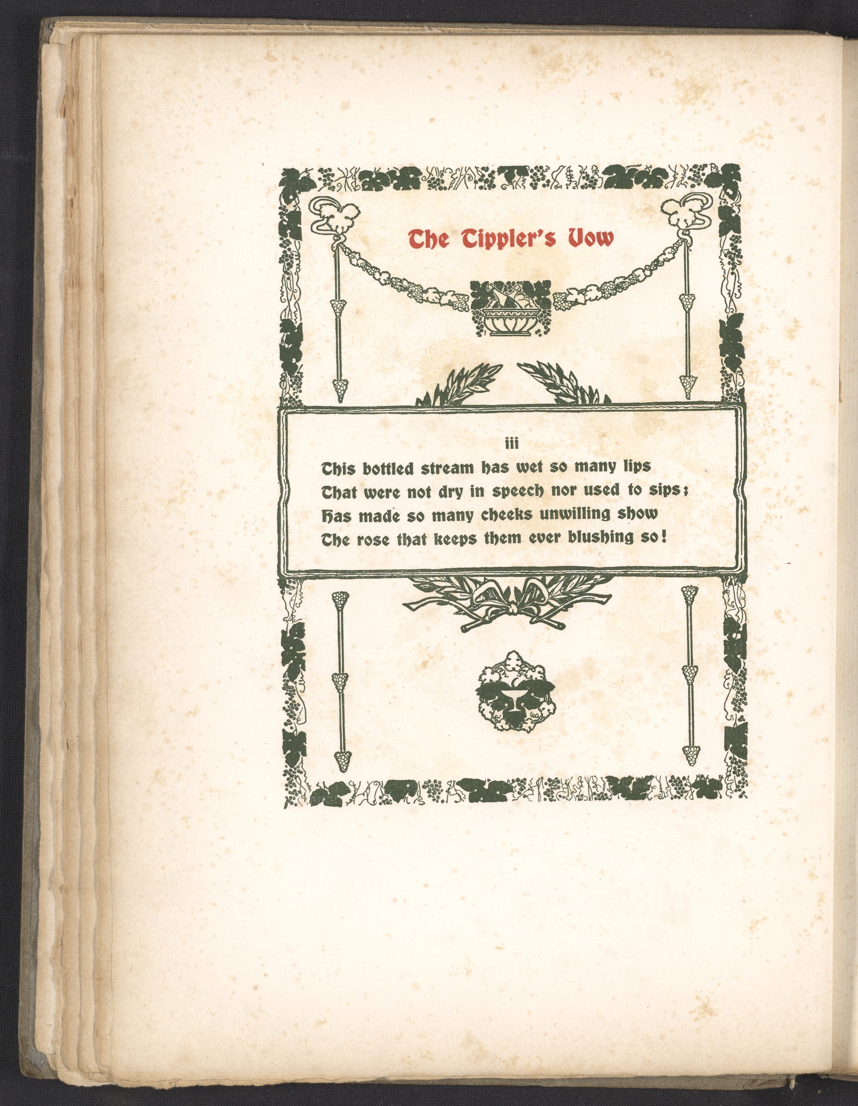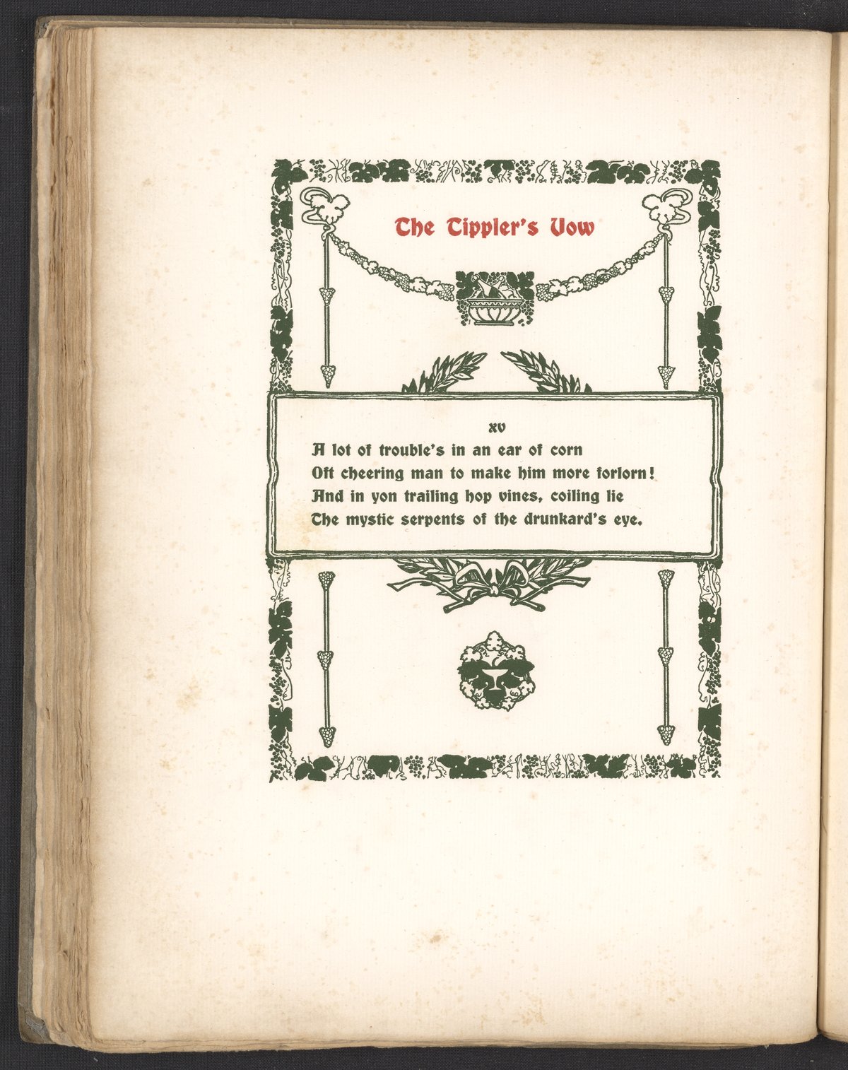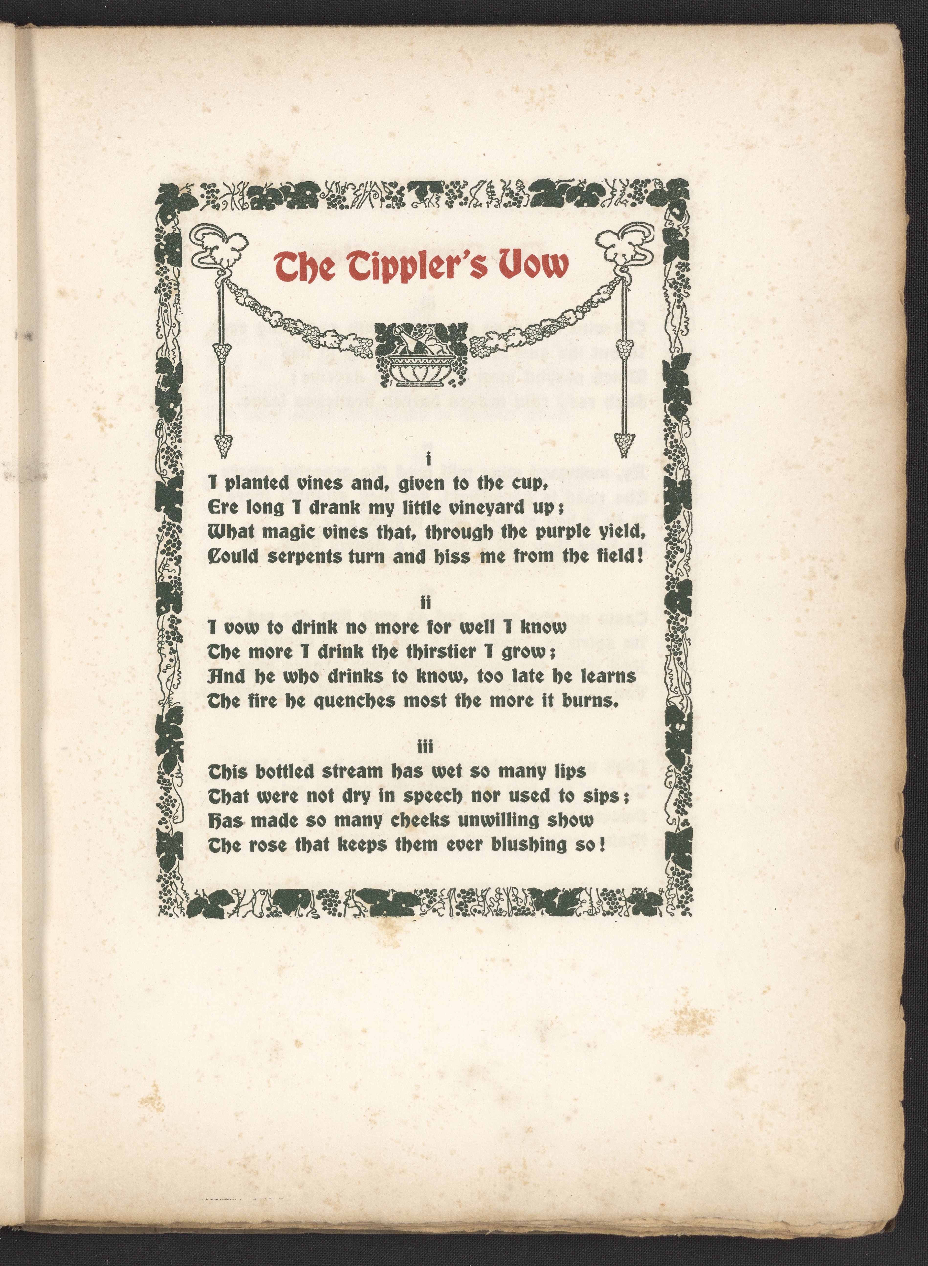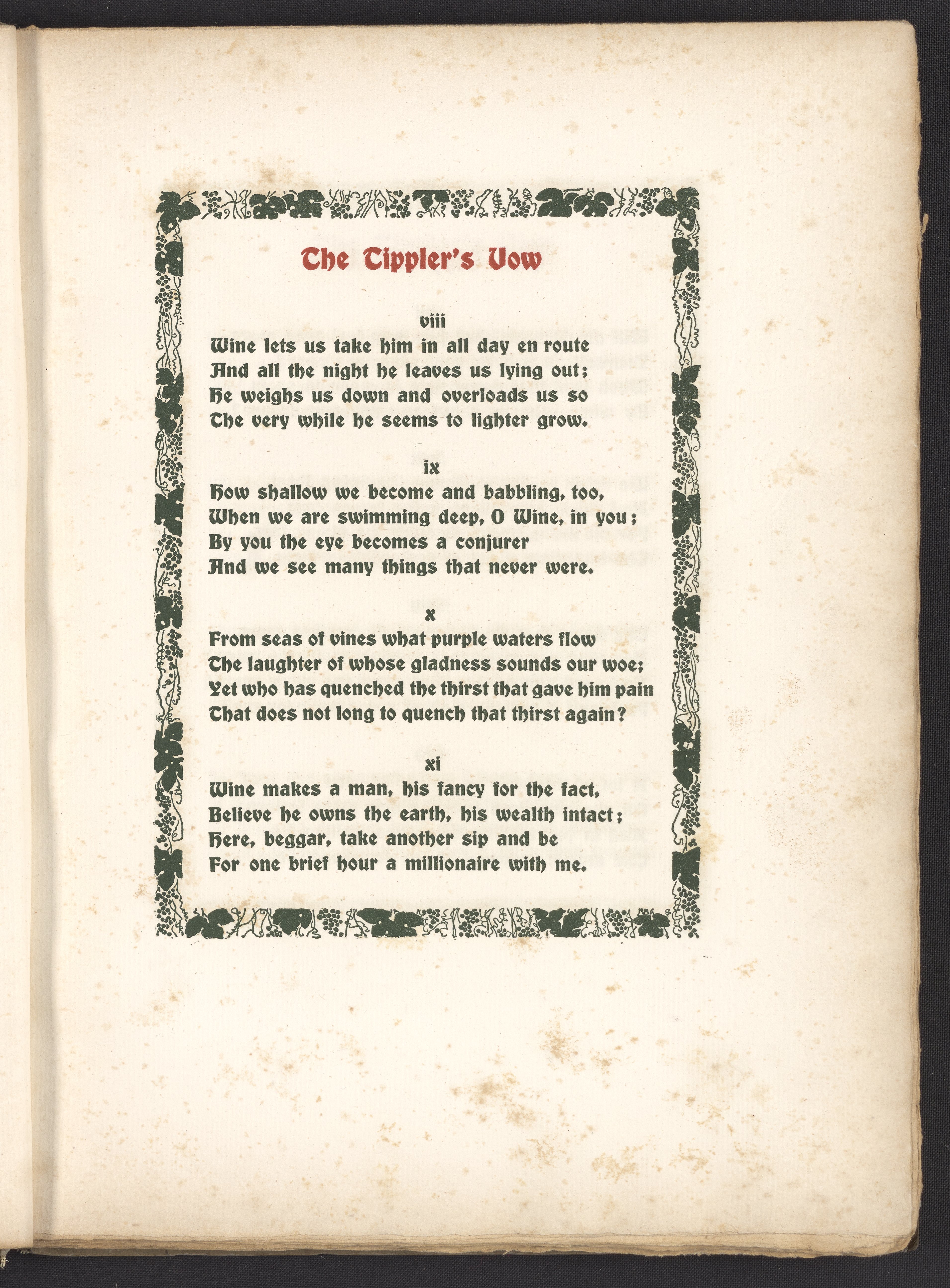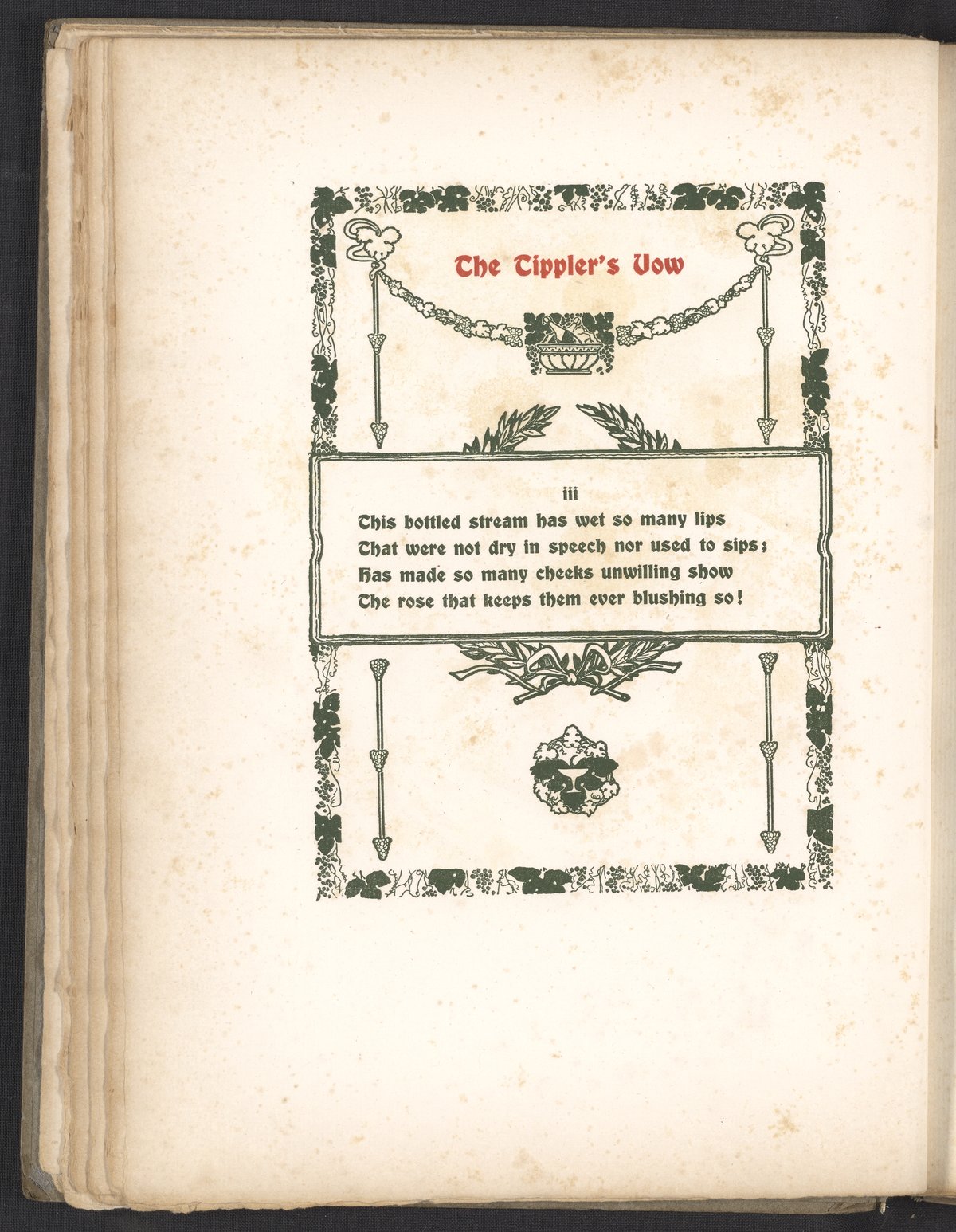 Small JPG1200 x 1554px — 347 KBLarge JPG2880 x 3729px — 2.4 MBFull-sized JPG4029 x 5217px — 4.5 MBOriginal fileTIFF — 4029 x 5217px — 60.2 MBVolume containing a poem of 25 strophes by Lee Fairchild (1860-1910). The poem, written in the first-person point of view, is a promise to embrace temperance. It is printed first, continuously, then each verse is printed on a separate leaf with an illustration on the opposite page. Finally, the poem is reprinted as it was first published in February 1901 in 17 strophes. The edition was limited to 750 numbered copies and this particular volume is number 616 of 750. It is printed on Holland paper and includes 26 original drypoint etchings by Romanian artist Jean de Paleologue (1855-1942). Many of the leaves in this copy are unopened and its pages are uncut. The work's flyleaf includes an inscription from the author.