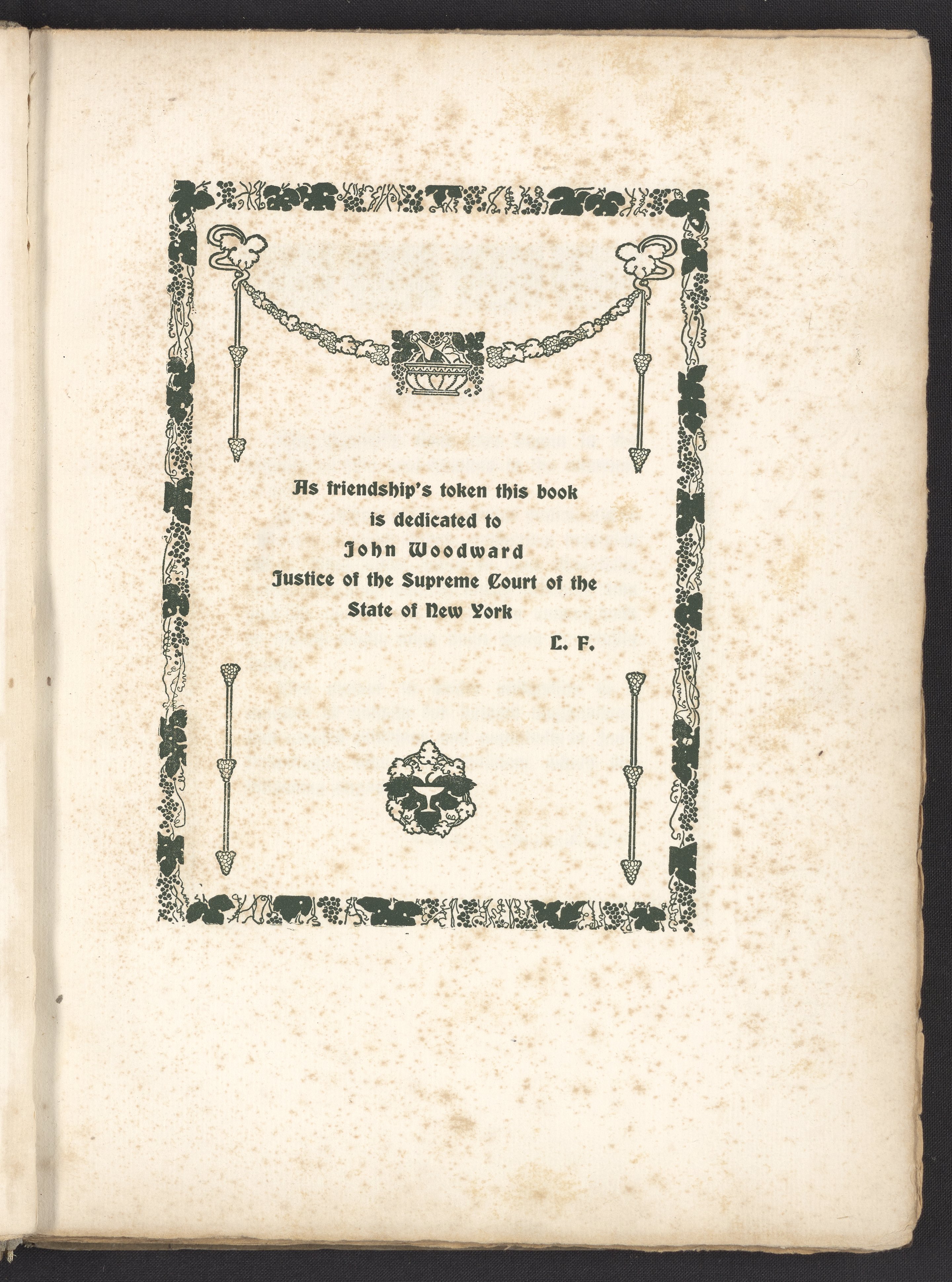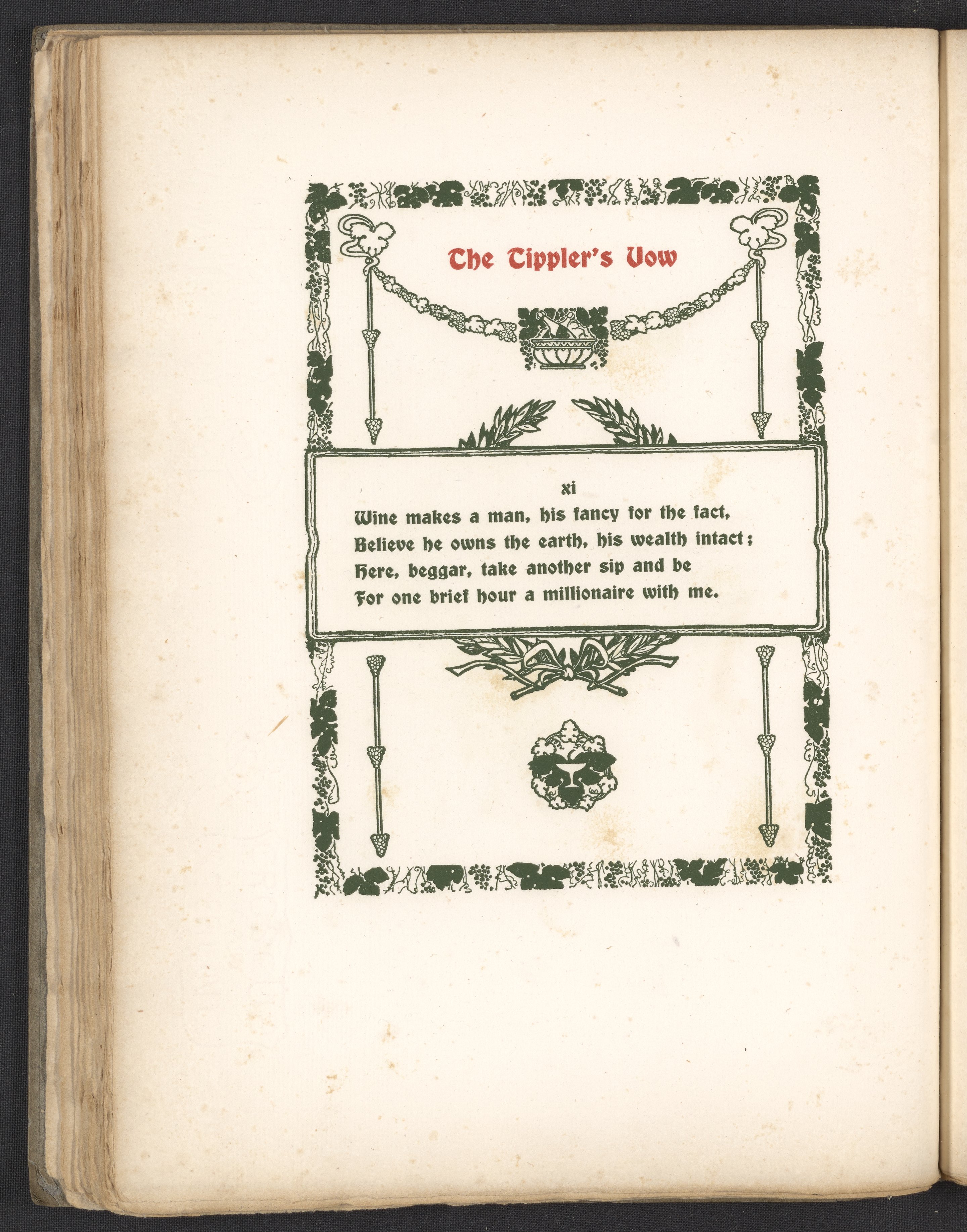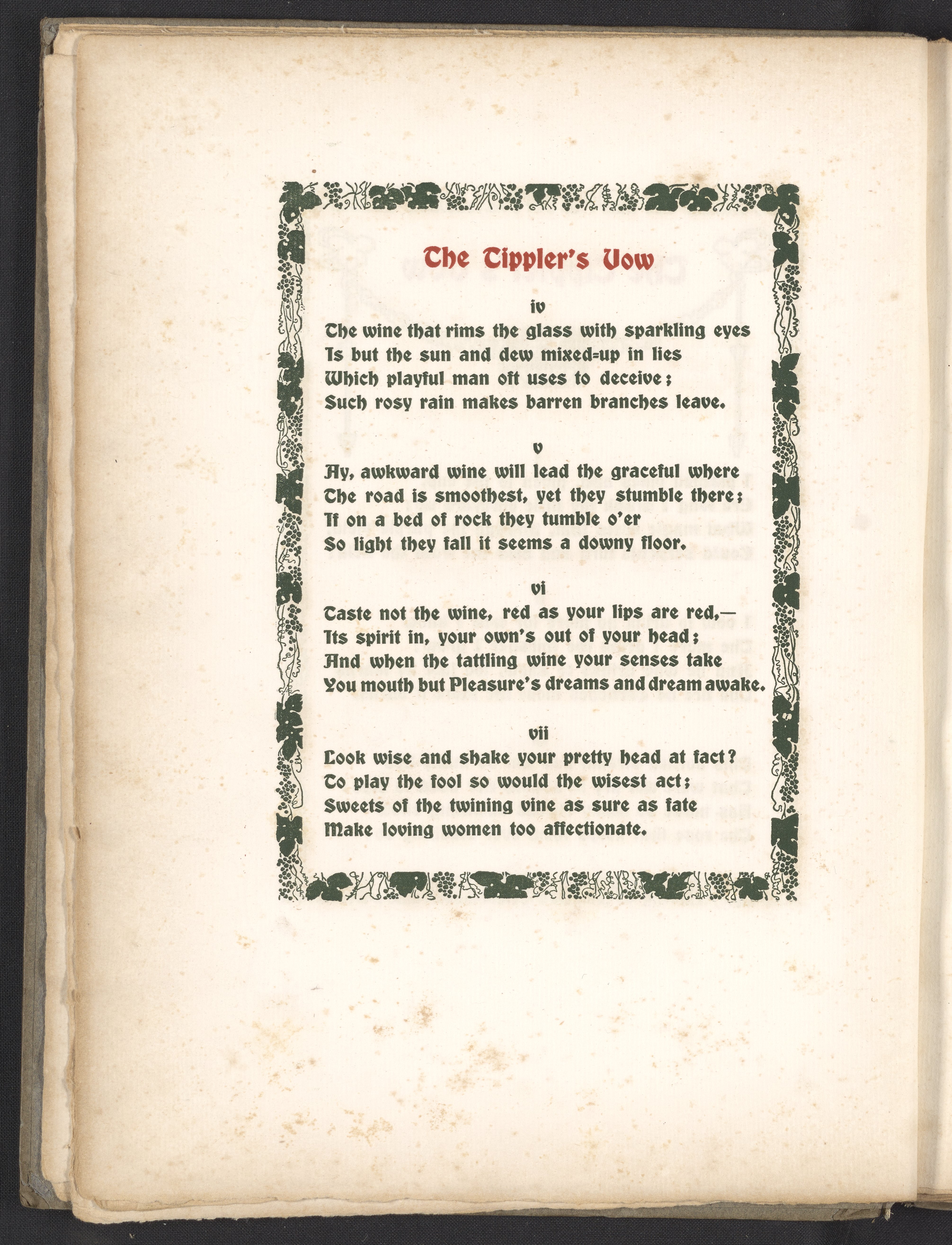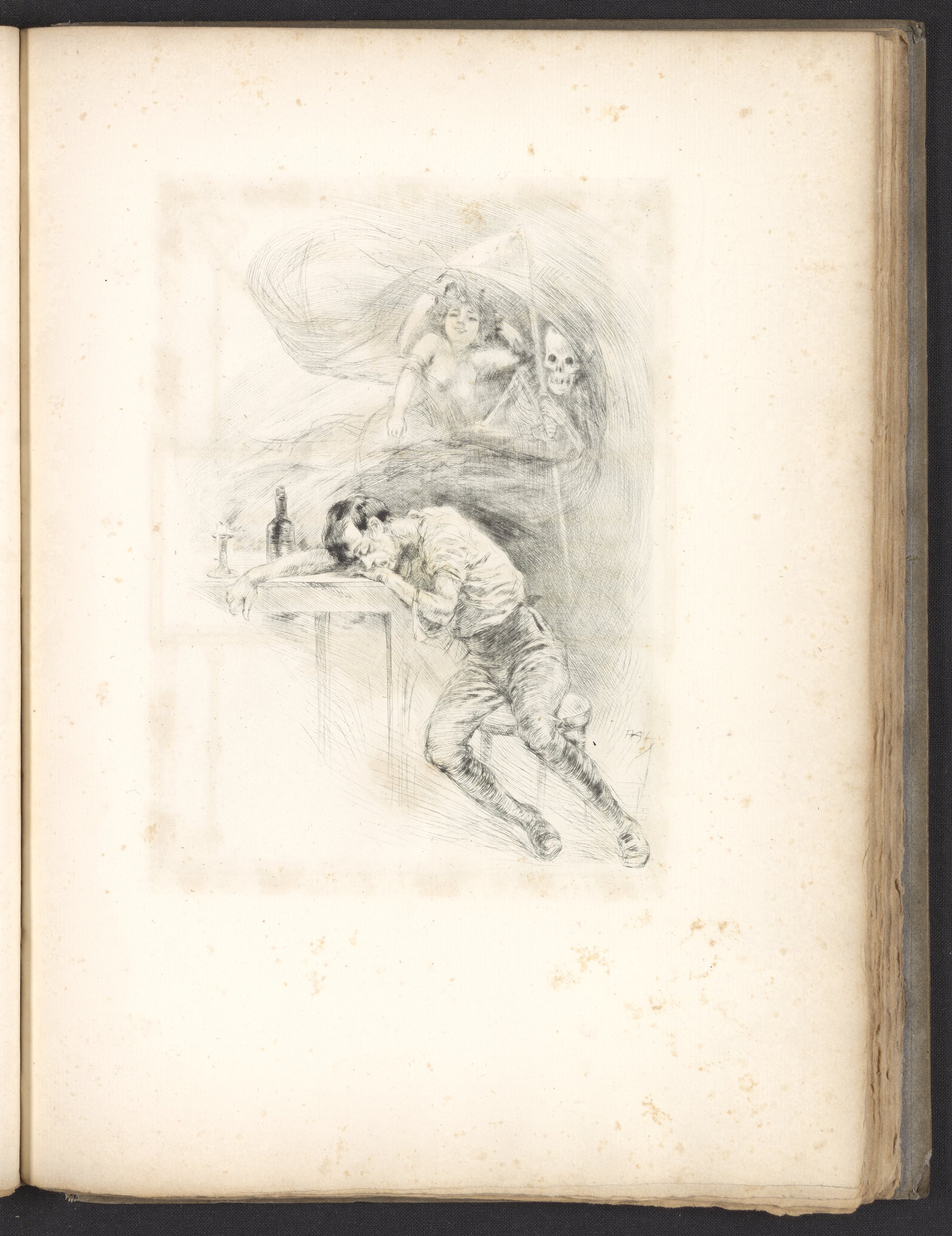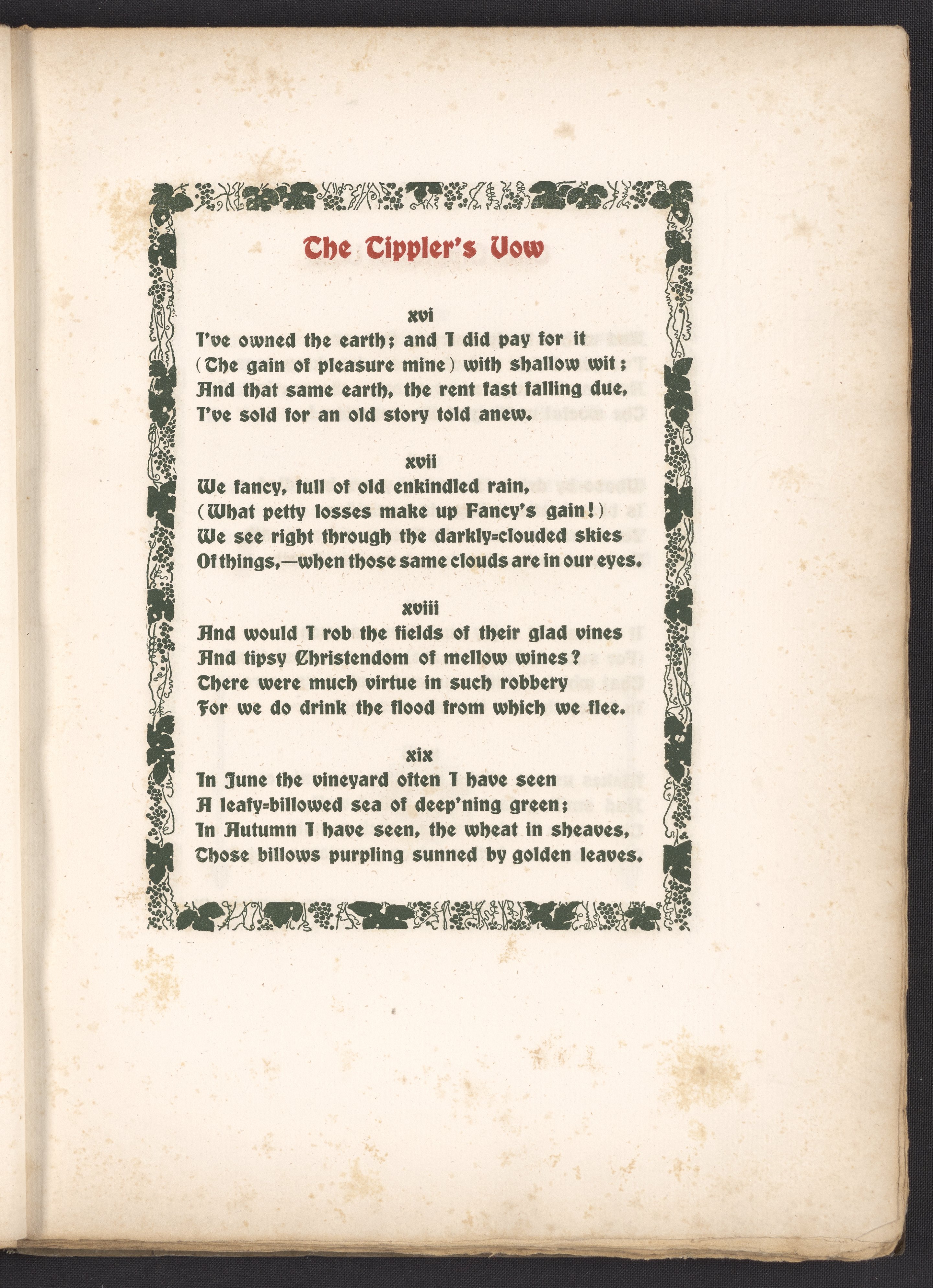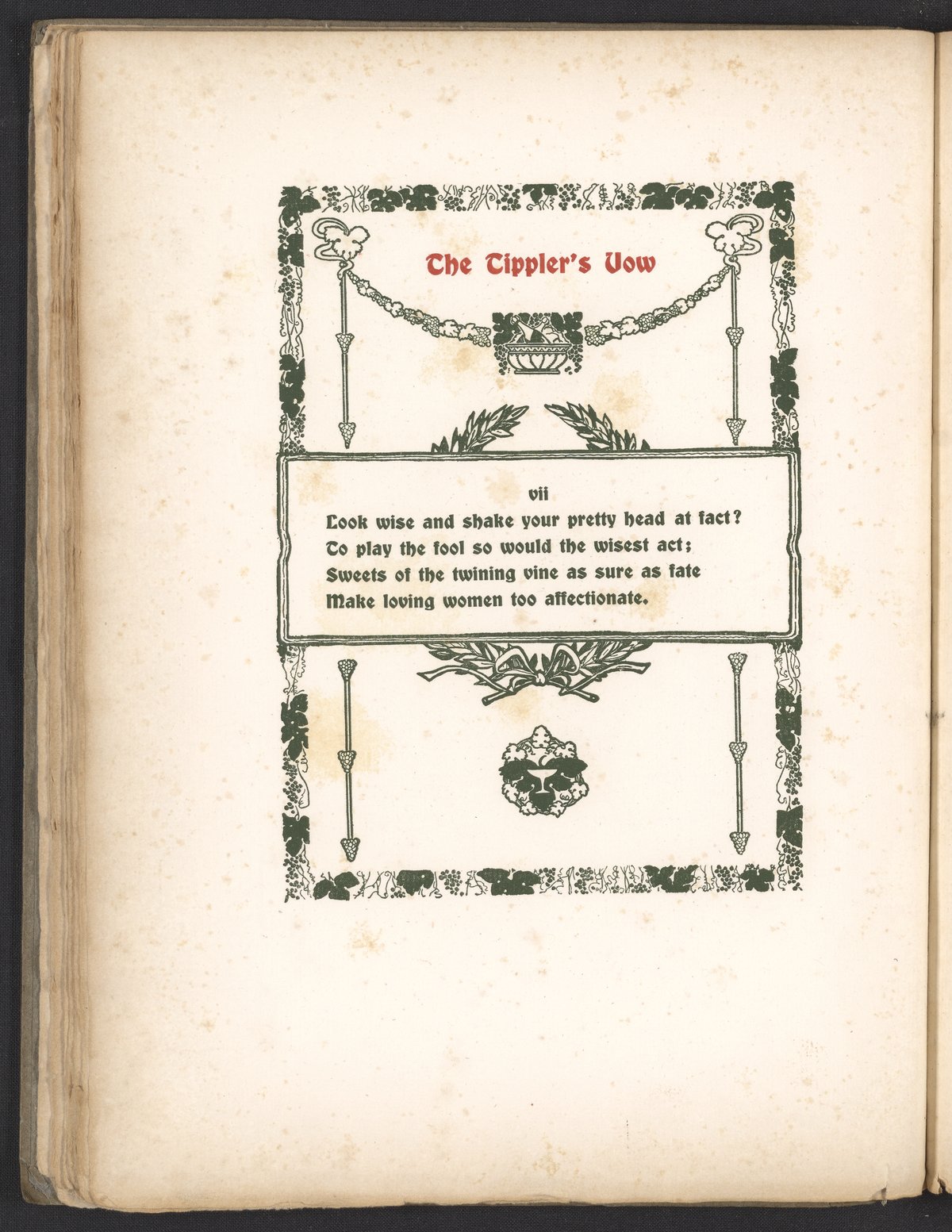 Small JPG1200 x 1554px — 347 KBLarge JPG2880 x 3729px — 2.4 MBFull-sized JPG4029 x 5217px — 4.5 MBOriginal fileTIFF — 4029 x 5217px — 60.2 MBVolume containing a poem of 25 strophes by Lee Fairchild (1860-1910). The poem, written in the first-person point of view, is a promise to embrace temperance. It is printed first, continuously, then each verse is printed on a separate leaf with an illustration on the opposite page. Finally, the poem is reprinted as it was first published in February 1901 in 17 strophes. The edition was limited to 750 numbered copies and this particular volume is number 616 of 750. It is printed on Holland paper and includes 26 original drypoint etchings by Romanian artist Jean de Paleologue (1855-1942). Many of the leaves in this copy are unopened and its pages are uncut. The work's flyleaf includes an inscription from the author.