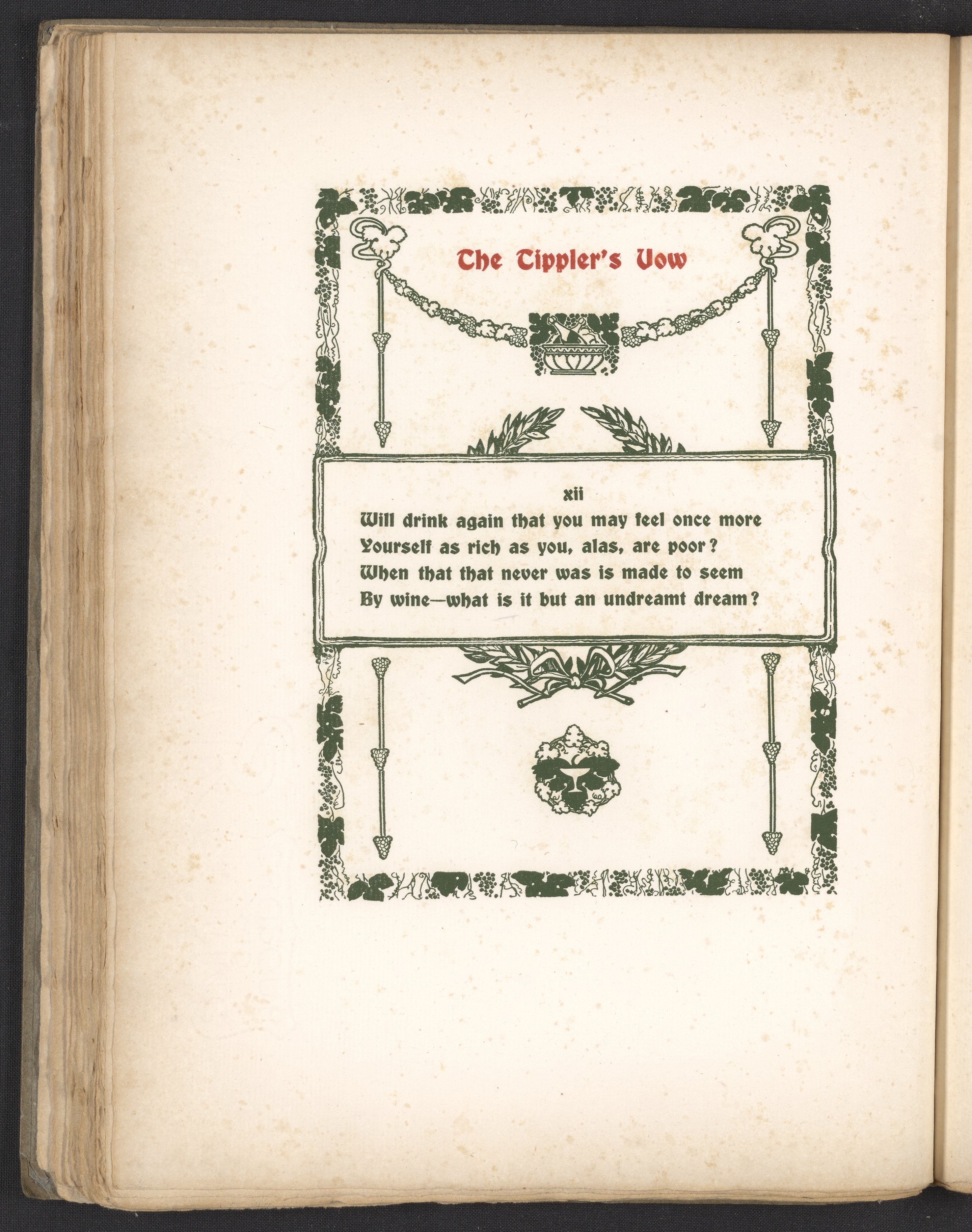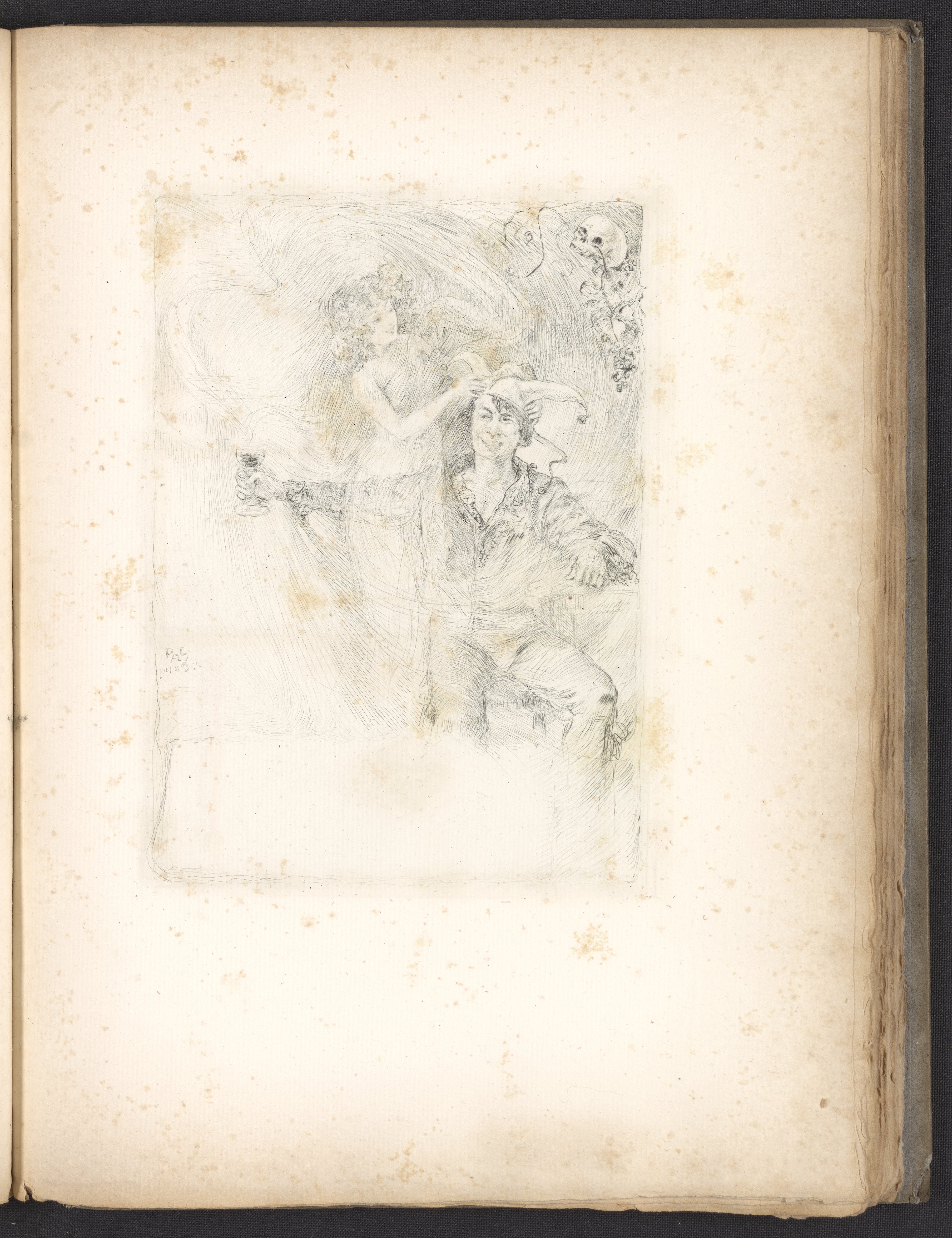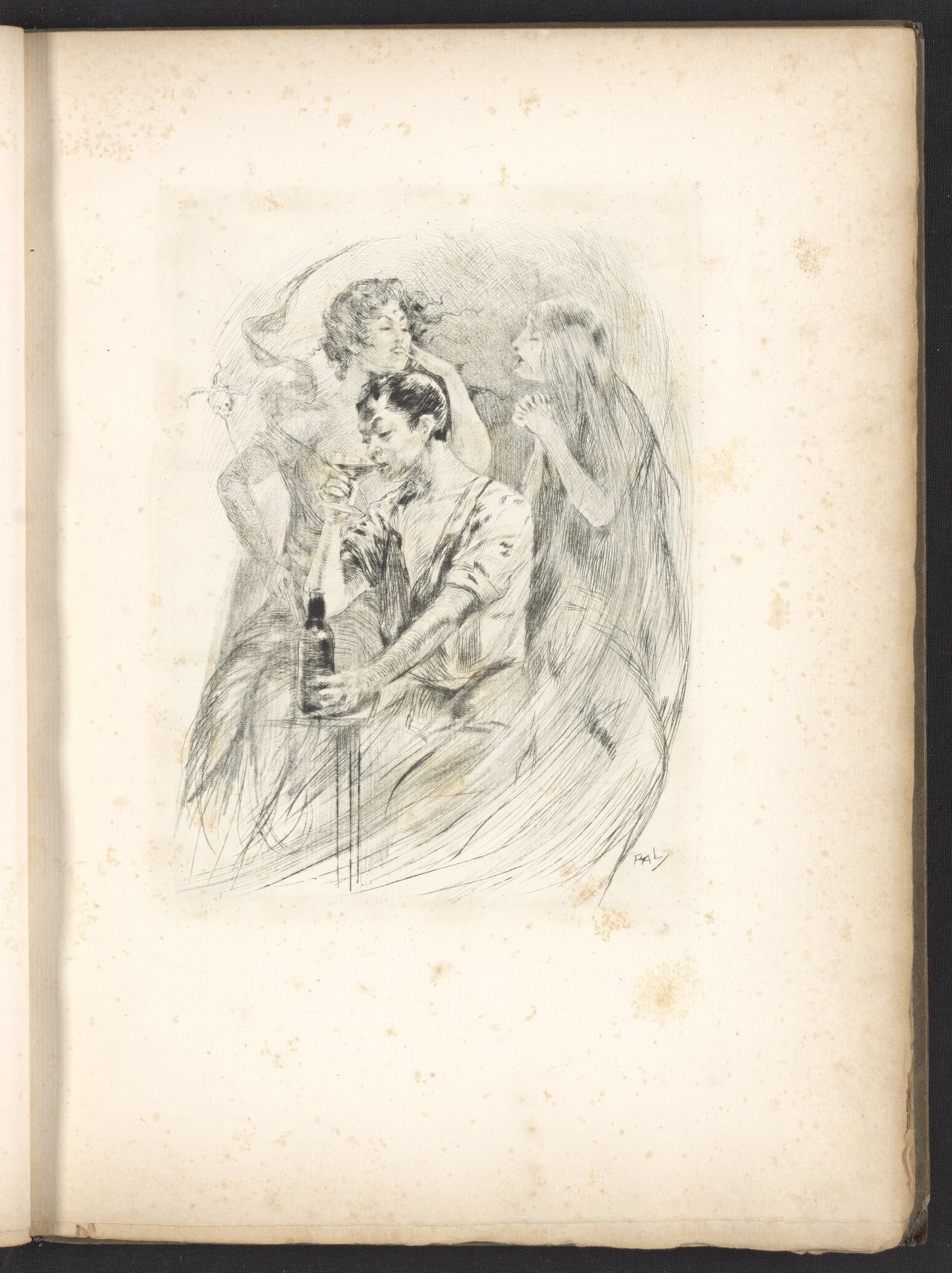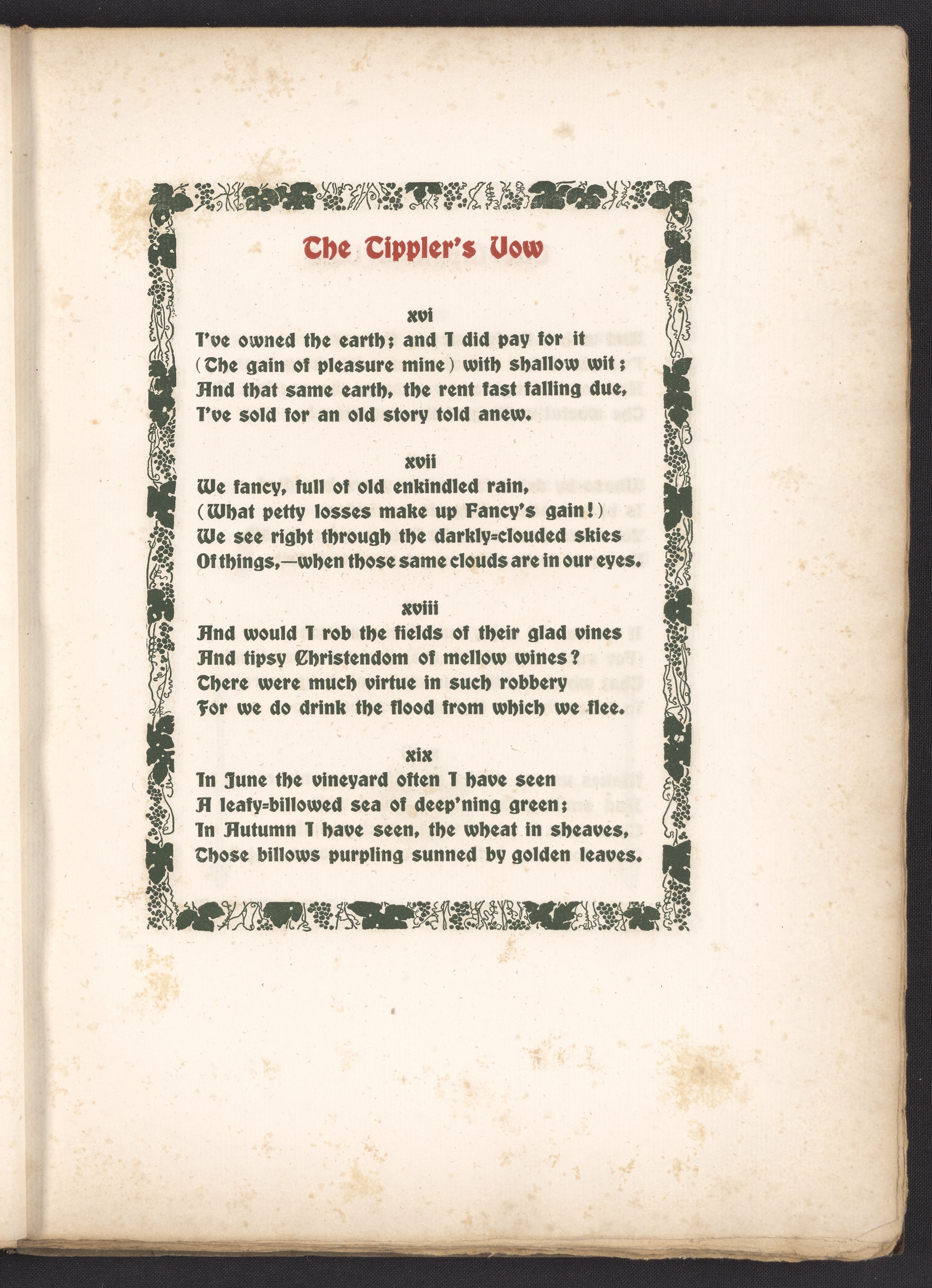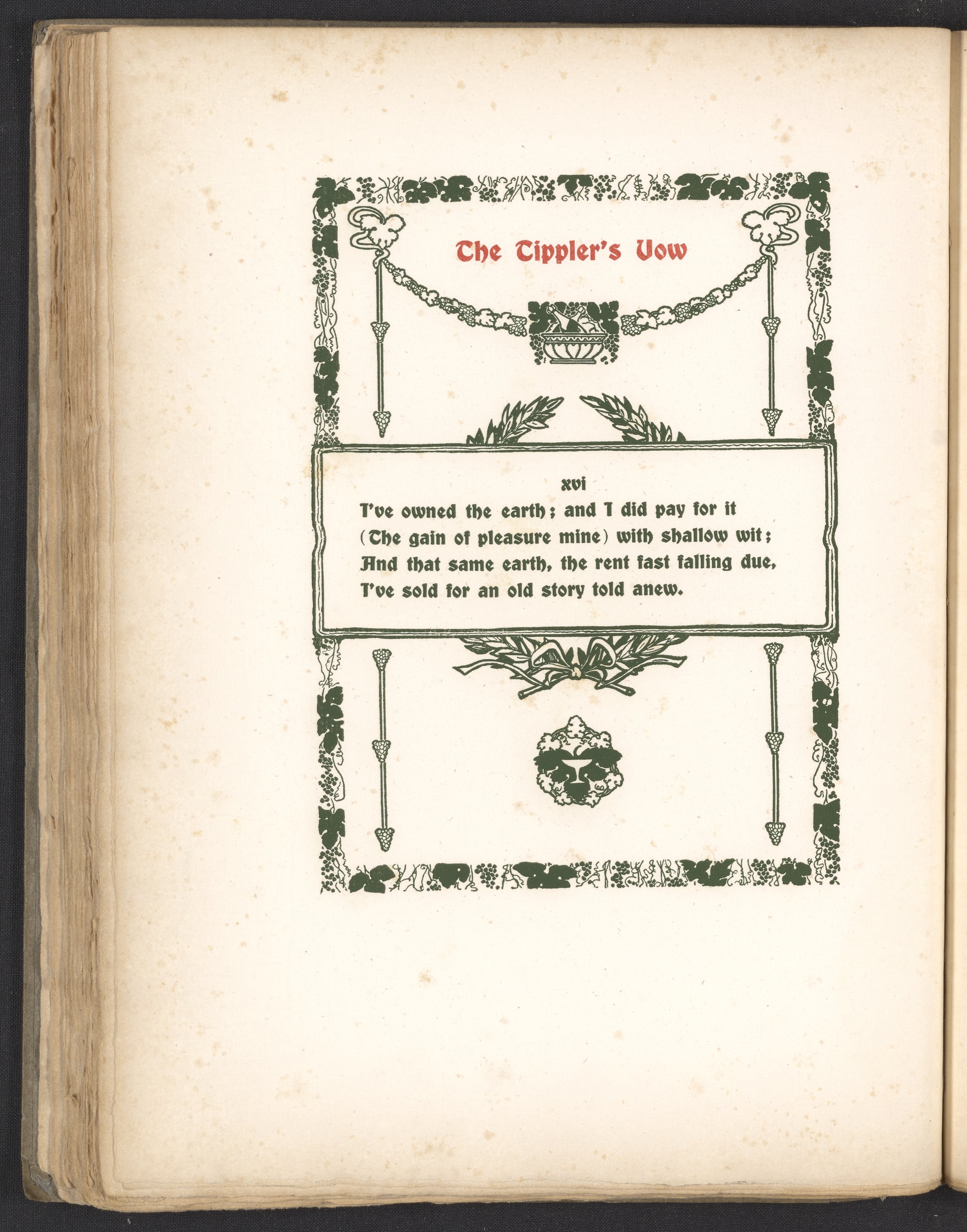 Small JPG1200 x 1554px — 347 KBLarge JPG2880 x 3729px — 2.4 MBFull-sized JPG4029 x 5217px — 4.5 MBOriginal fileTIFF — 4029 x 5217px — 60.2 MBVolume containing a poem of 25 strophes by Lee Fairchild (1860-1910). The poem, written in the first-person point of view, is a promise to embrace temperance. It is printed first, continuously, then each verse is printed on a separate leaf with an illustration on the opposite page. Finally, the poem is reprinted as it was first published in February 1901 in 17 strophes. The edition was limited to 750 numbered copies and this particular volume is number 616 of 750. It is printed on Holland paper and includes 26 original drypoint etchings by Romanian artist Jean de Paleologue (1855-1942). Many of the leaves in this copy are unopened and its pages are uncut. The work's flyleaf includes an inscription from the author.