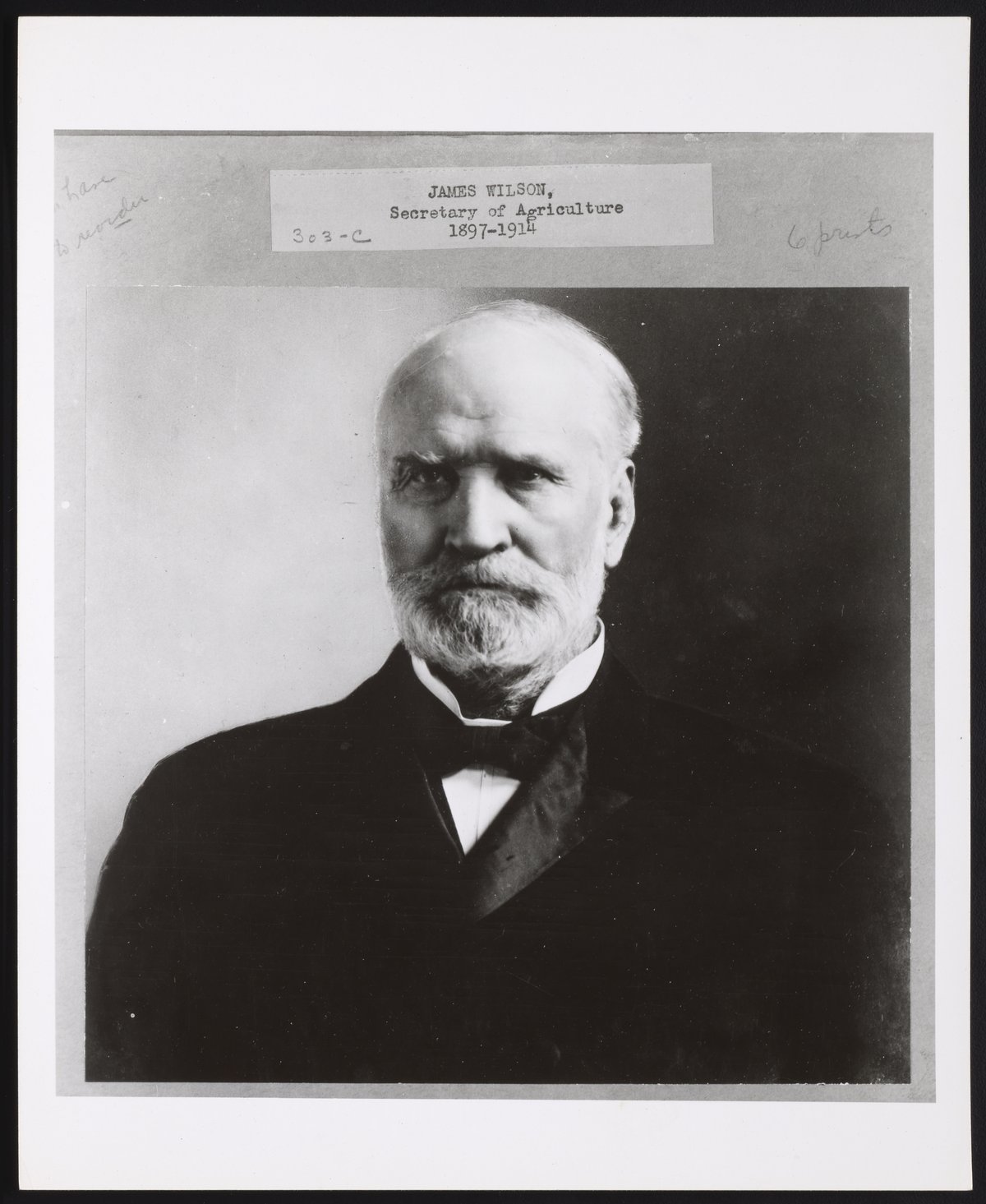 Portrait of James Wilson (1835-1920), who served as Secretary of Agriculture from 1897 to 1913. Wilson's tenure as Secretary is regarded as a period distinguished by the modernization of agricultural methods, as well as the expansion of food inspection practices. Prior to his tenure as Secretary, Wilson was a professor of agriculture at Iowa State Agricultural College (now Iowa State University), where he advised George Washington Carver.