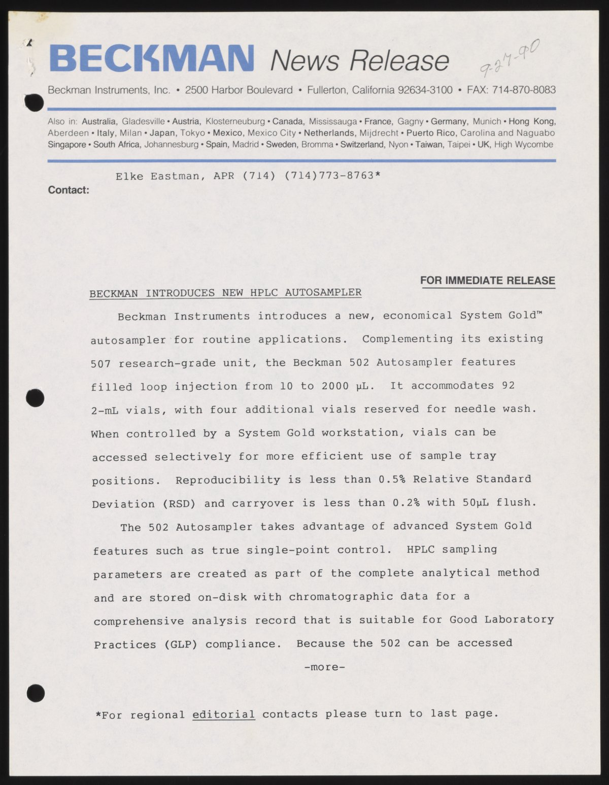 Beckman Introduces New HPLC Autosampler
