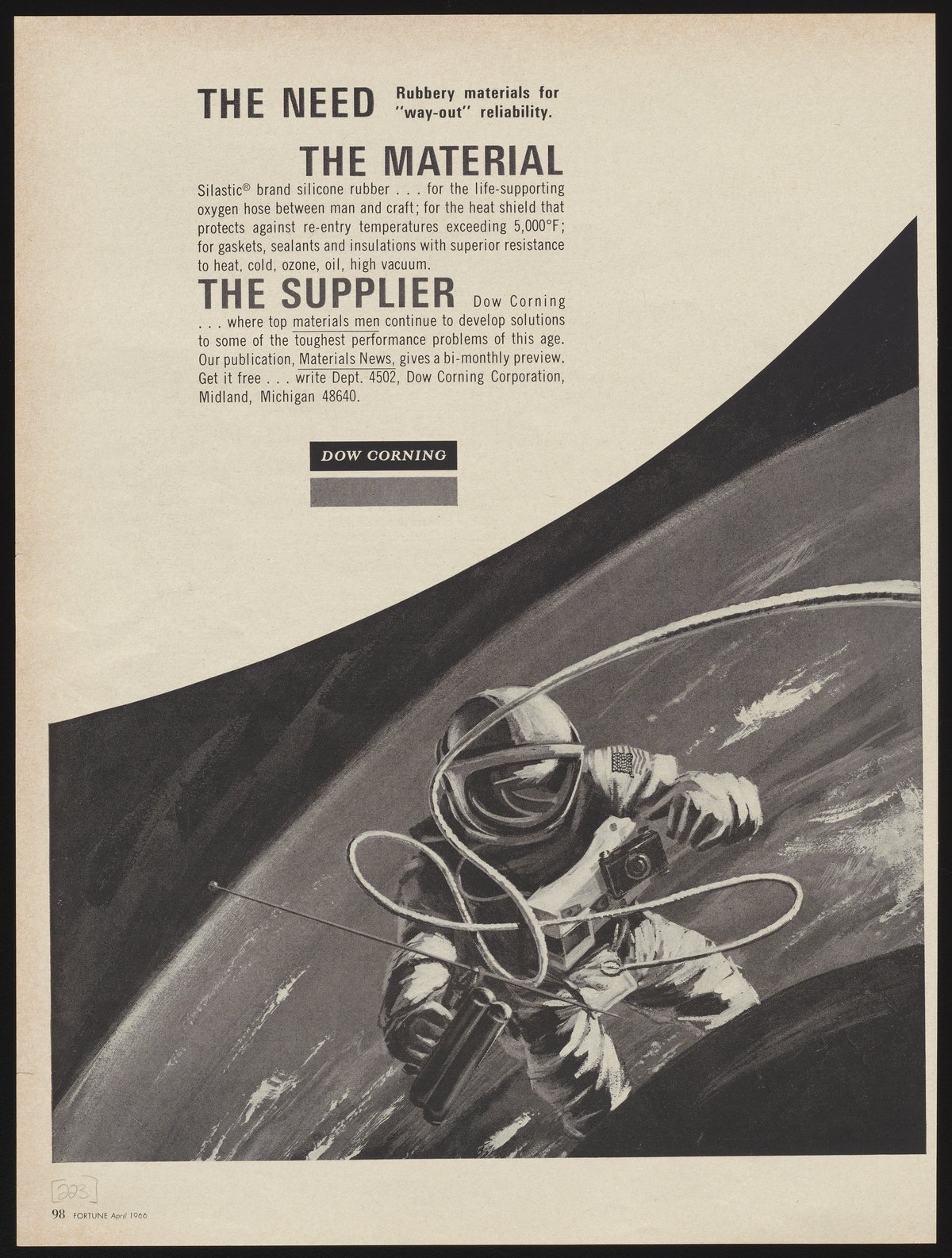 Dow Corning Corporation. “The Need: Rubbery Materials for ‘Way-Out’ Reliability,” April 1966. Advertisements from the Dow Chemical Historical Collection, Box 7. Science History Institute. Philadelphia. https://digital.sciencehistory.org/works/rr171x94c.