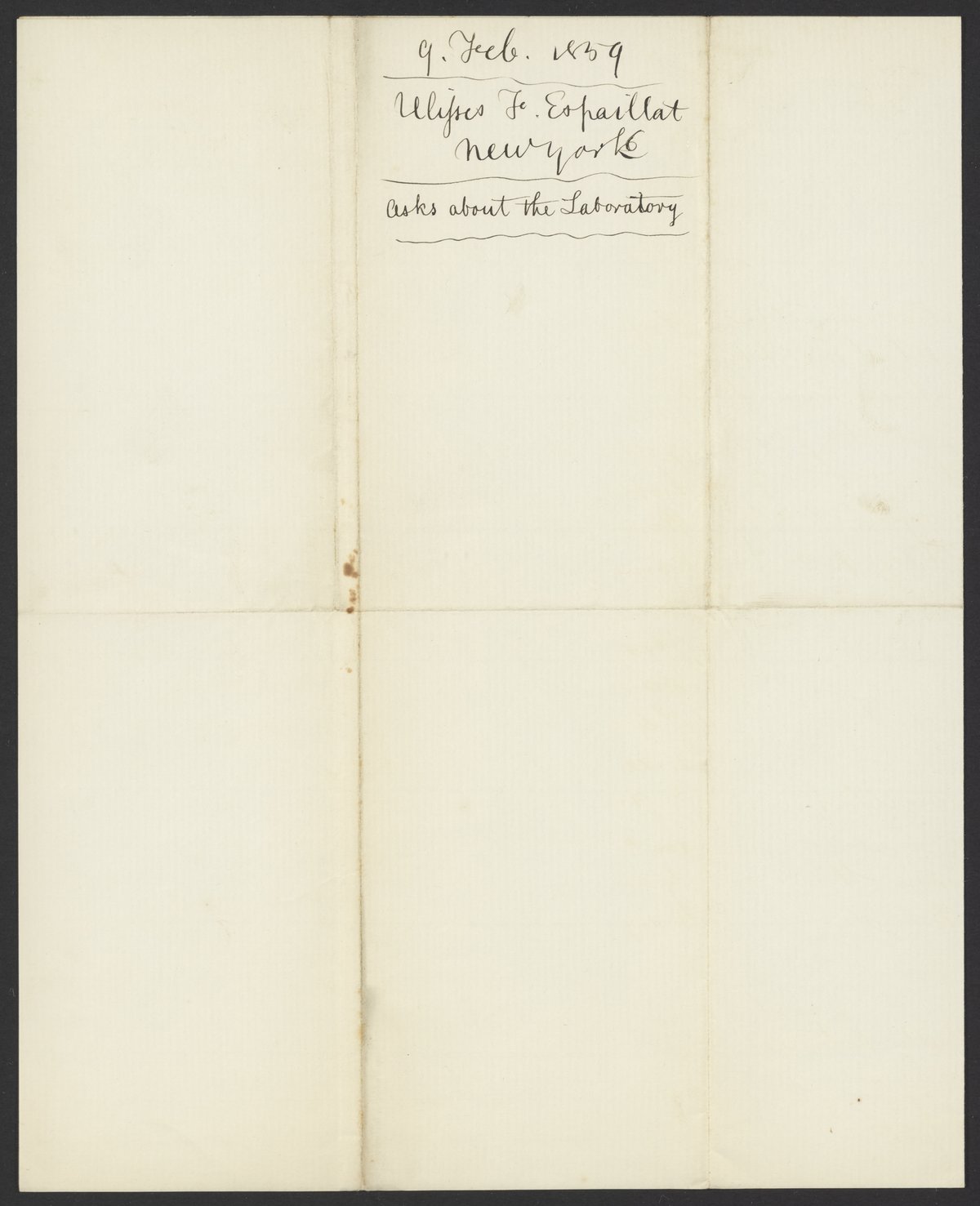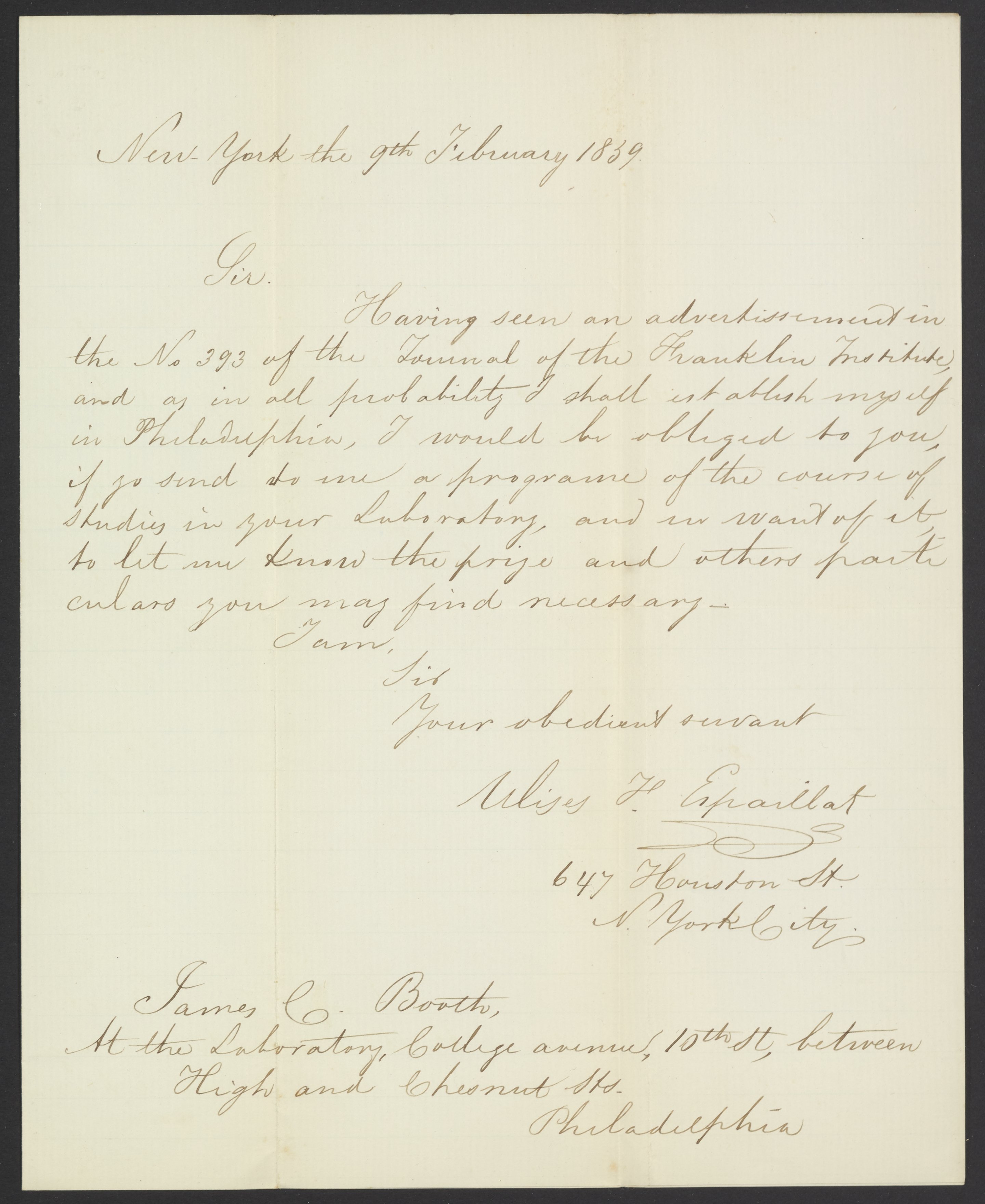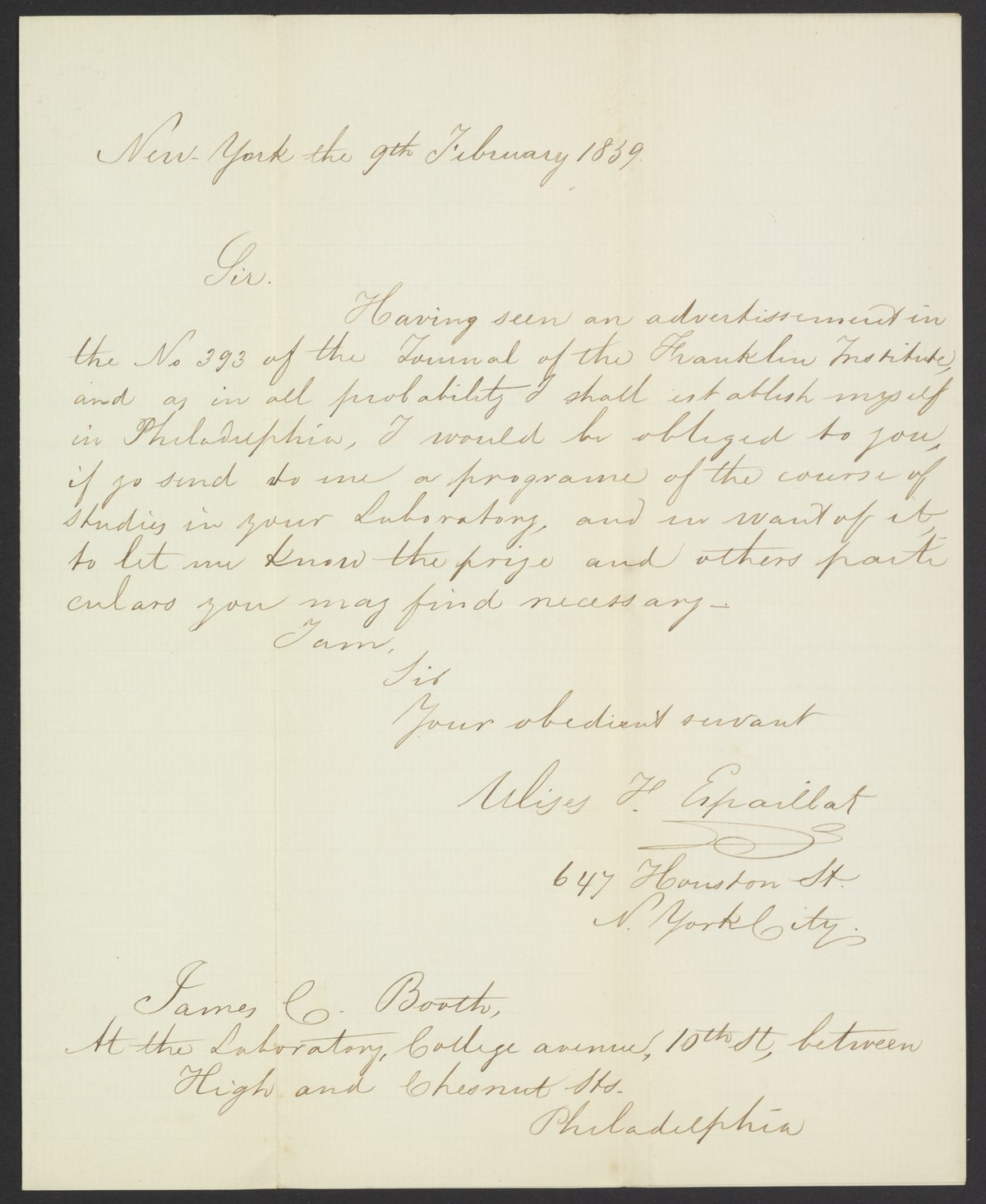 Letter from Ulises F. Espaillat to James Curtis Booth, February 9, 1859