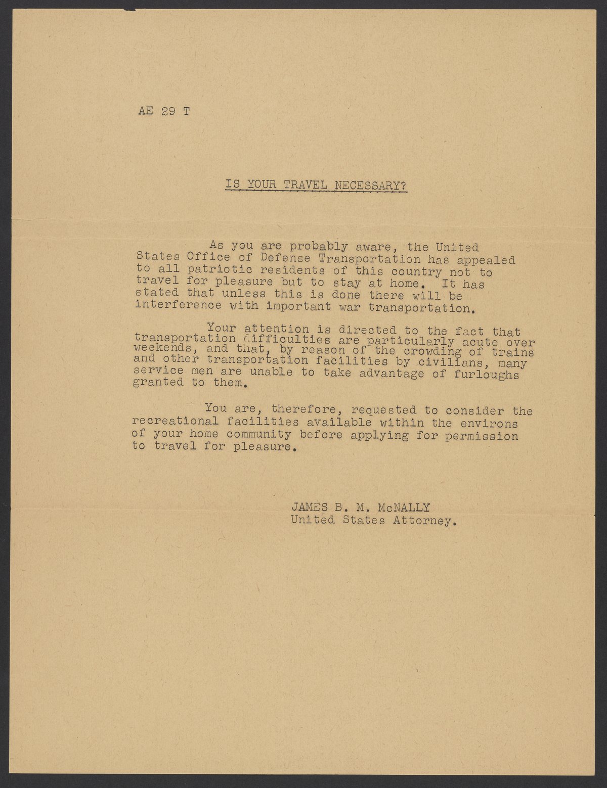 McNally, James B. M. “Is Your Travel Necessary?,” 1943. Papers of Georg and Max Bredig, Box 7, Folder 27. Science History Institute. Philadelphia. https://digital.sciencehistory.org/works/rugzh4g.