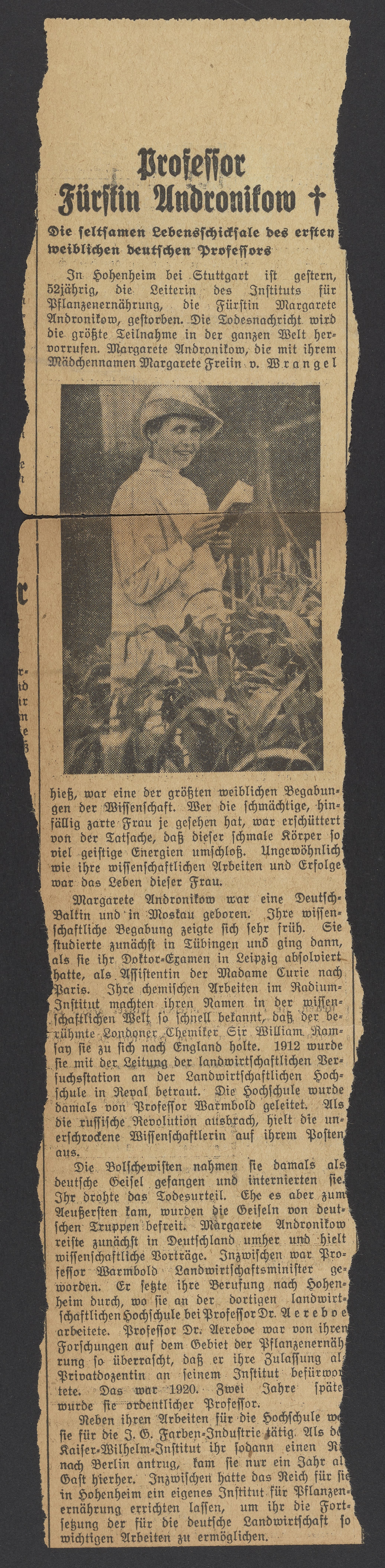 An article written about Margarete von Wrangell (1877-1932). Wrangell was an agricultural chemist and known as Germany's first female full professor in German. While she was alive Wrangell was a very successful scientist, her life and scientific work became well known after her death when, in 1935, her biography was published. Wrangell has become a feminist figure and her life is studied by women and gender studies. In 1928 Wrangell married her childhood friend Prince Vladimir Andronikov.