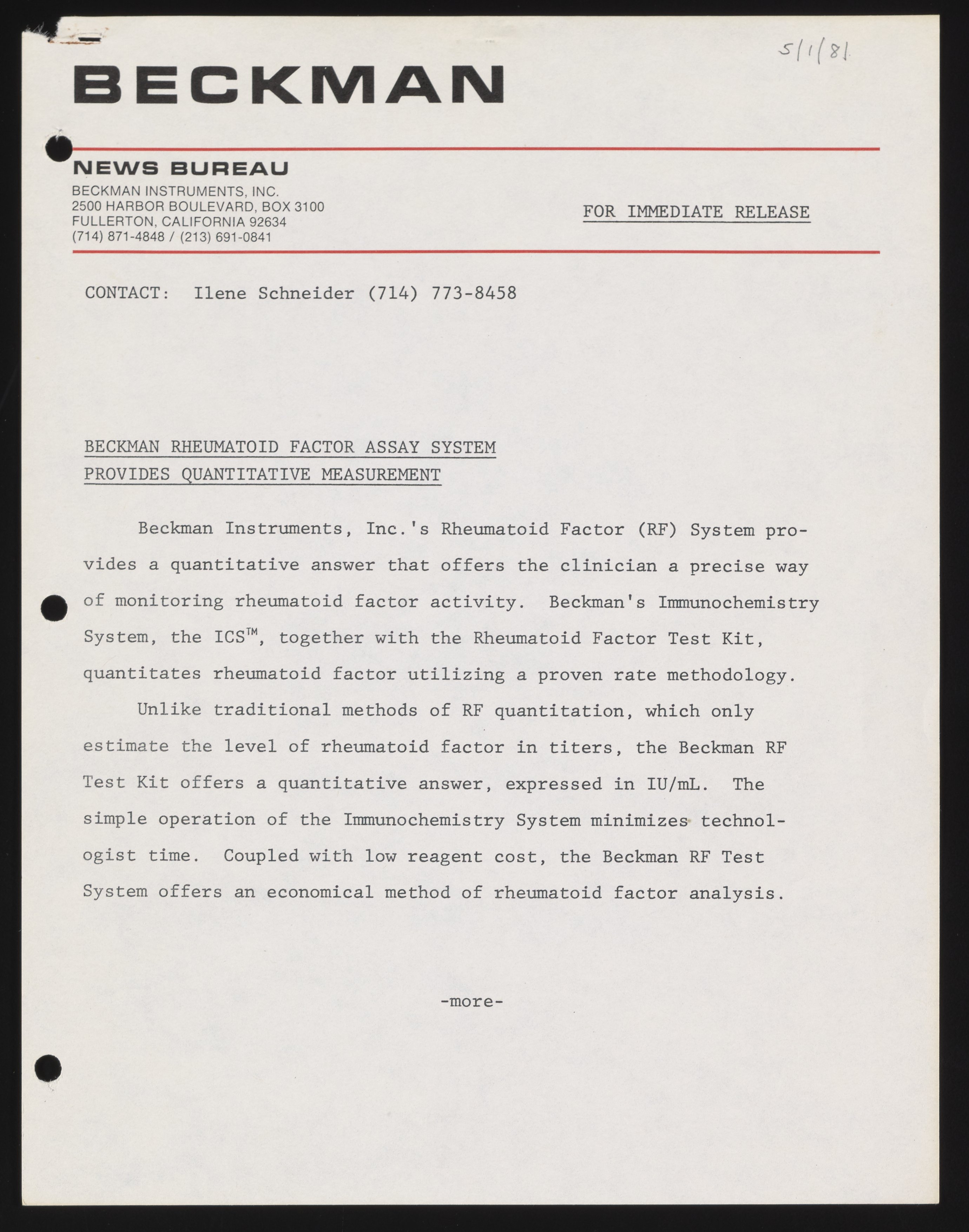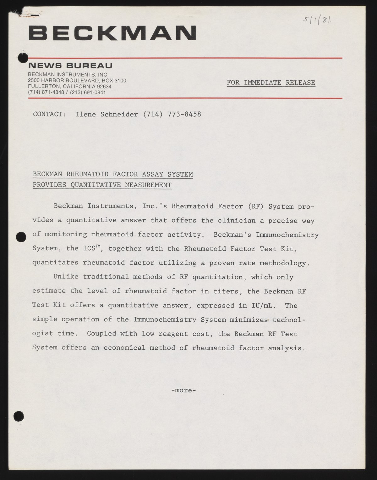 Schneider, Ilene. “Beckman Rheumatoid Factor Assay System Provides Quantitative Measurement,” May 1, 1981. Beckman Historical Collection, Box 58, Folder 69. Science History Institute. Philadelphia. https://digital.sciencehistory.org/works/rv042t55x.