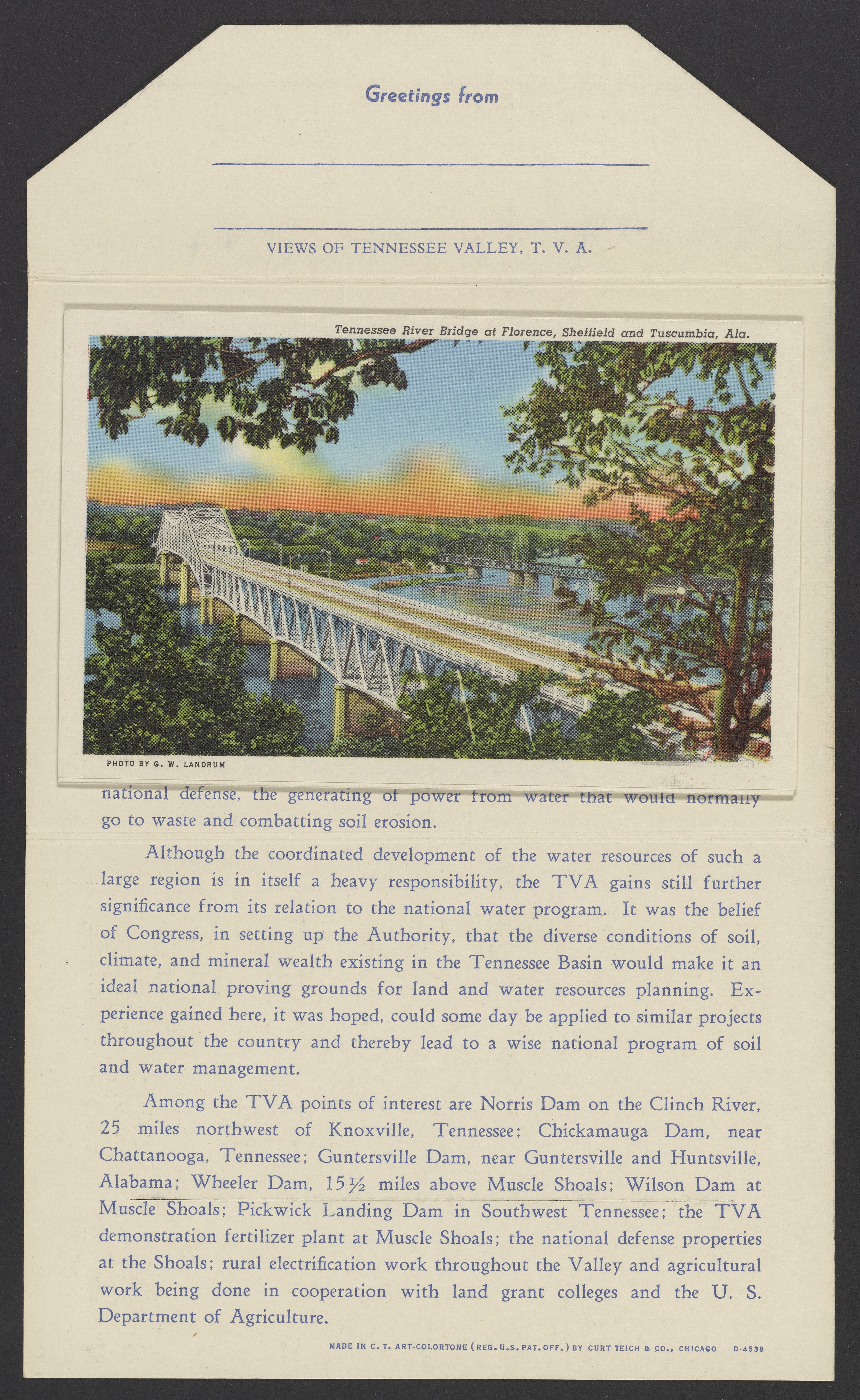 Small JPG1200 x 846px — 243 KBLarge JPG2880 x 2030px — 2.0 MBFull-sized JPG3974 x 2801px — 3.5 MBOriginal fileTIFF — 3974 x 2801px — 31.9 MBLetterpress halftone postcard collection published by Curt Teich & Co. Depicts views of Tennessee and projects by the Tennessee Valley Authority (TVA) including sights such as dams, the TVA Freeway, and model homes in Norris, Tennessee.
