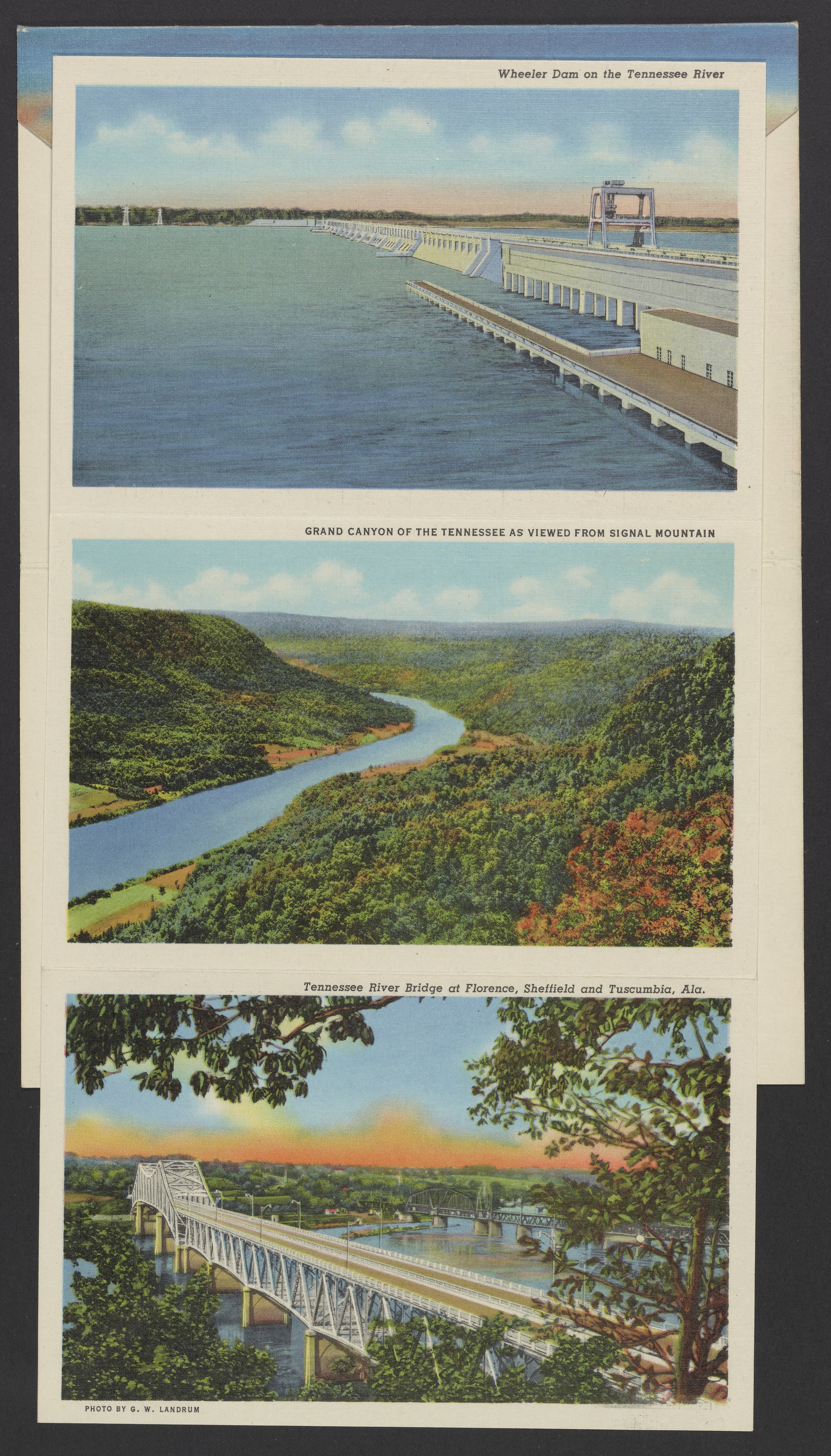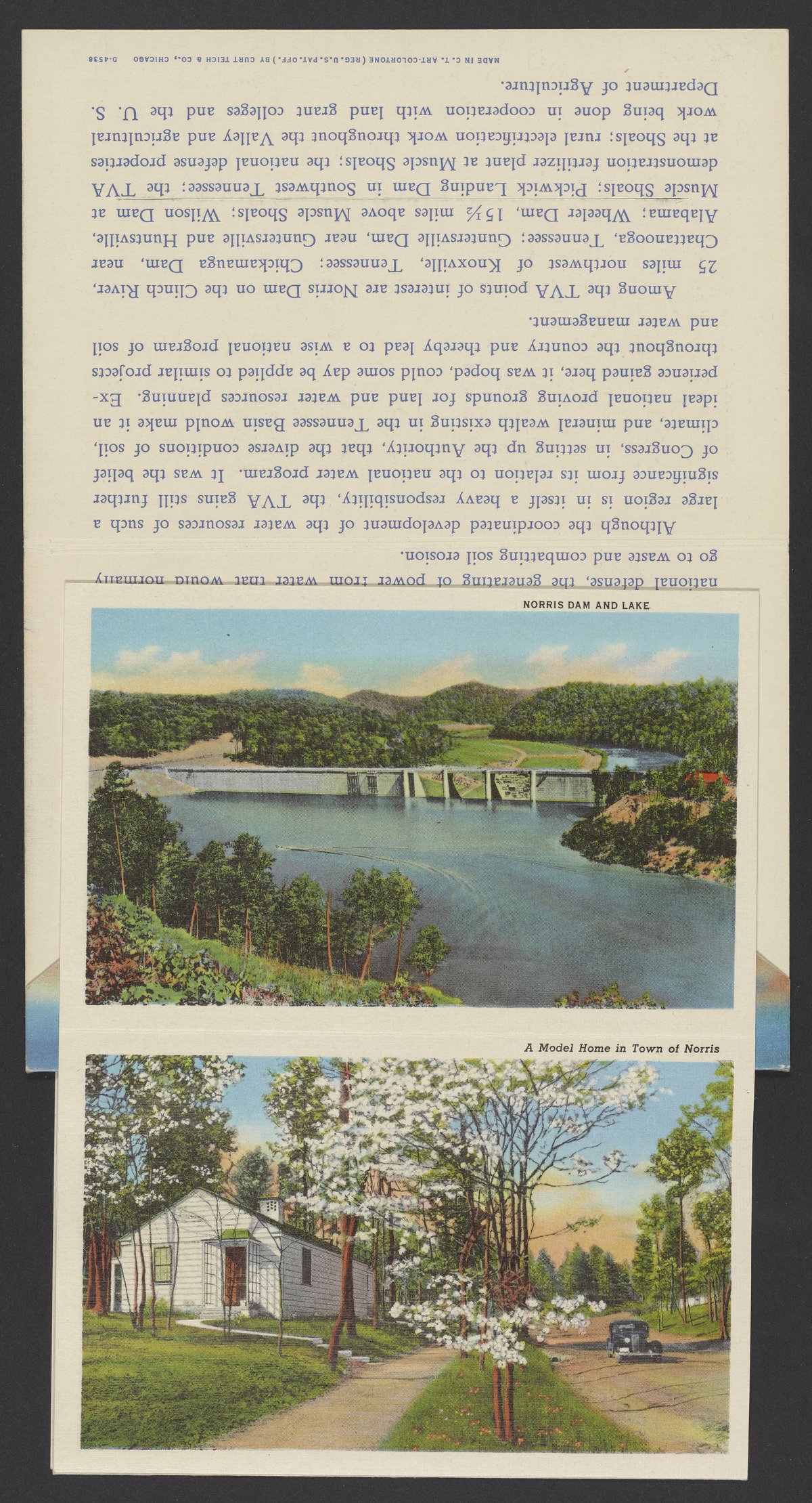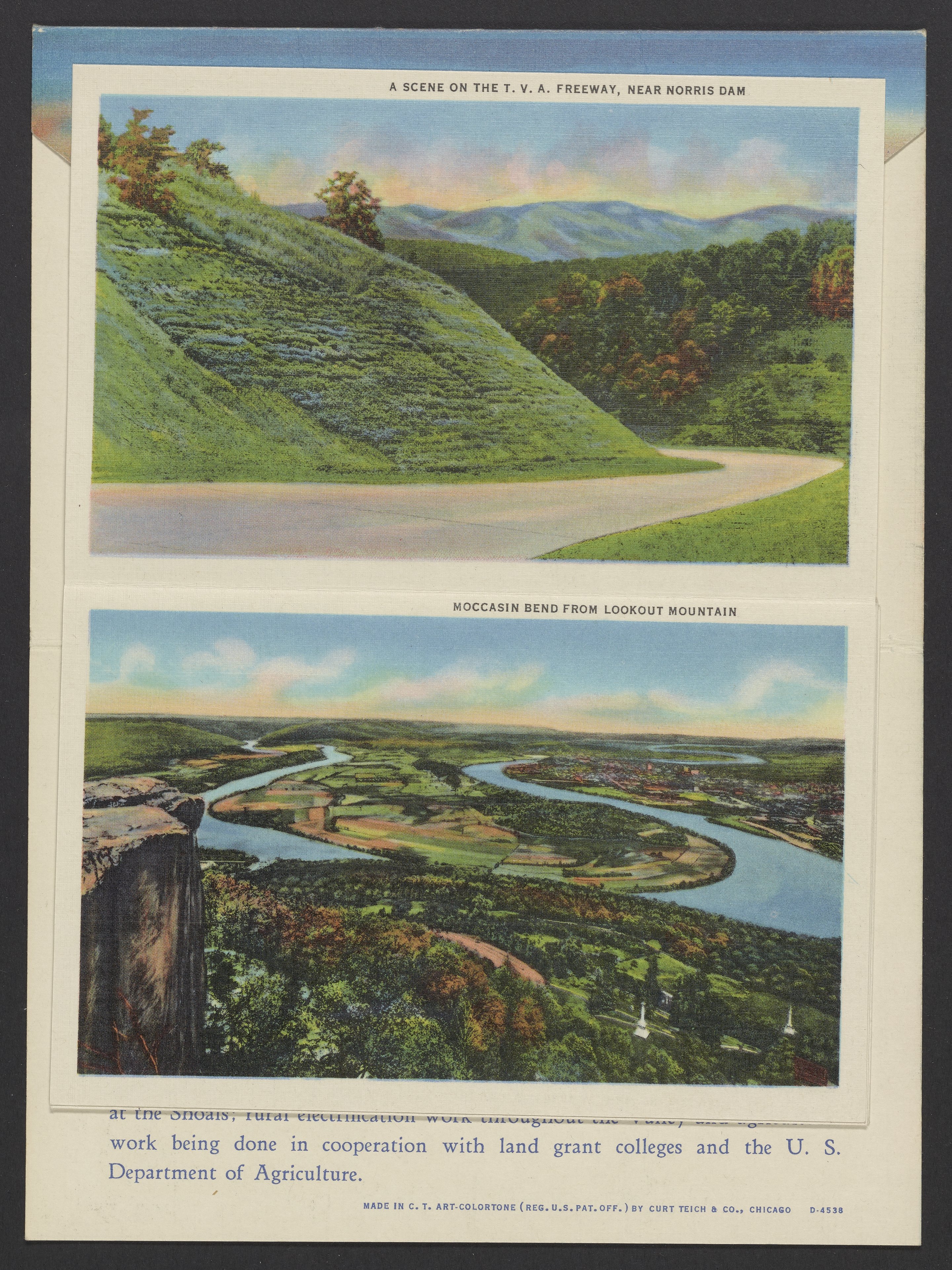 Small JPG1200 x 846px — 243 KBLarge JPG2880 x 2030px — 2.0 MBFull-sized JPG3974 x 2801px — 3.5 MBOriginal fileTIFF — 3974 x 2801px — 31.9 MBLetterpress halftone postcard collection published by Curt Teich & Co. Depicts views of Tennessee and projects by the Tennessee Valley Authority (TVA) including sights such as dams, the TVA Freeway, and model homes in Norris, Tennessee.