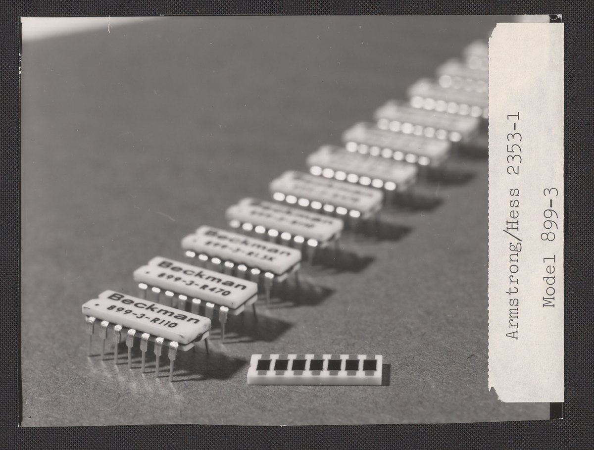 Armstrong & Hess. “Row of Beckman Model 899-1 Resistor Network Microcircuits,” 1950–1969. Beckman Historical Collection, Box 85. Science History Institute. Philadelphia. https://digital.sciencehistory.org/works/rx913q25d.