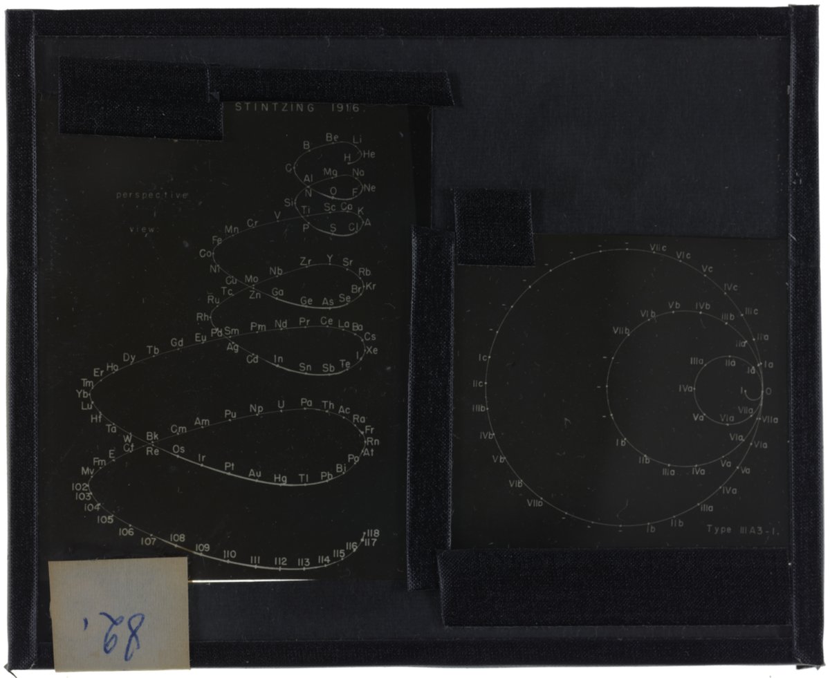 Stintzing, Hugo, and Edward G. Mazurs. “Periodic Table in Style of Helix Wound on Three Main Stepwise Cylinders.” Glass (material), circa 1916–1957. Edward G. Mazurs Collection of Periodic Systems Images, Box 1. Science History Institute. Philadelphia. https://digital.sciencehistory.org/works/rx913q554.