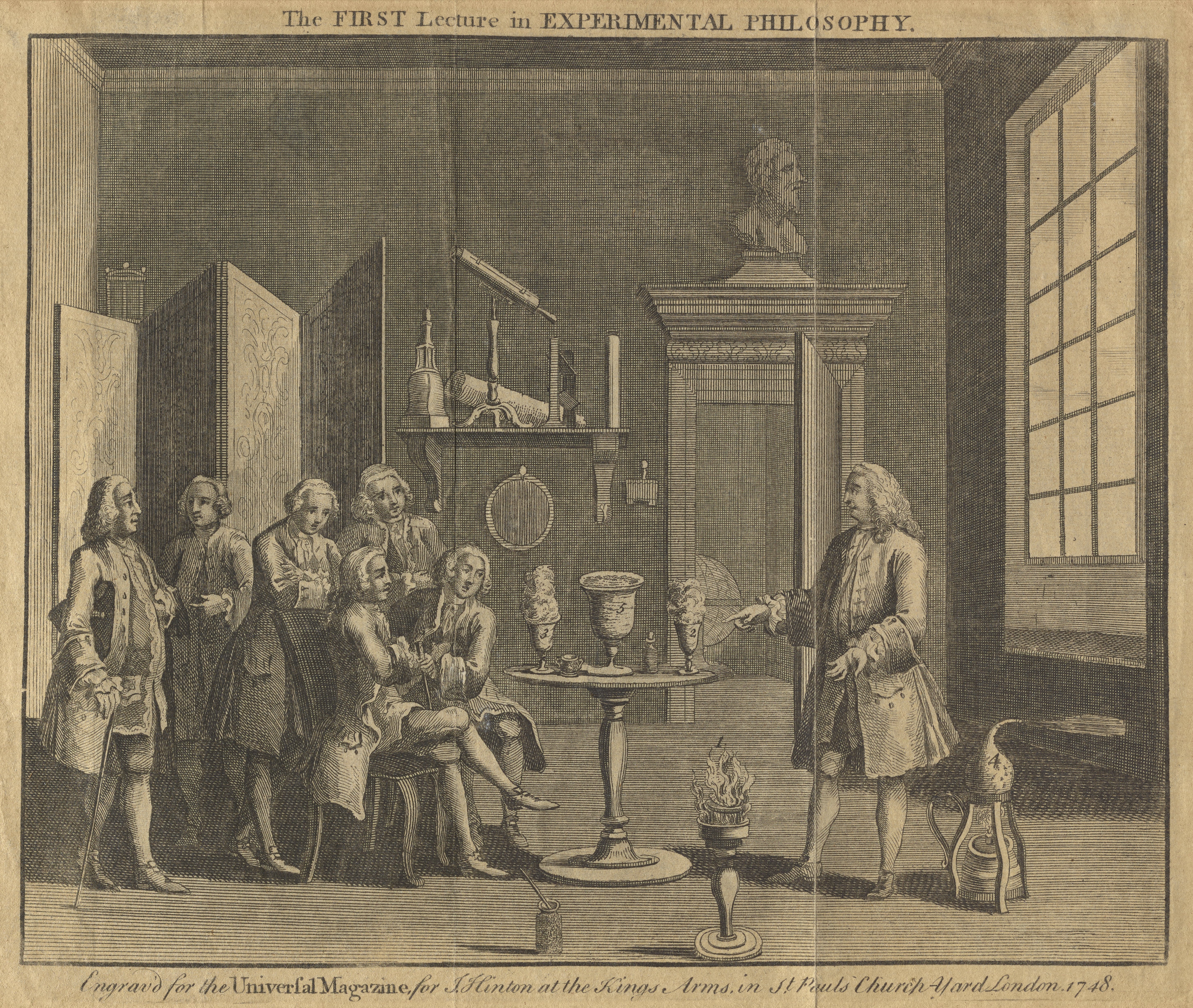 The full text above and below the image of this print reads, "The First Lecture in Experimental Philosophy. / Engraved for the Universal Magazine, for J. Hinton at the King's Arms in St. Paul's Church-Yard London. 1748." The print shows a demonstration lecture given to a group of nobly-dressed gentlemen, with chemical apparatus on the table and floor and astronomical and other instruments on the back shelf. The scene may depict French clergyman and physicist Jean-Antoine Nollet (1700-1770), known as Abbé Nollet, who was the first professor of experimental physics at the University of Paris.