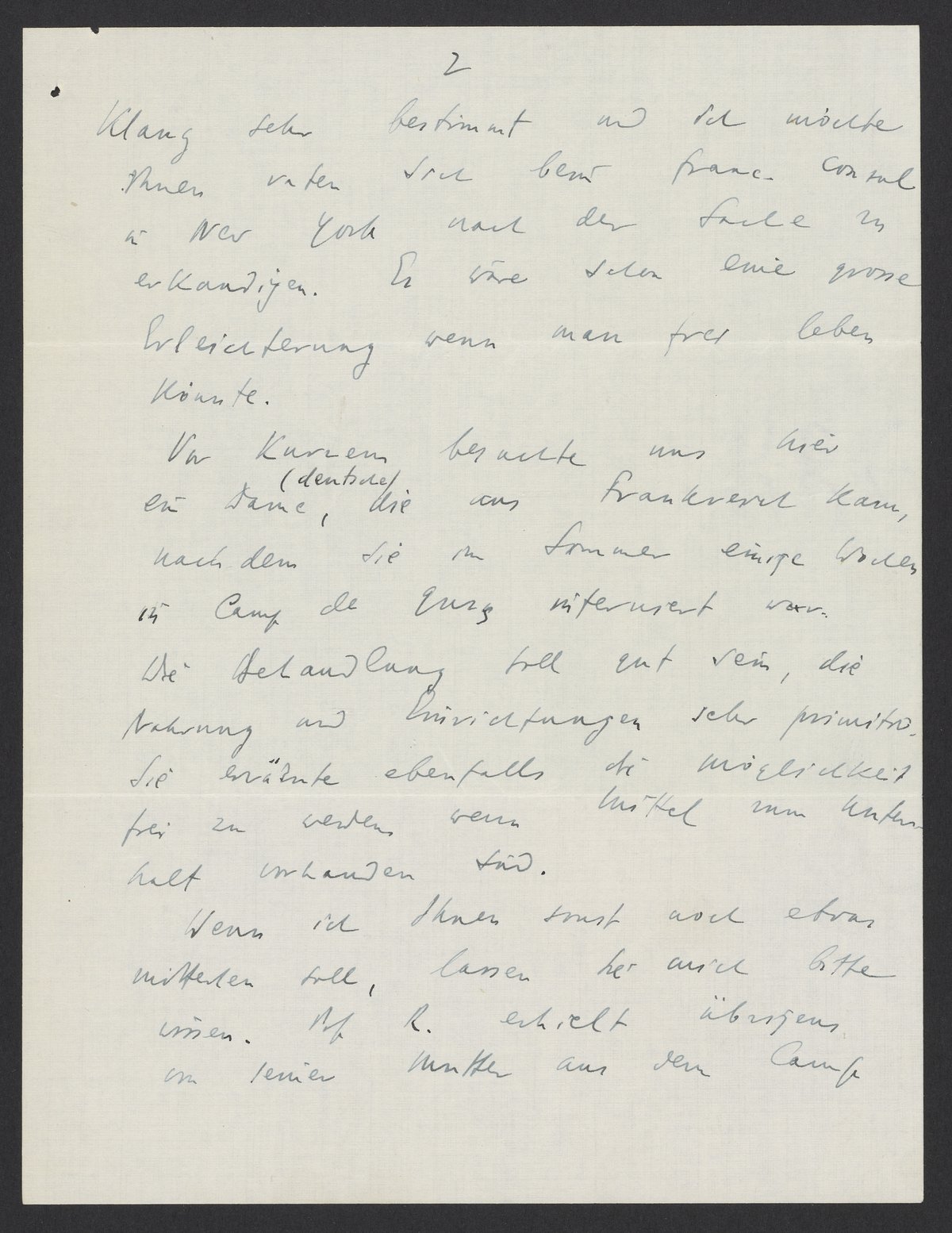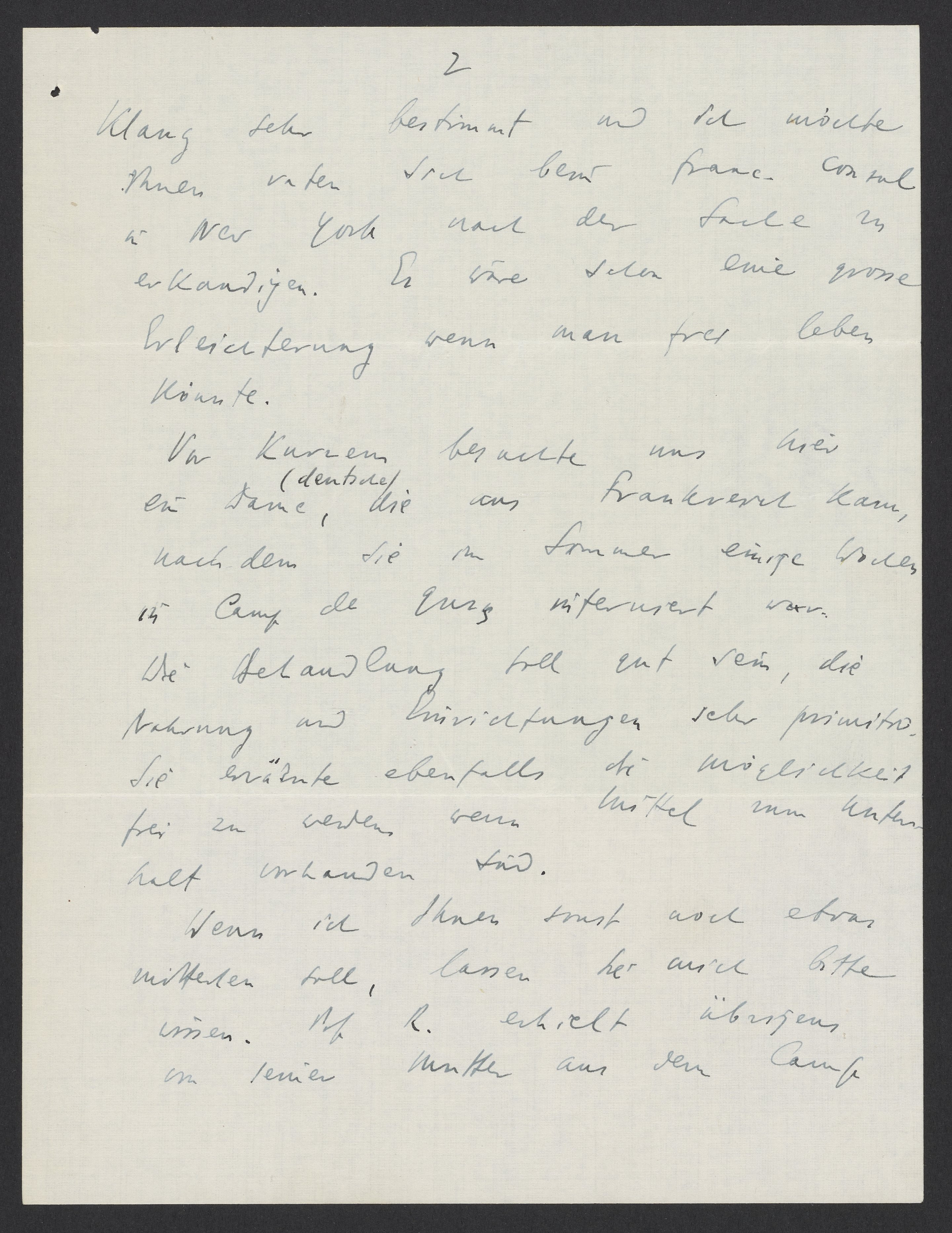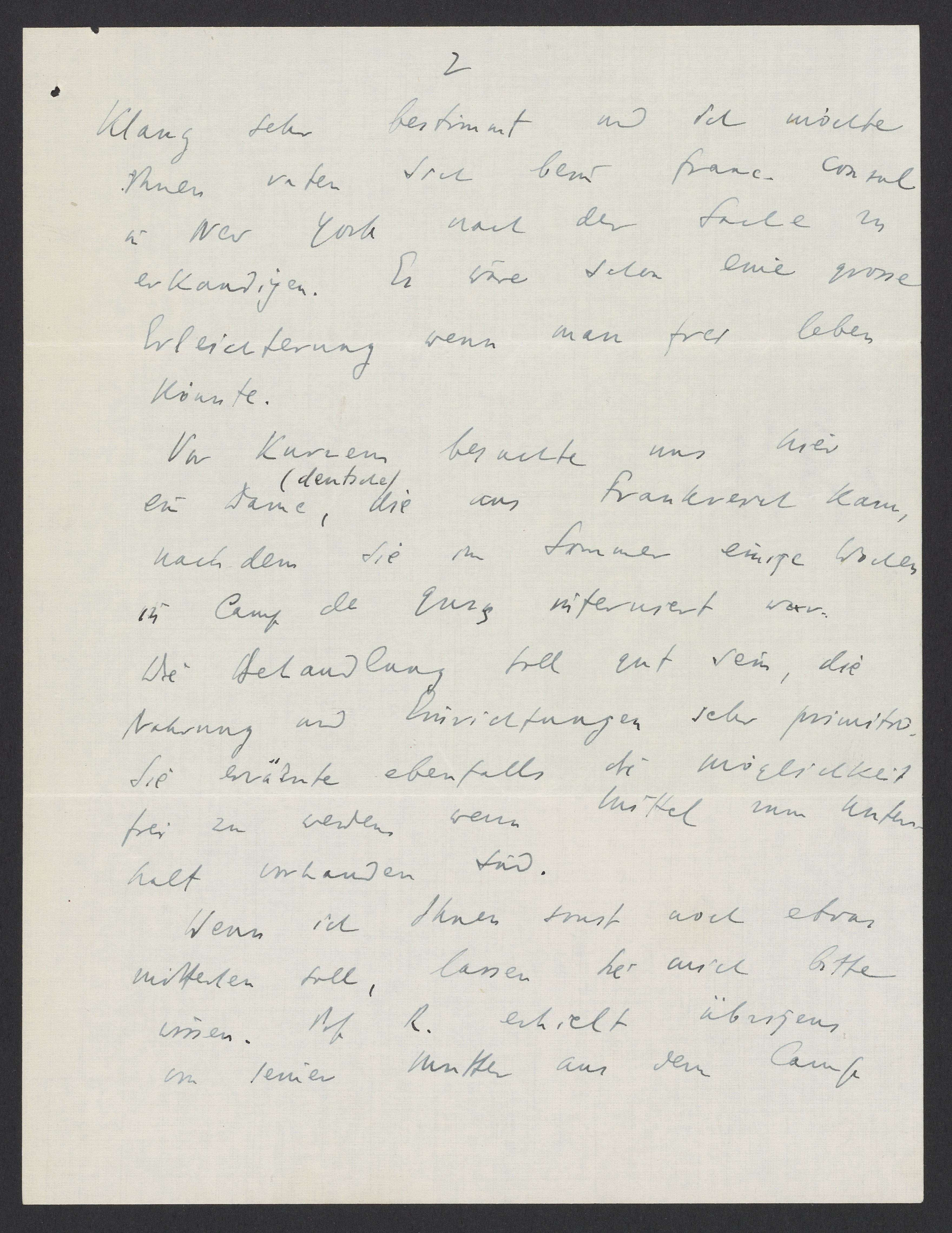 Vor kurzem besuchte uns hier eine deutsche Dame, die aus Frankreich kam, nachdem Sie im Sommer einige Wochen in Camp de Gurs interniert war. Die Behandlung soll gut sein, die Nahrung und Einrichtungen sehr primitiv. Sie erwähnte ebenfalls die Möglichkeit frei zu werden, wenn Mittel zum Unterhalt vorhanden sei.