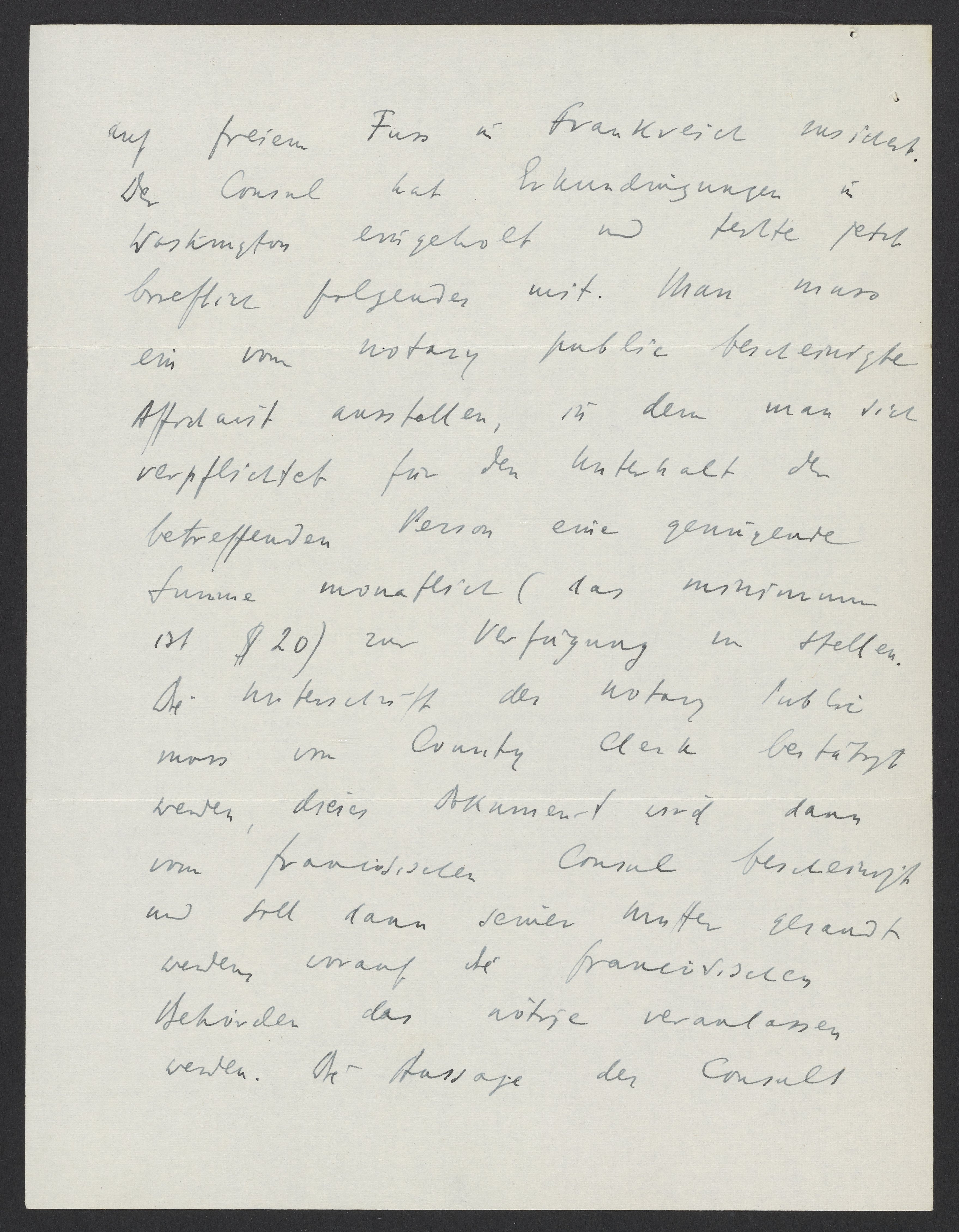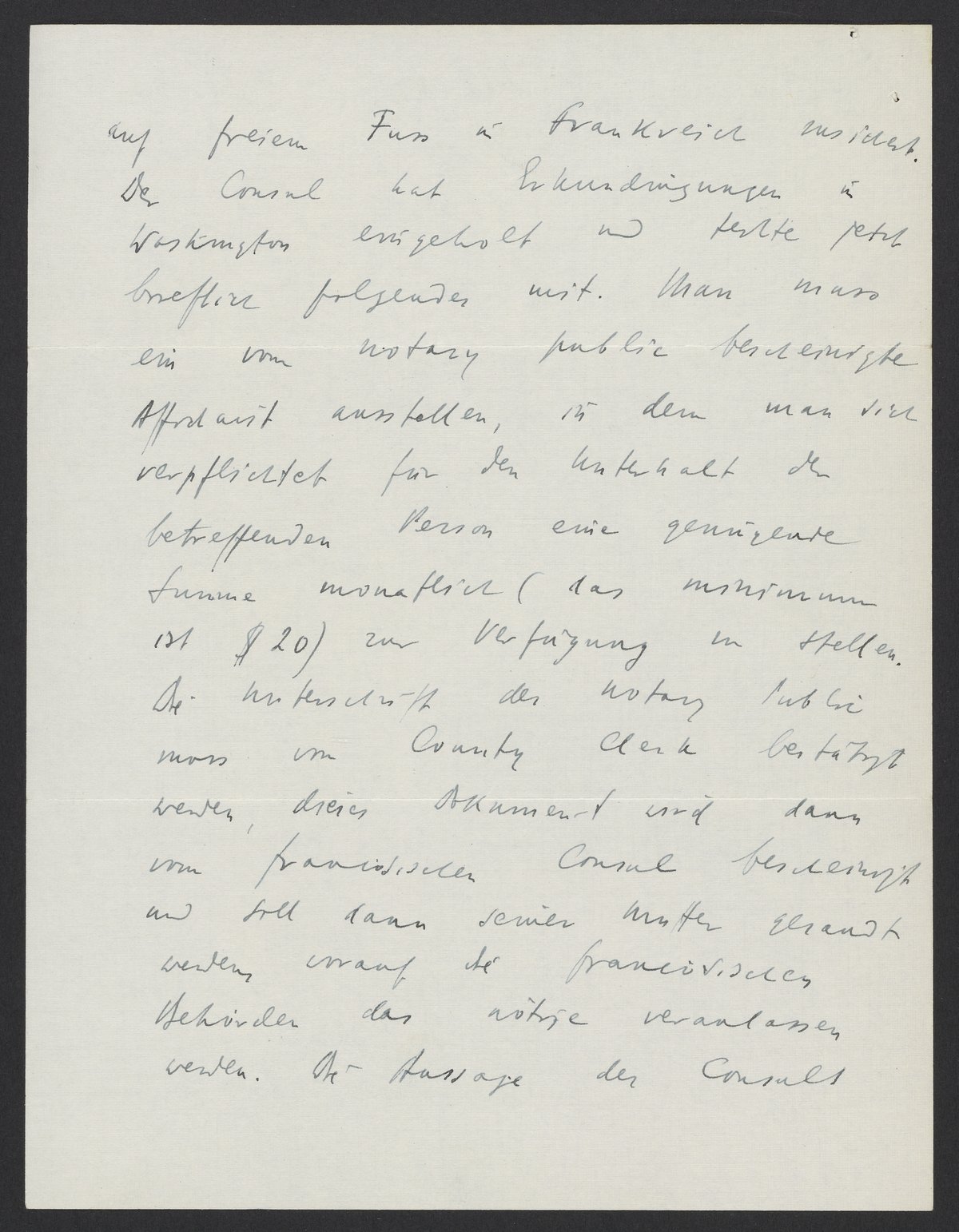 auf freiem Fuss in Frankreich zusichert. Der Consul hat Erkundigungen in Washington eingeholt und teilte auch ihm brieflich folgendes mit. Mann muss ein von notary public bescheinigte Affidavit ausfüllen, in den man sich verpflichtet für den Unterhalt der betreffenden Person eine genügende Summe monatlich (das Minimum ist $20) zur Verfügung zu stellen. Die Unterschrift des notary public muss von country clerk bestätigt werden. Dieses Dokument wird dann von französischen Consul bescheinigt und soll dann seiner Mutter gesandt werden, worauf die französischen Behörden das Nötige veranlassen werden. Die Aussage des Consuls