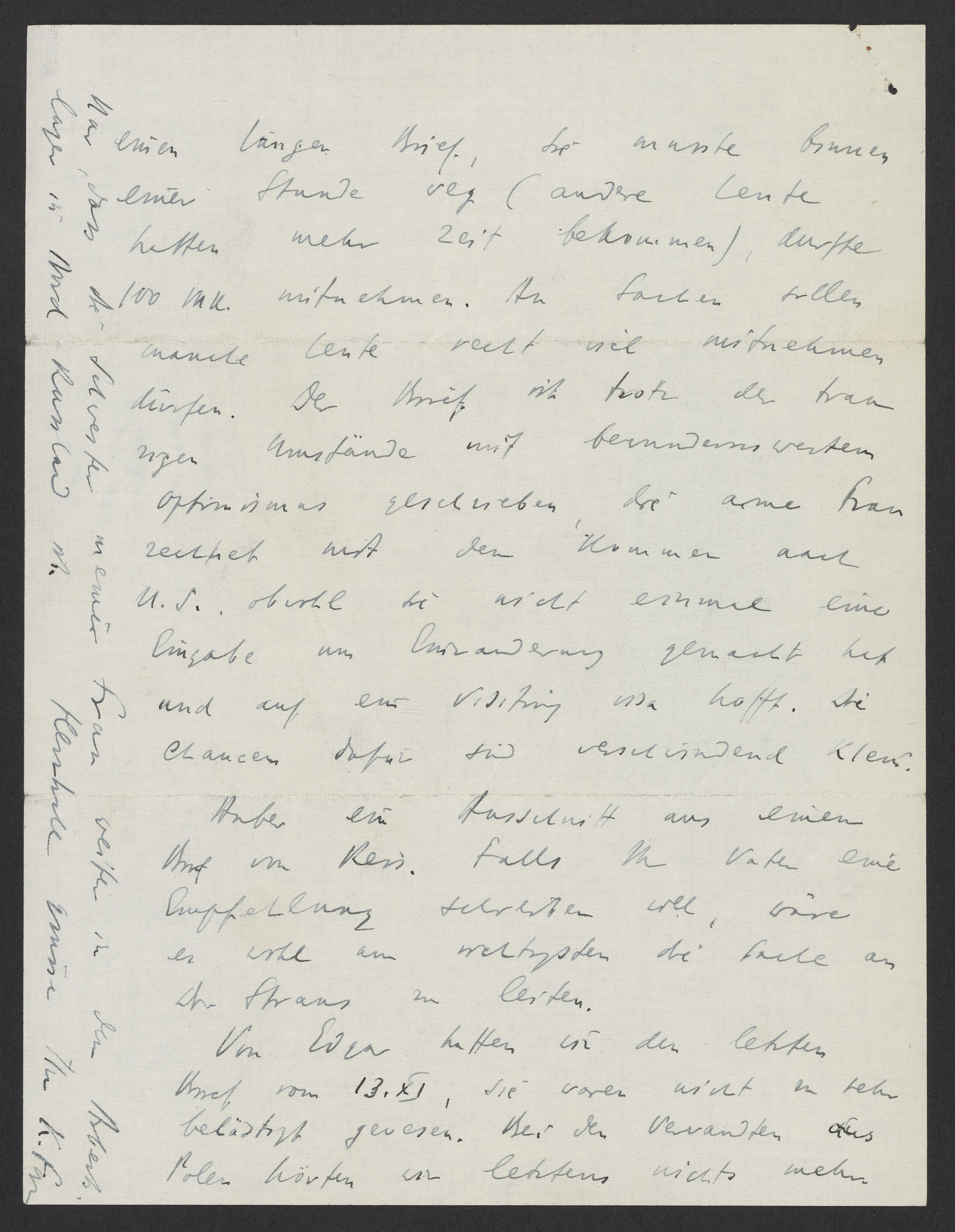 She had to leave within an hour (other people had been given more time) and was allowed to take 100 marks with her. Otherwise, many people are supposedly allowed to take quite a lot with them. The letter is written with remarkable optimism despite the sad circumstances. The poor woman is counting on coming to the U.S.A even though she doesn’t have an immigration application and is hoping for a visiting visa. The chances of that happening are pretty slim.