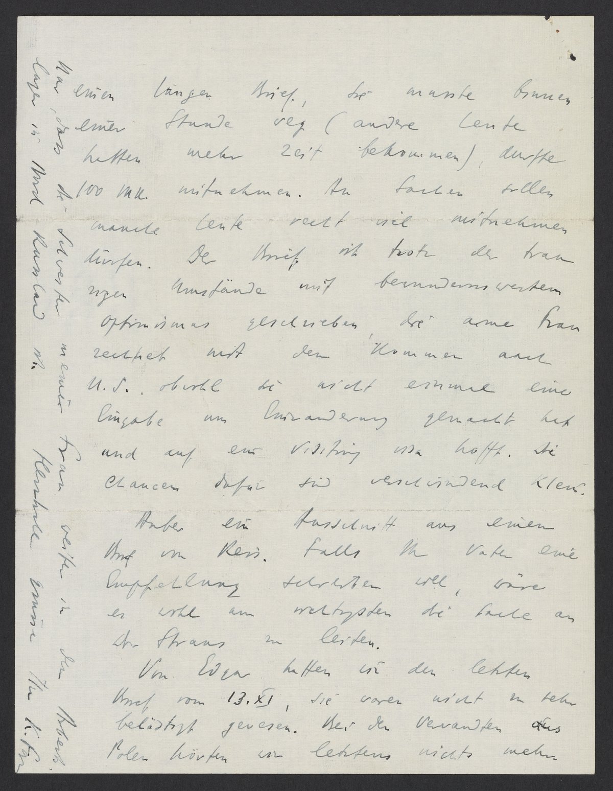 einen langen Brief. Sie musste binnen einer Stunde weg (andere Leute hatten mehr Zeit bekommen), durfte 100 Mk. mitnehmen. Ansonsten sollen manche Leute recht viel mitnehmen dürfen. Der Brief ist trotz der traurigen Umstände mit bemerkenswertem Optimismus geschrieben. Die arme Frau rechnet auf das Kommen nach U.S., obwohl sie nicht einmal eine Eingabe um Einwanderung hat und auf ein visiting visa hofft. Die Chancen dafür sind verschwindend klein.