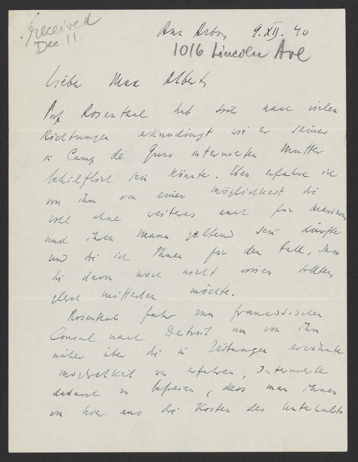 Prof. Rosenthal hat sich nach vielen Richtungen erkundigt wie er seine in Camp de Gurs internierten Mutter behilflich sein könnte. Eben erfahre ich von ihm von einer Möglichkeit die wohl ohne weiteres auch für Marianne und ihren Mann gelten sein dürfte und die ich Ihnen für den Fall, dass Sie dann noch nicht wissen sollten, gleich mitteilen möchte.
